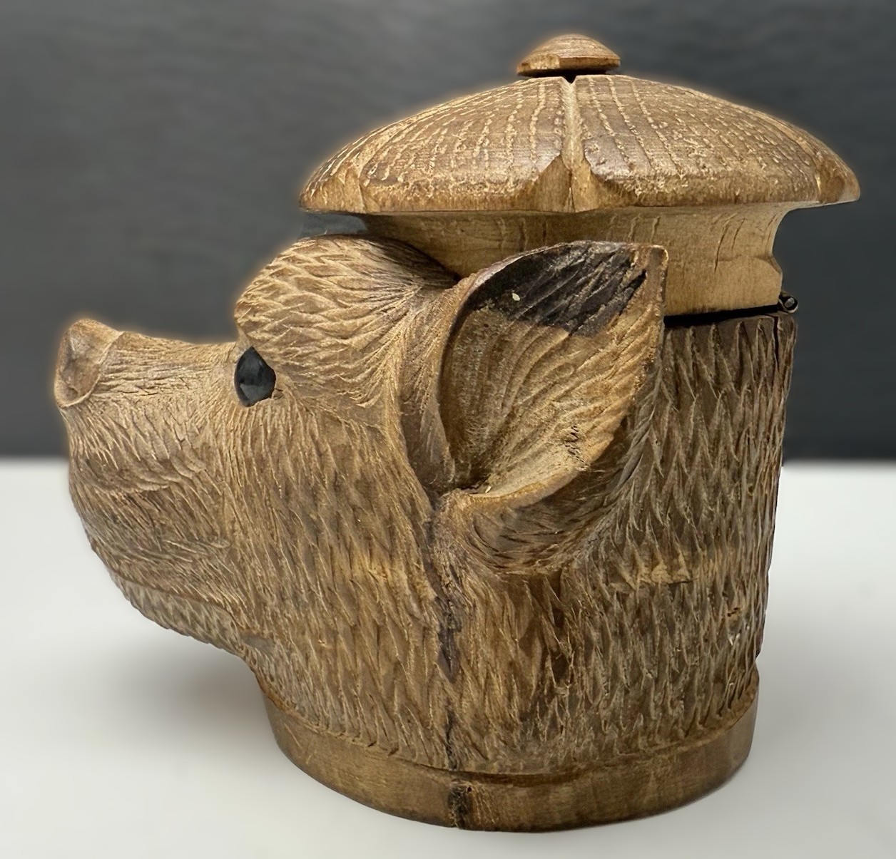- The head shape—particularly the relatively short snout, rounded forehead, and the general “fluffy” appearance of the carved fur—is consistent with the anthropomorphic bears that were a hallmark of Black Forest carving.