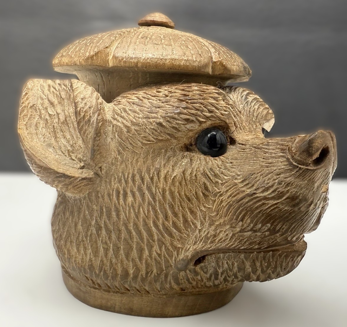 - Overall Form: A single figural inkwell carved as the bust of a bear wearing human clothing/accessories.