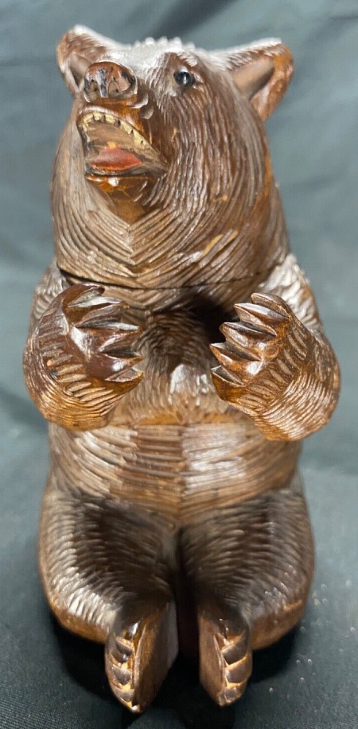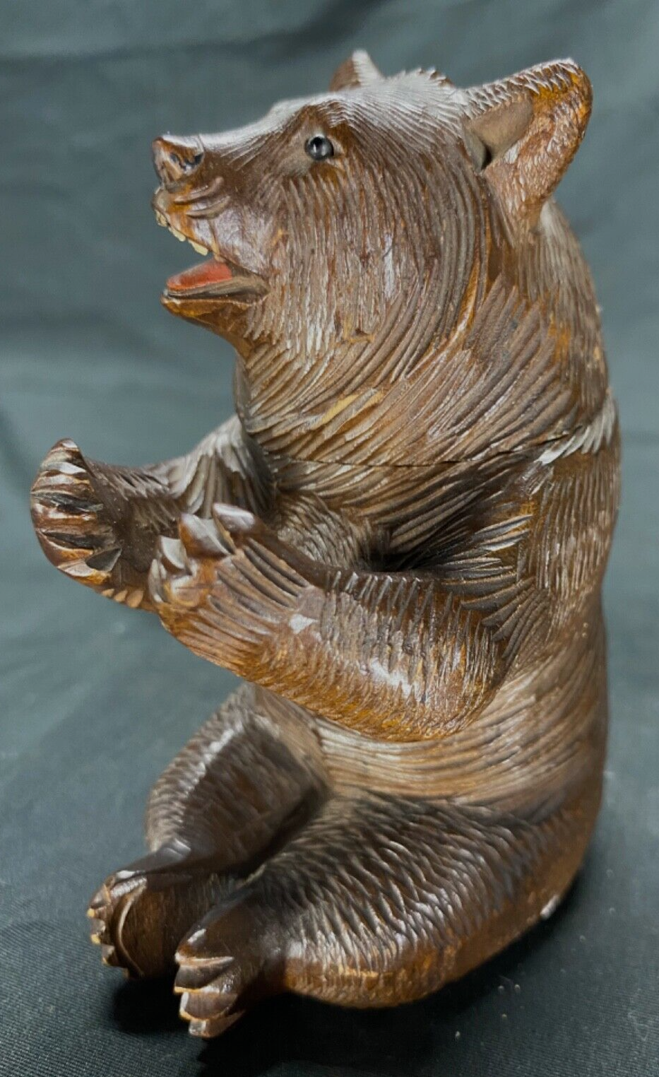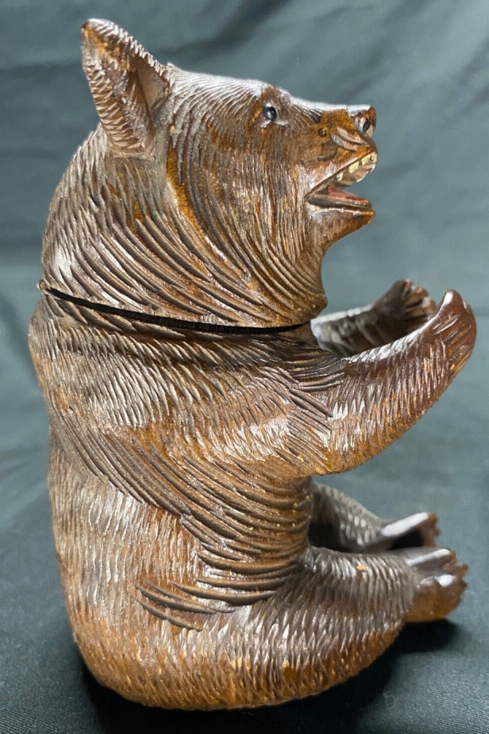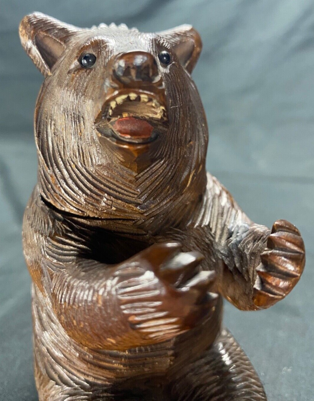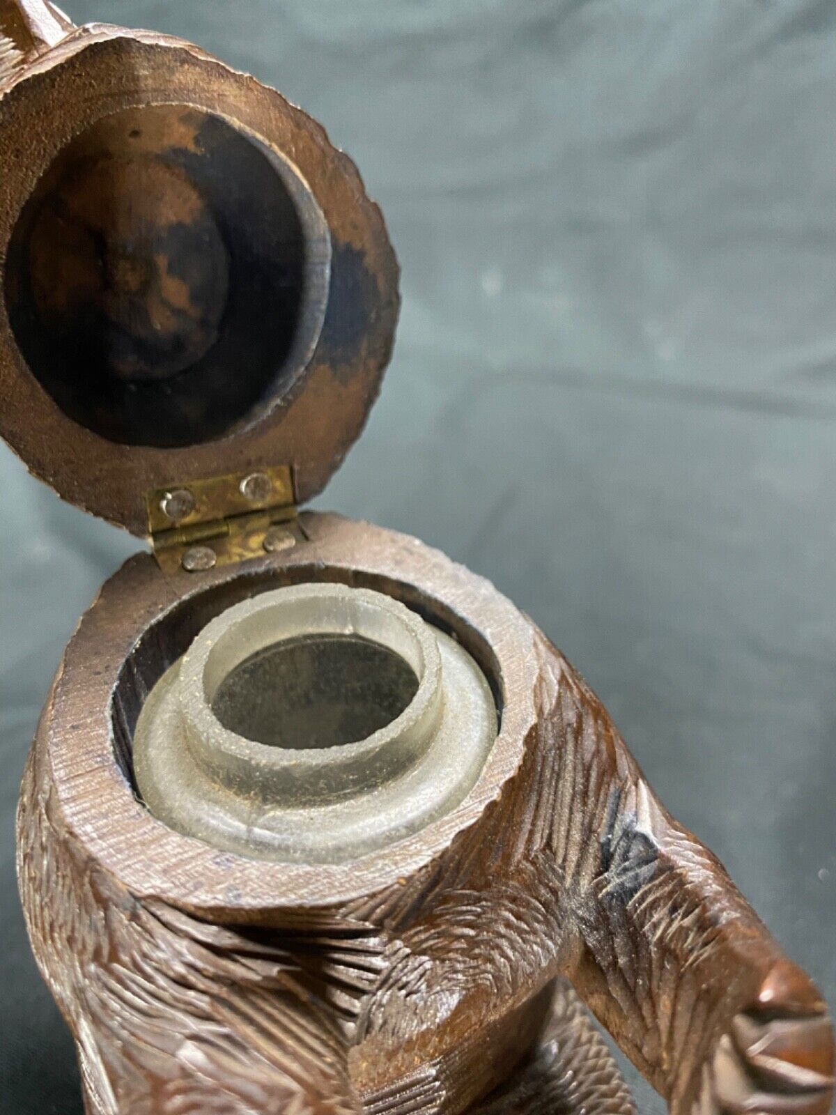 This detailed carving features a bear sitting with his paws extended to hold a pen. His head, detailed with glass eyes, red tongue and white teeth, is hinged, and opens to access the ink bottle.