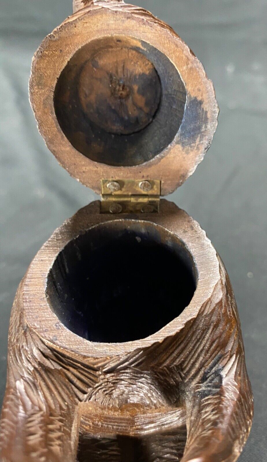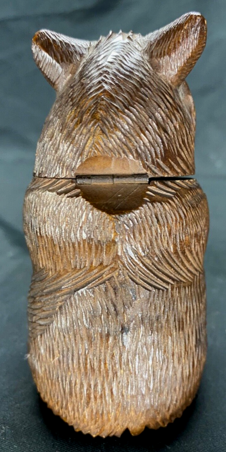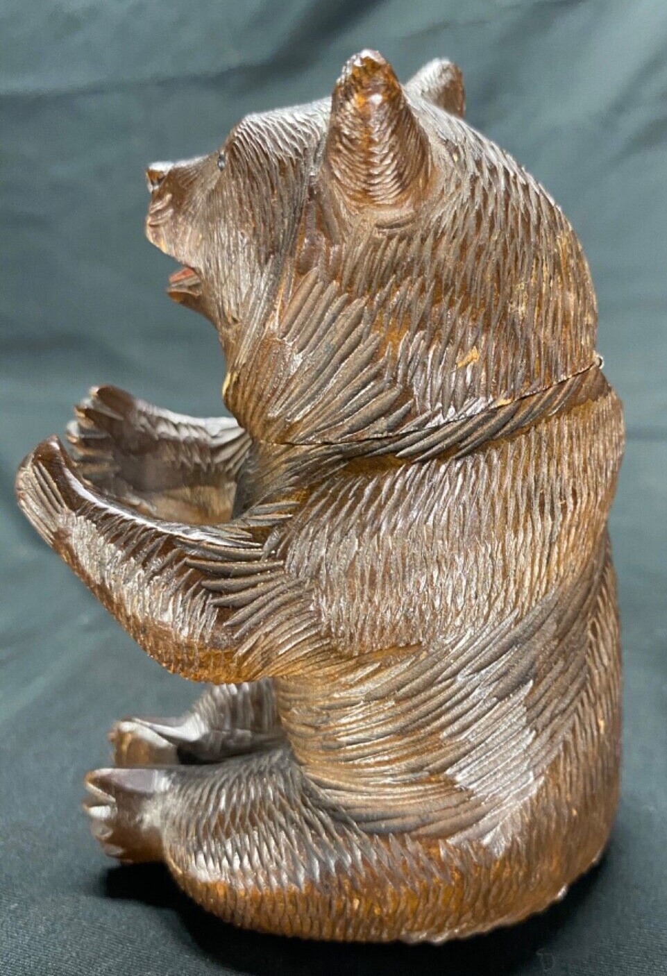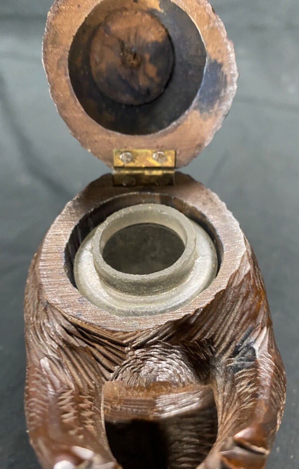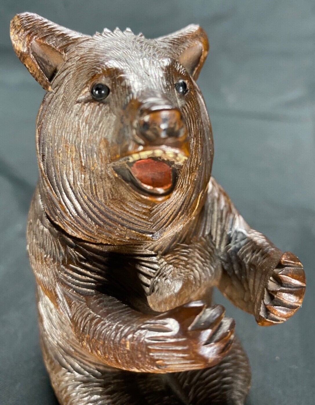This detailed carving features a bear sitting with his paws extended to hold a pen. His head, detailed with glass eyes, red tongue and white teeth, is hinged, and opens to access the ink bottle.