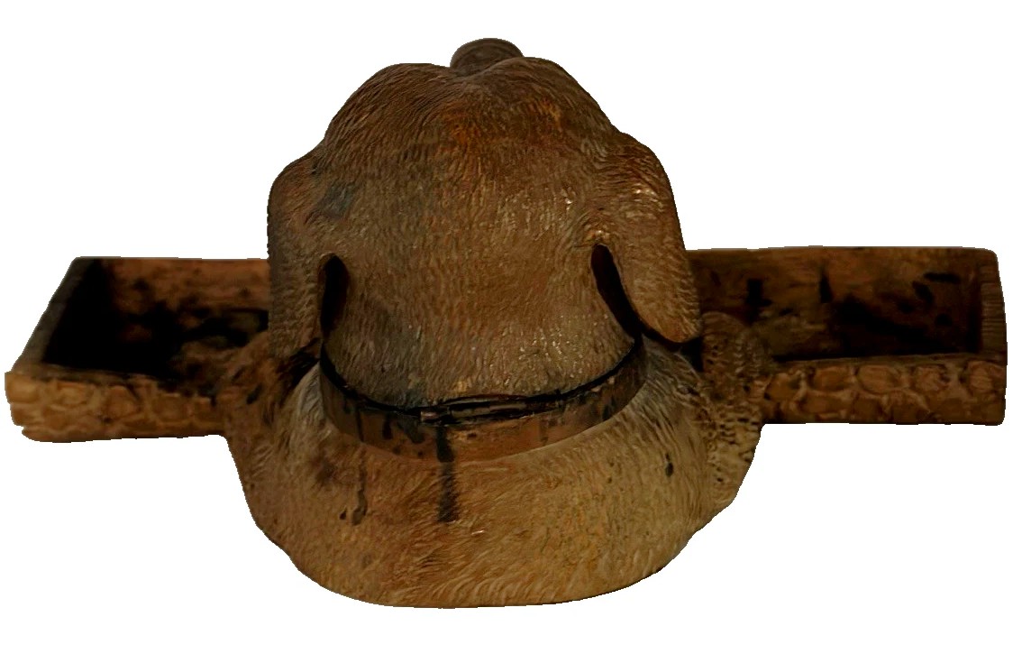 - The Base: The dog’s paws are “draped” over a base carved in the form of a hollowed log, which functions as a tray for holding dip pens or other small desk accessories.