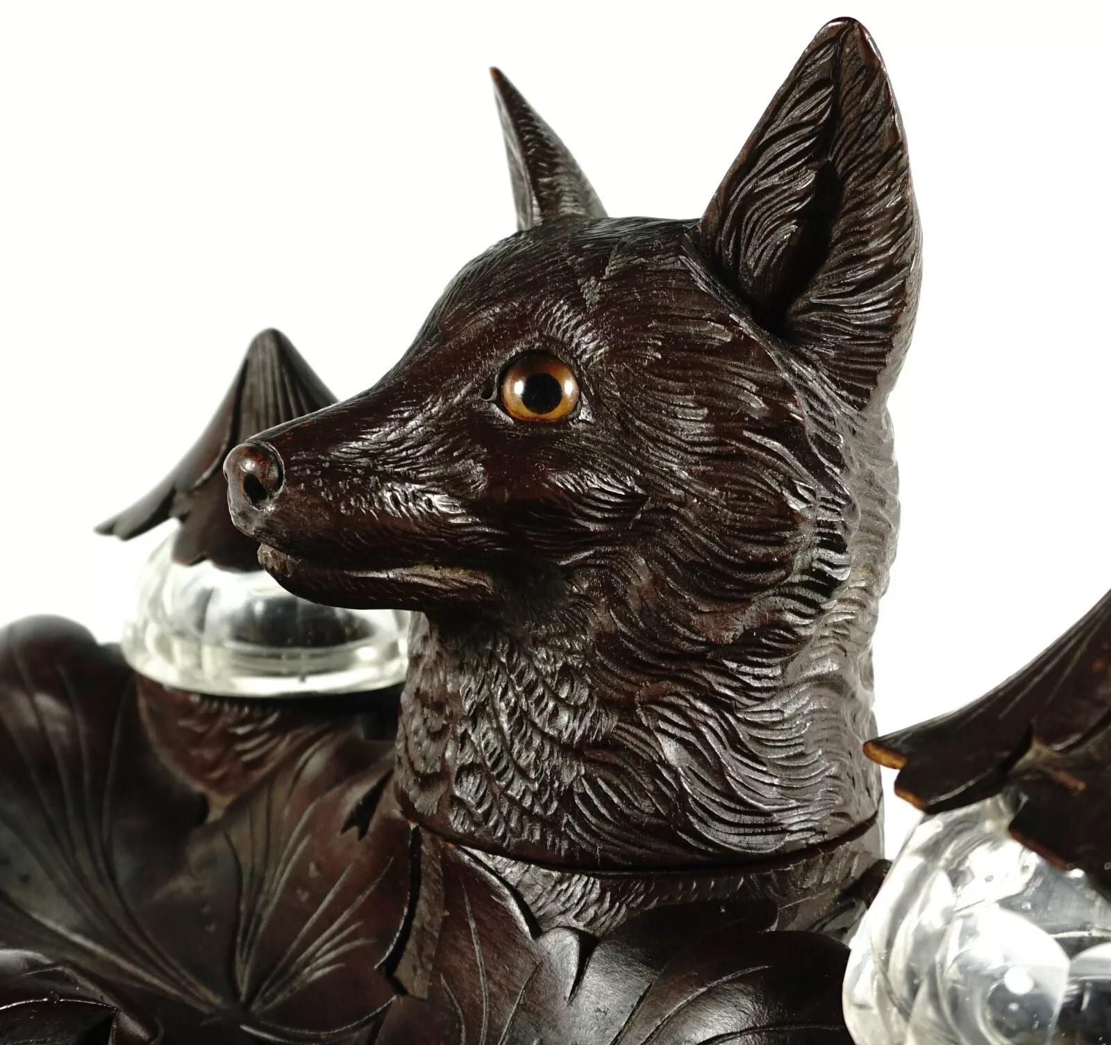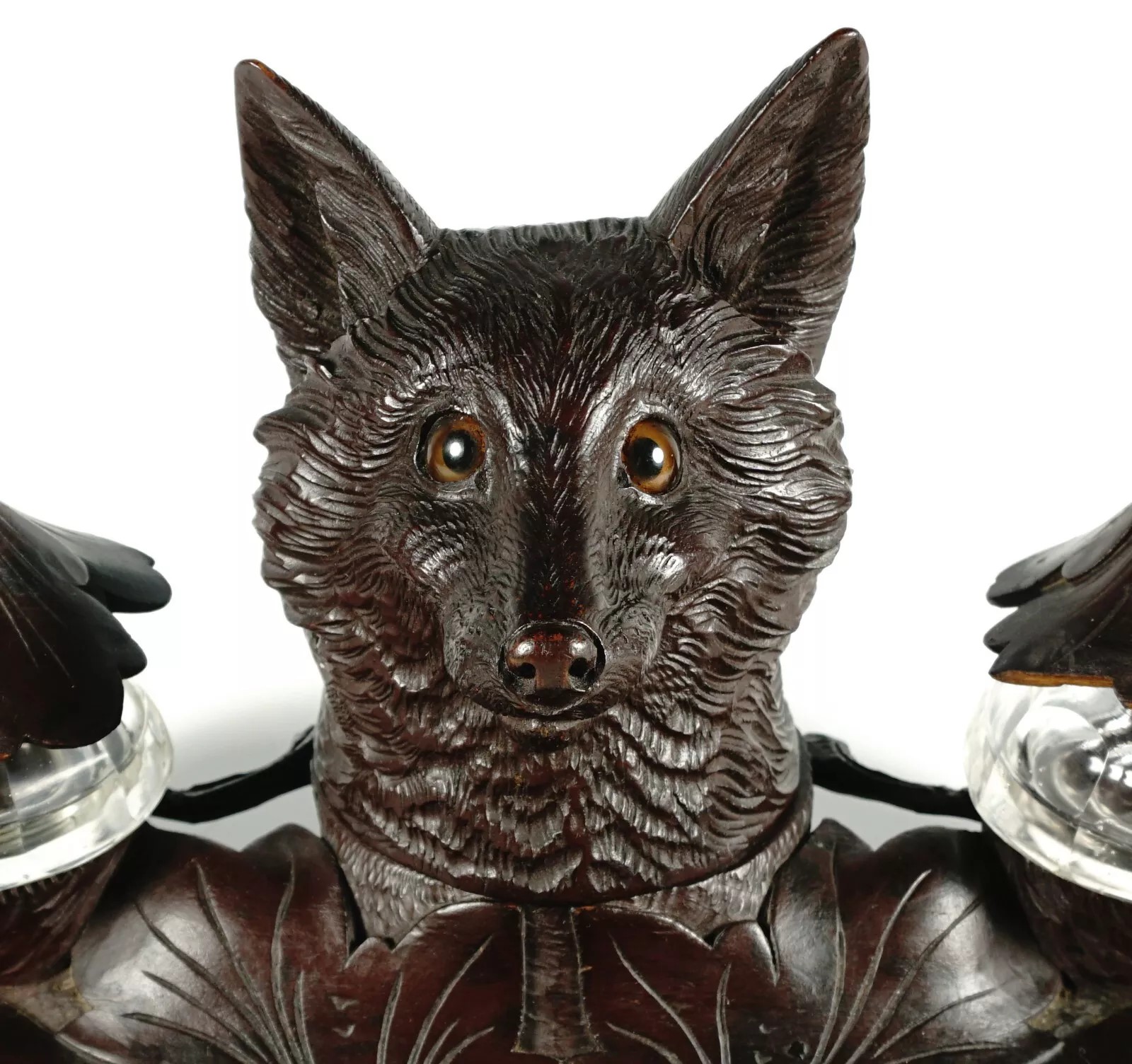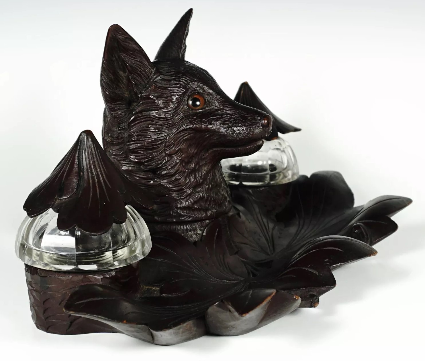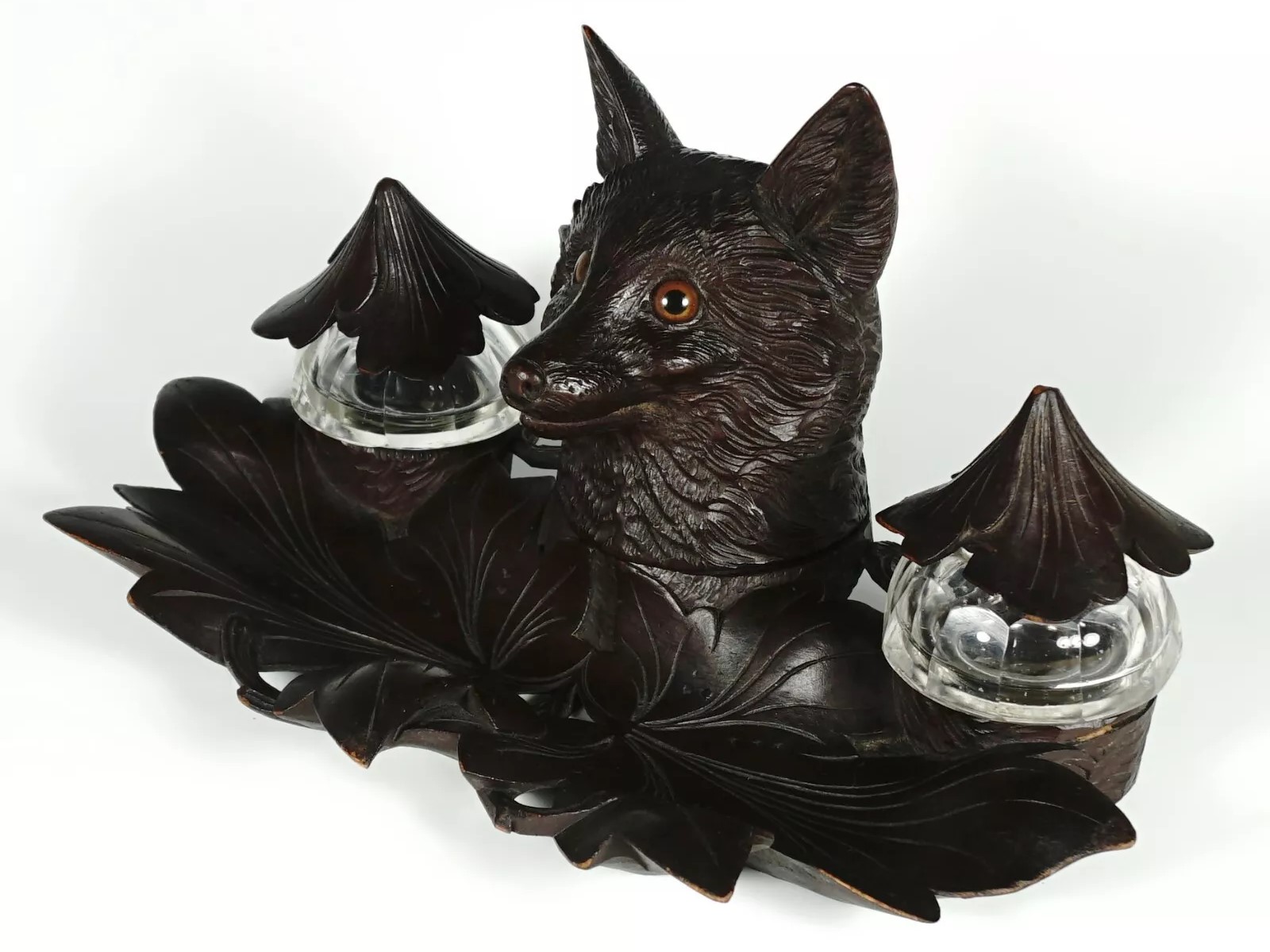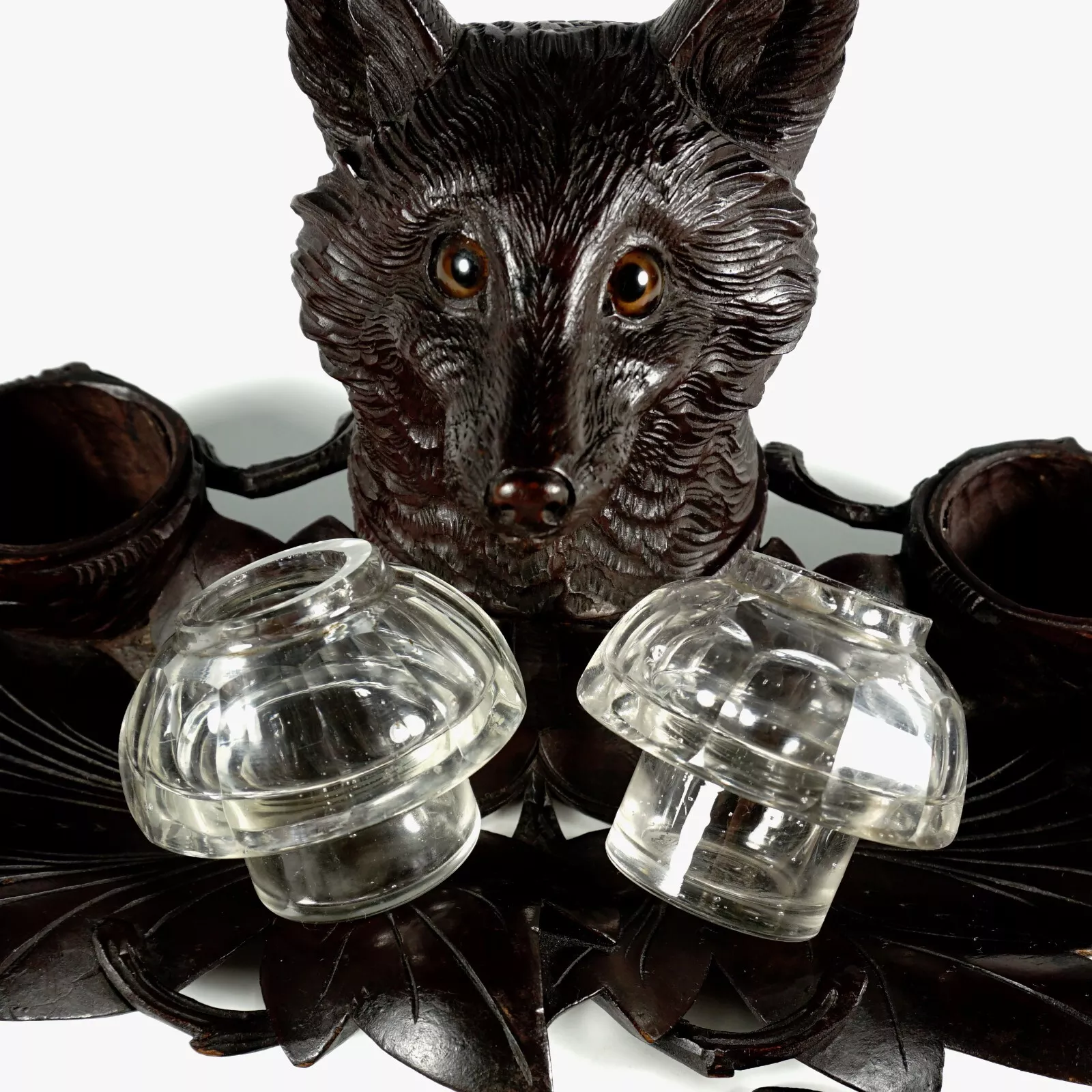 This late 19th century Swiss Black Forest double inkstand features the head of a fox expertly hand carved and finished with glass eyes. The hinged head opens to reveal a hidden compartment for stamps or writing accessories. The fox is flanked by two thick cut glass inkwells with carved wood lids resembling leaf clusters. The inkstand is further decorated with naturalistic carved leaves serving as a pen tray.