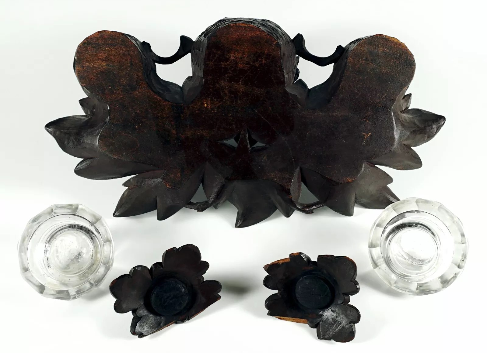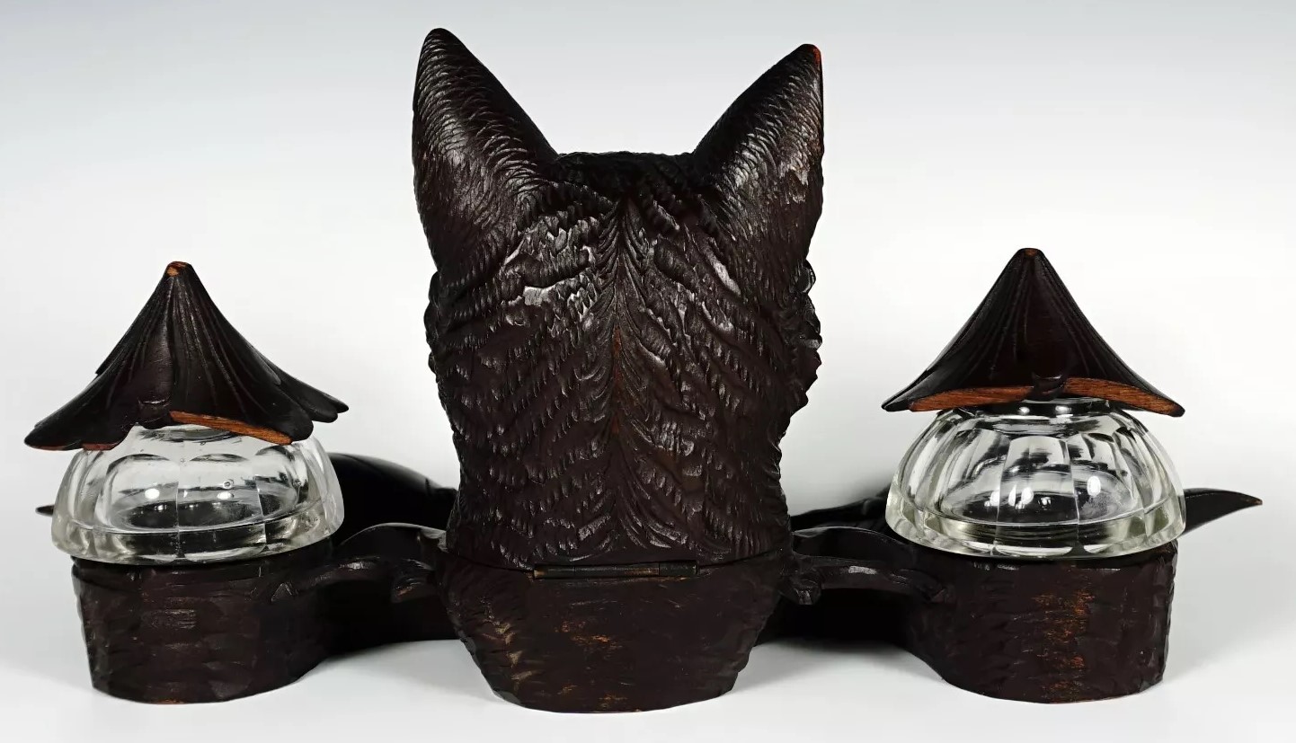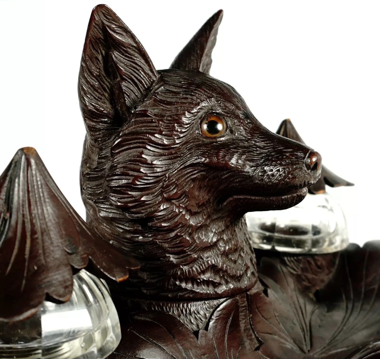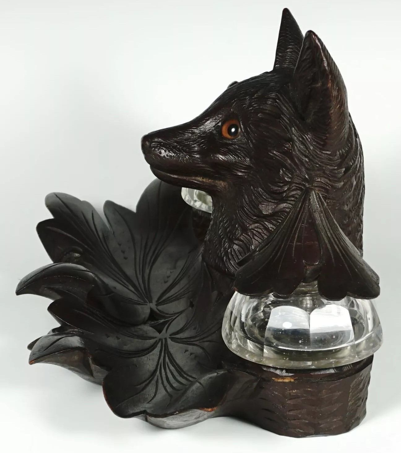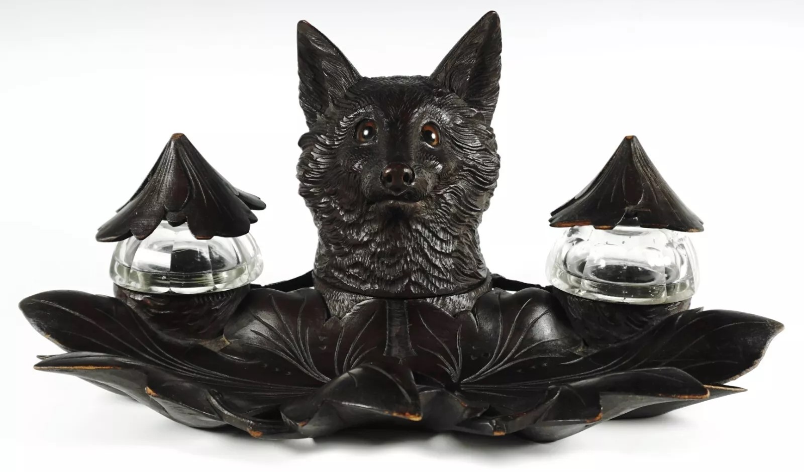 This late 19th century Swiss Black Forest double inkstand features the head of a fox expertly hand carved and finished with glass eyes. The hinged head opens to reveal a hidden compartment for stamps or writing accessories. The fox is flanked by two thick cut glass inkwells with carved wood lids resembling leaf clusters. The inkstand is further decorated with naturalistic carved leaves serving as a pen tray.