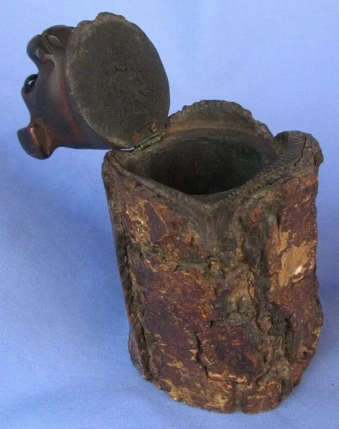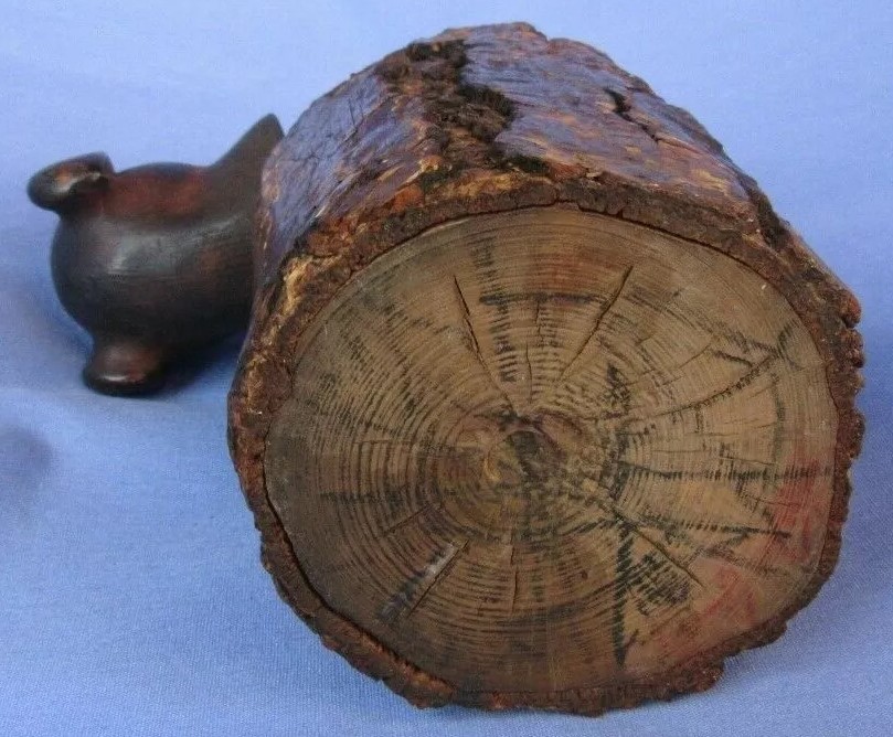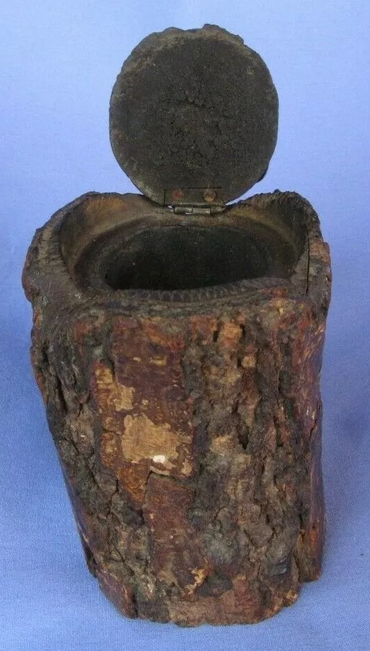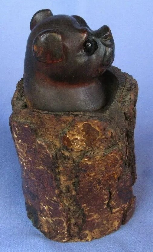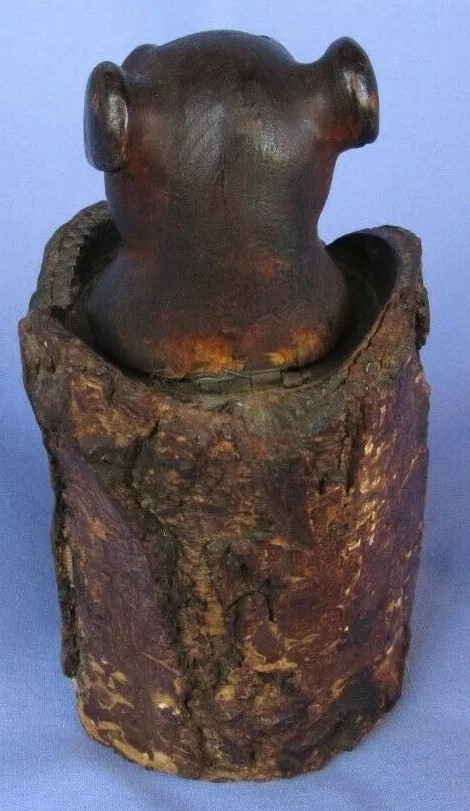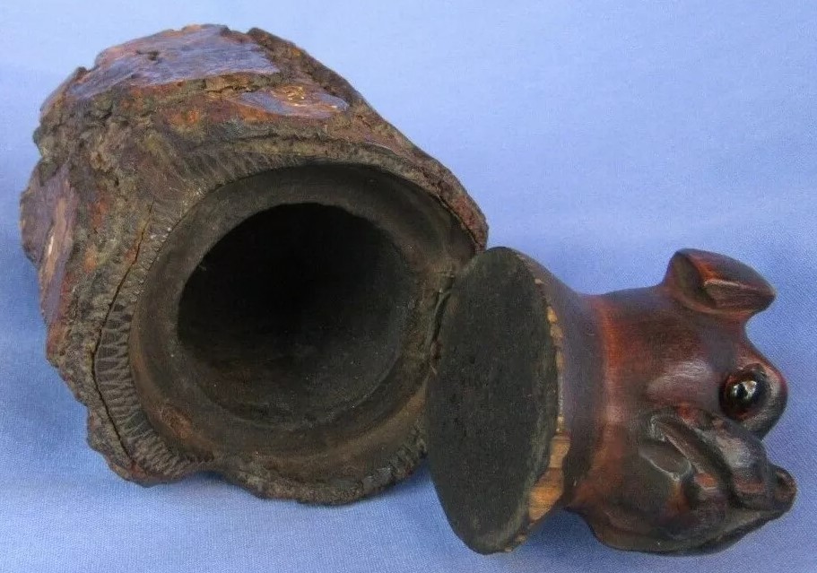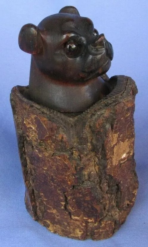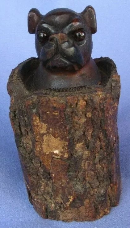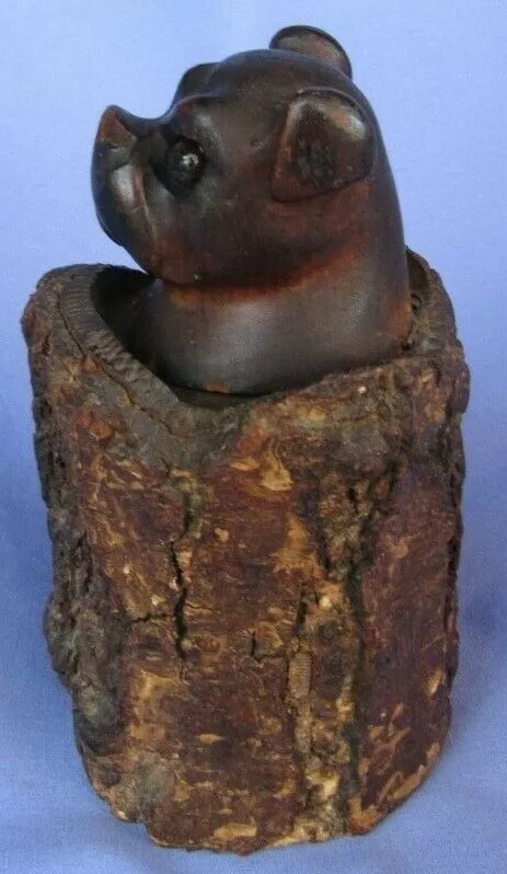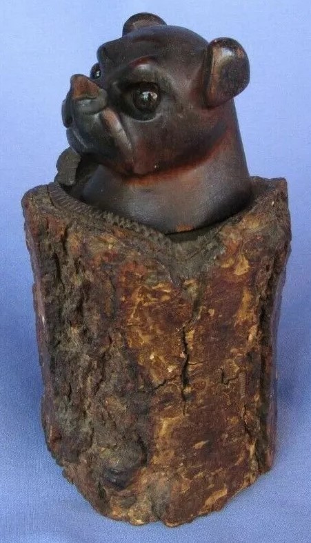 This hand-carved Black Forest figural inkwell features a dog, a pug or bulldog, with glass eyes. The dog is peering out from a tree stump. The inkwell is crafted from wood, with the exterior of the stump left with the bark of a tree.