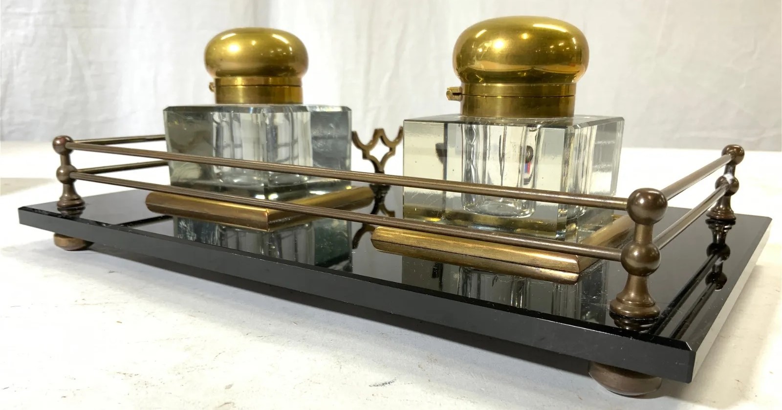 Black Glass and Brass Double Inkstand