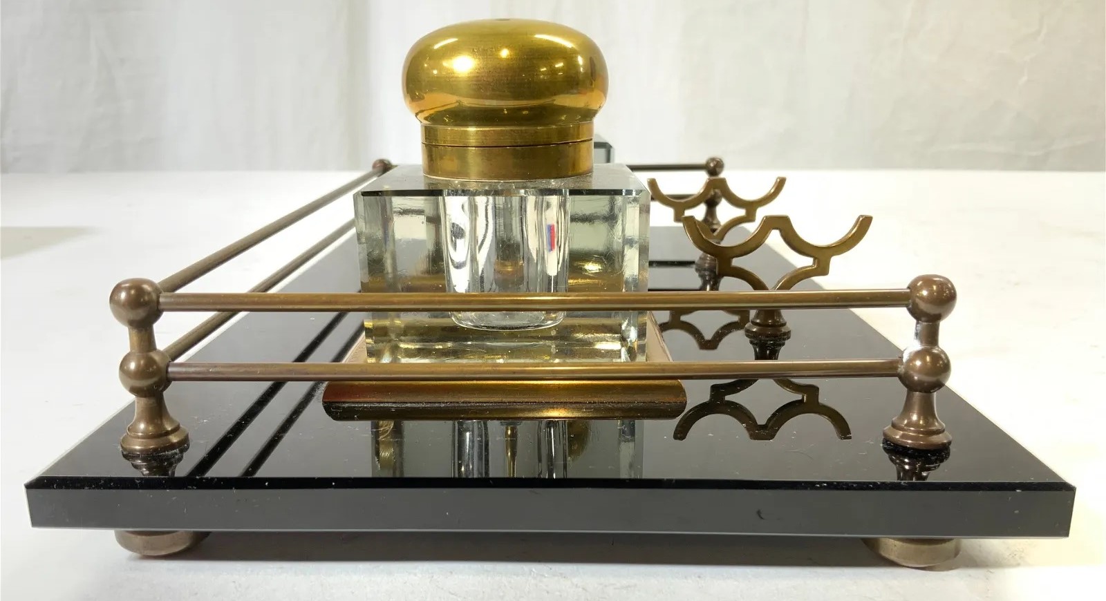 An Art Deco inkstand with a black glass base, brass galley surround, a double pen holder, and two glass inkwells with hinged brass lids.