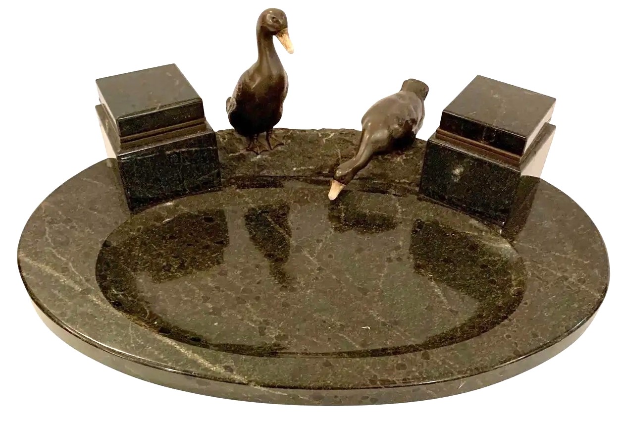 Black marble inkstand featuring two ducks with bone beaks, as though perched at the side of a pond (pen tray). This objet d’arte has two square inkwells with glass liners. André Villien, a French sculptor who worked in Paris between 1905 and 1924, may be the artist, but the piece is unsigned.