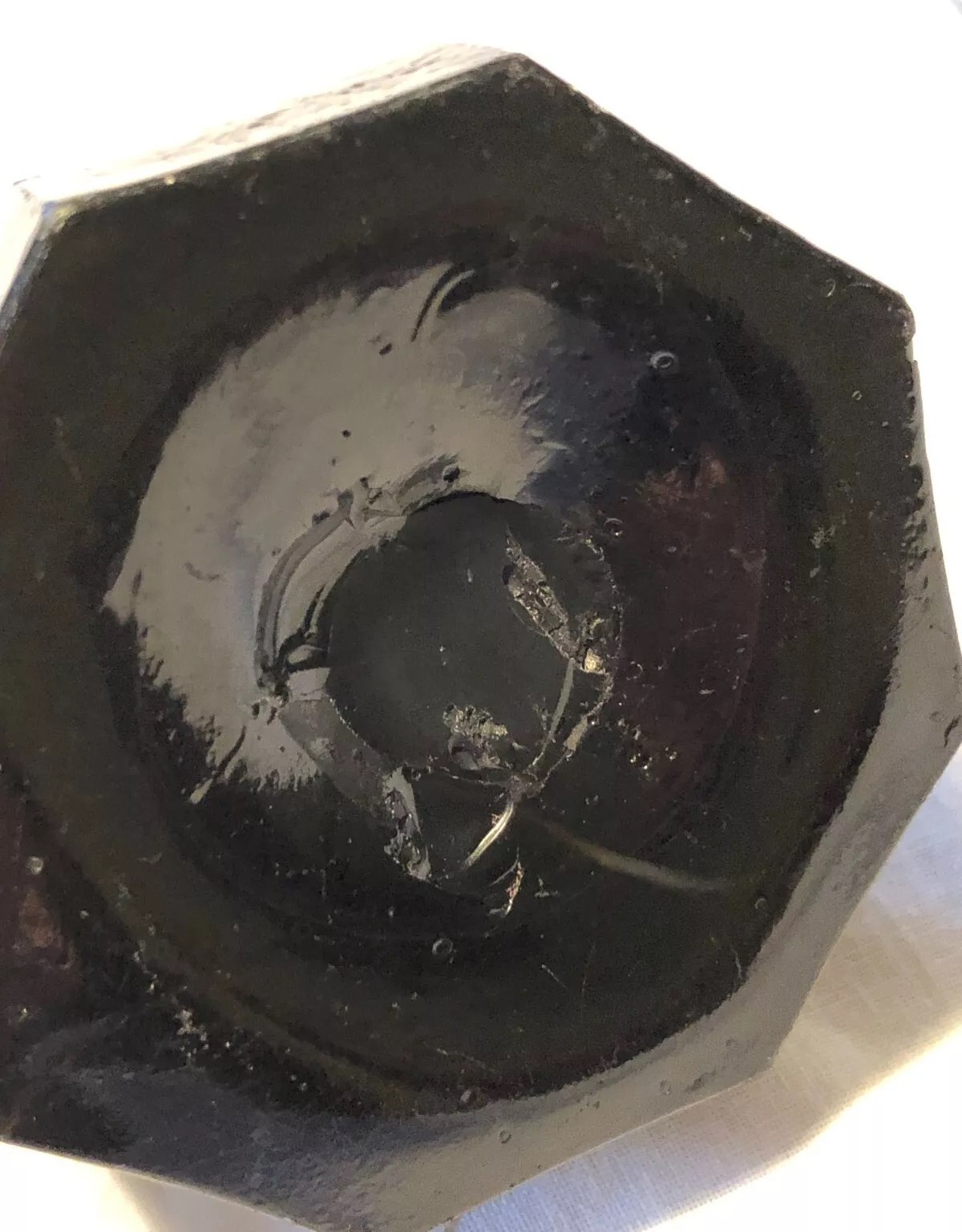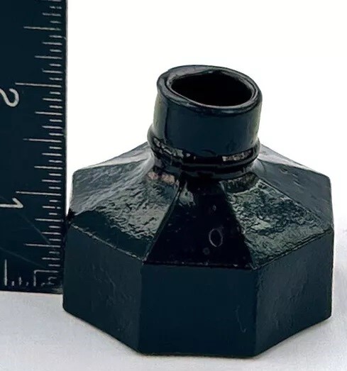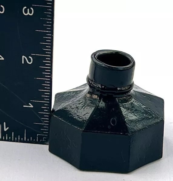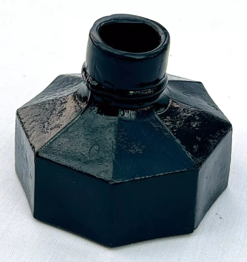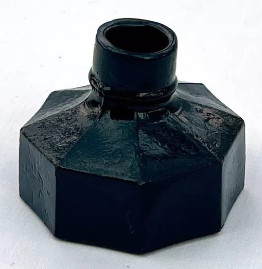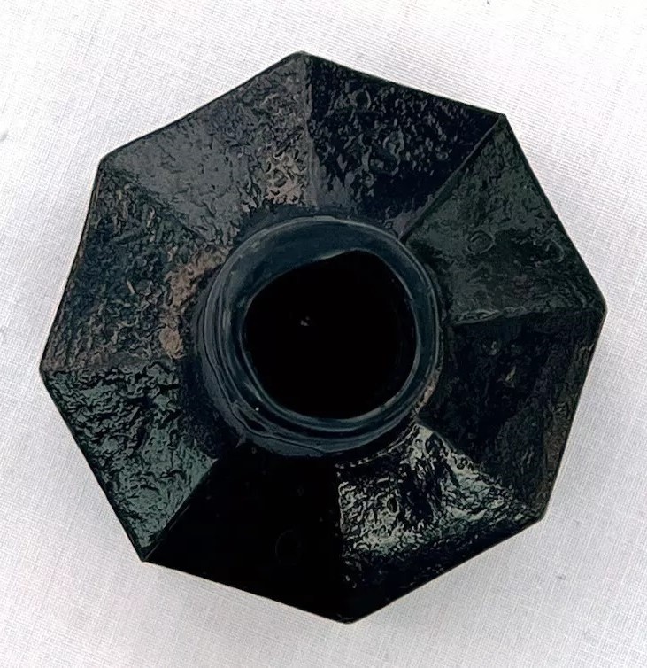 Black glass octagonal (“tent”) ink bottle with a rolled top and pontil mark.