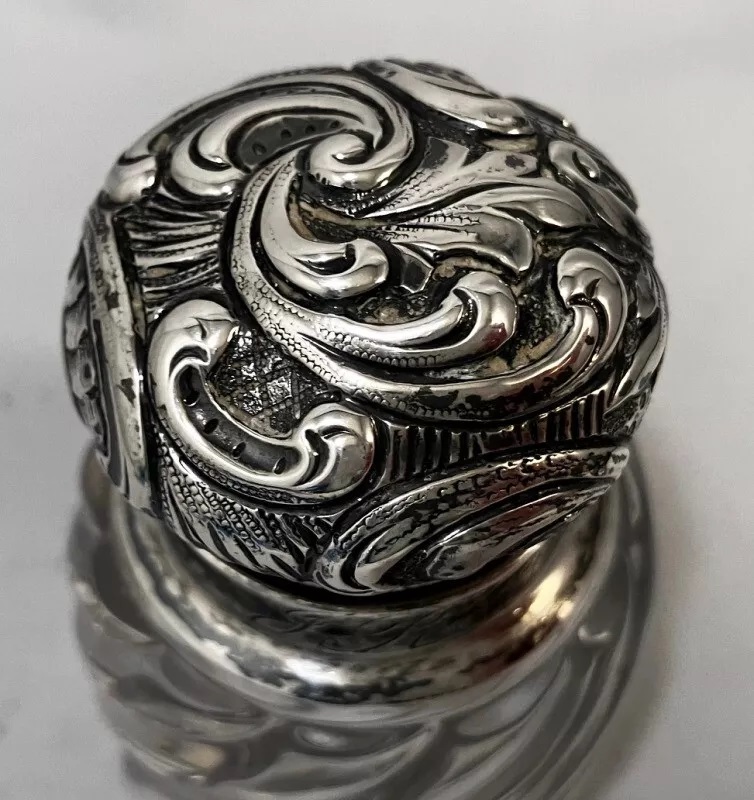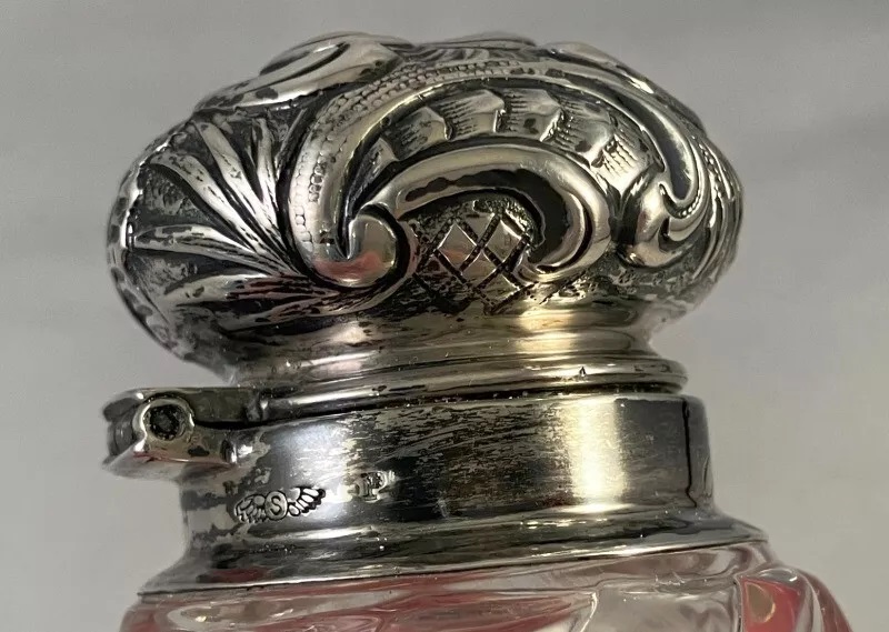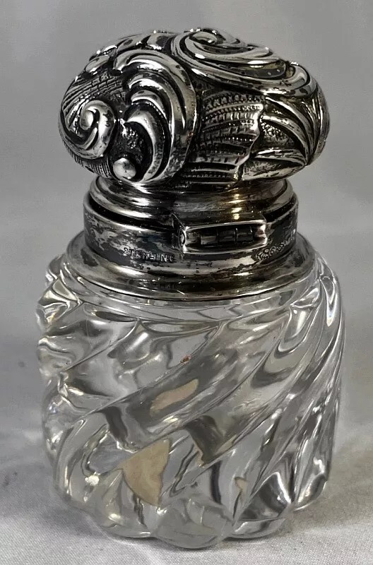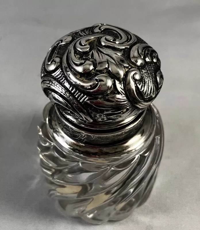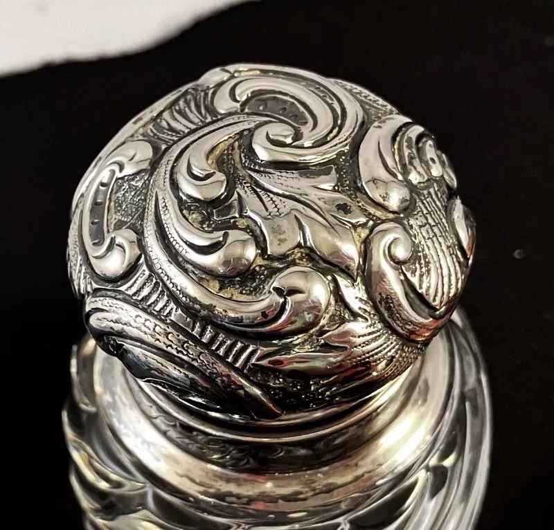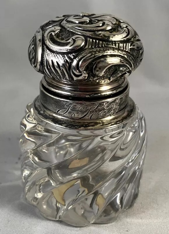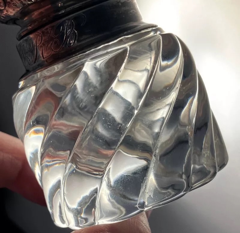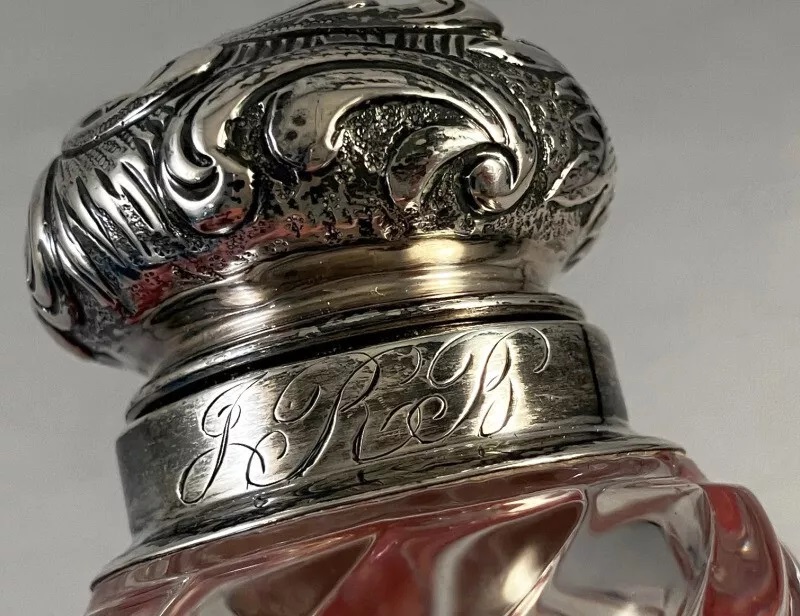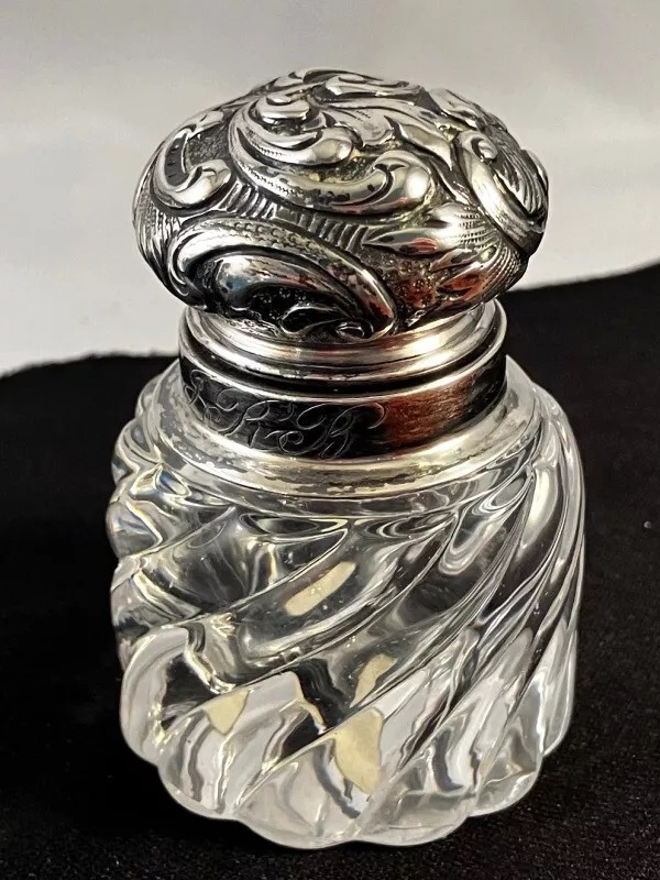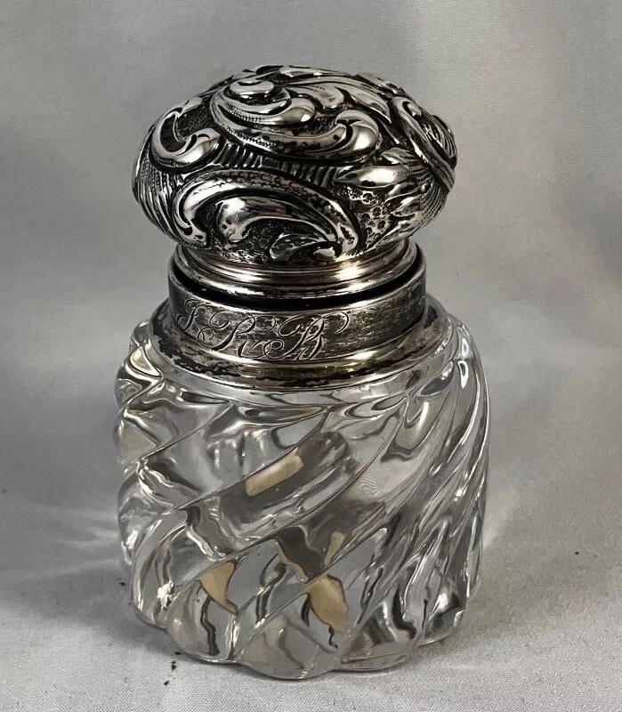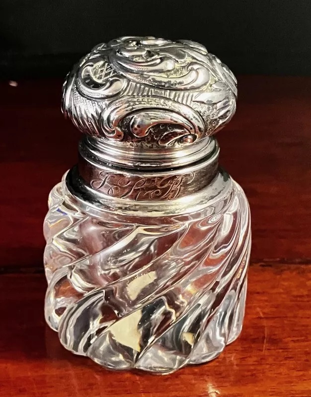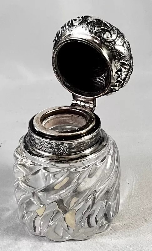 Diminutive in size, this inkwell has a swirled glass body in the style of Baccarat. The hinged, mushroom-shaped lid showcases heavy repoussé sterling in an elaborate, asymmetrical leaf-and-scroll design singularly attributed to the George W. Sheibler Company. The lower left neck band is stamped with the Shiebler winged “S” and the letter “P”. The front band is hand engrave in Italic scipt with the monogram JRB.