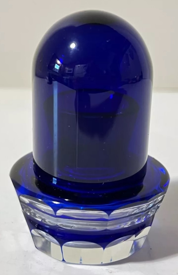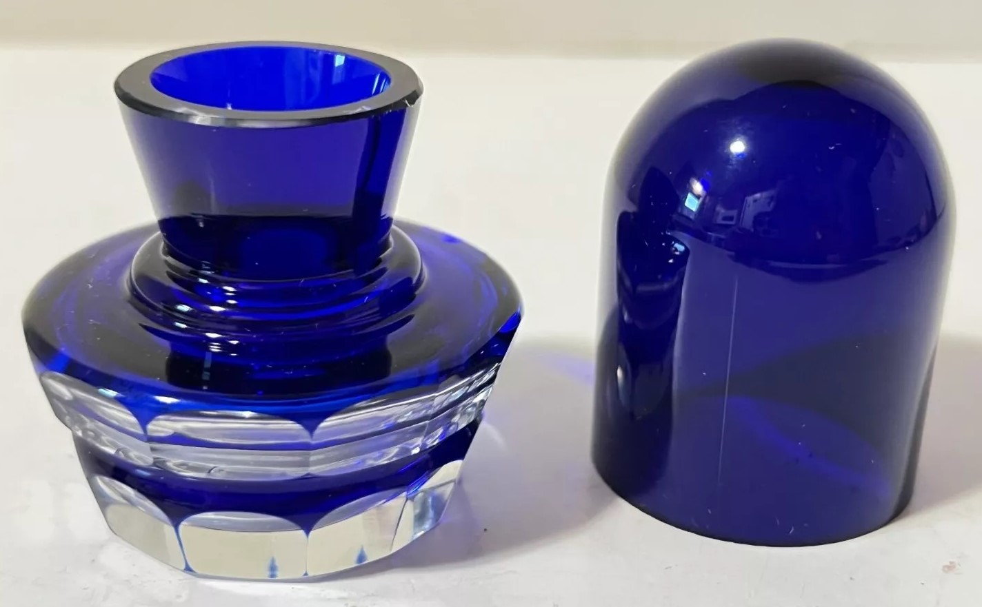 This cobalt blue cut glass inkwell is cylindrical in shape with a flared top. The lid is a domed shape that fits snugly over the top. The base of the inkwell is cut with a series of geometric patterns.