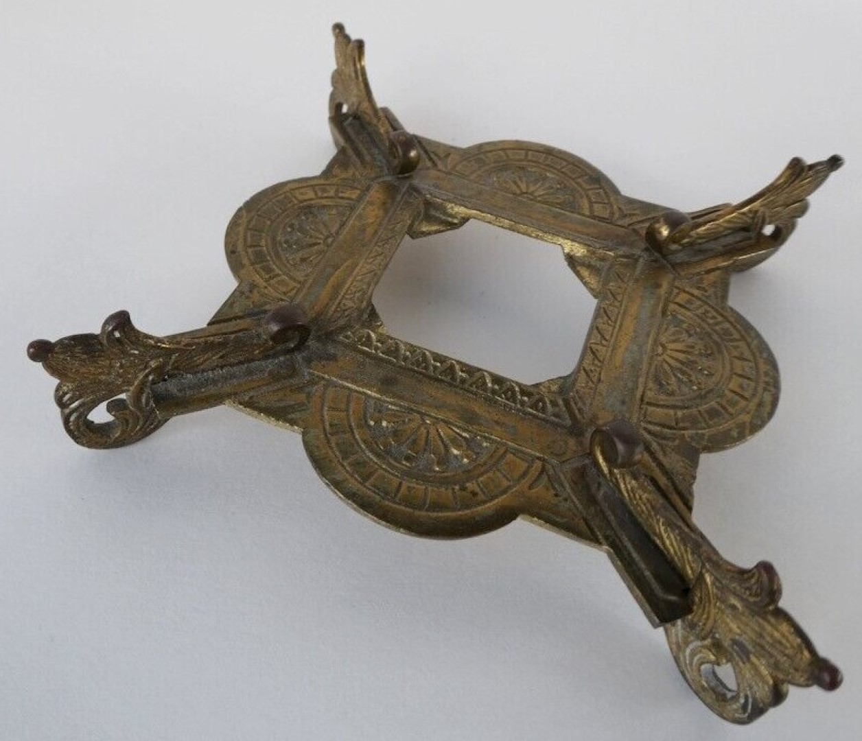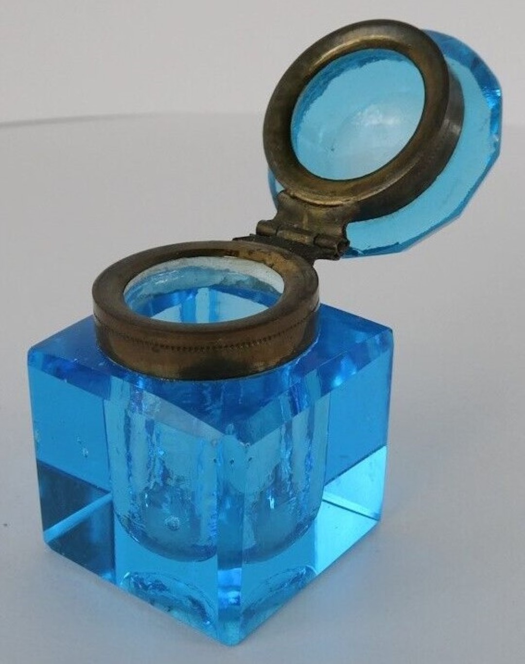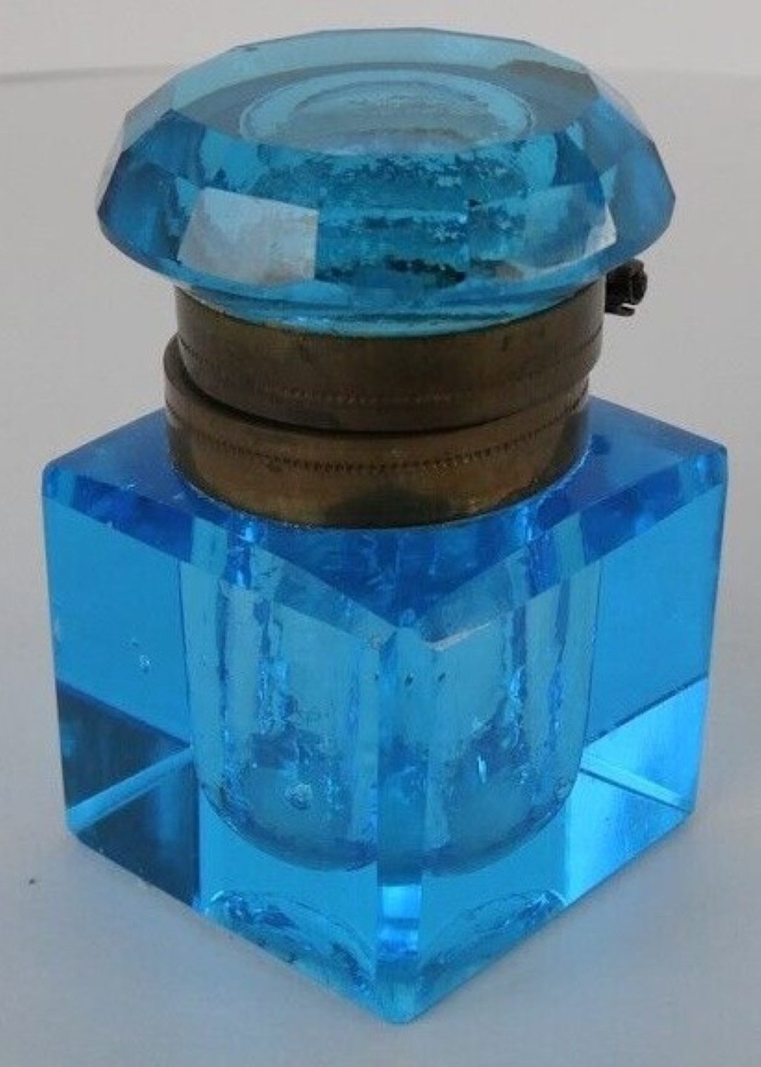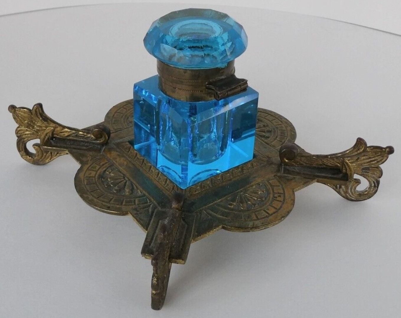 A cut blue crystal inkwell with faceted square body and cushion shaped lid with hinged brass mounts rests on an ornate four-point brass base.