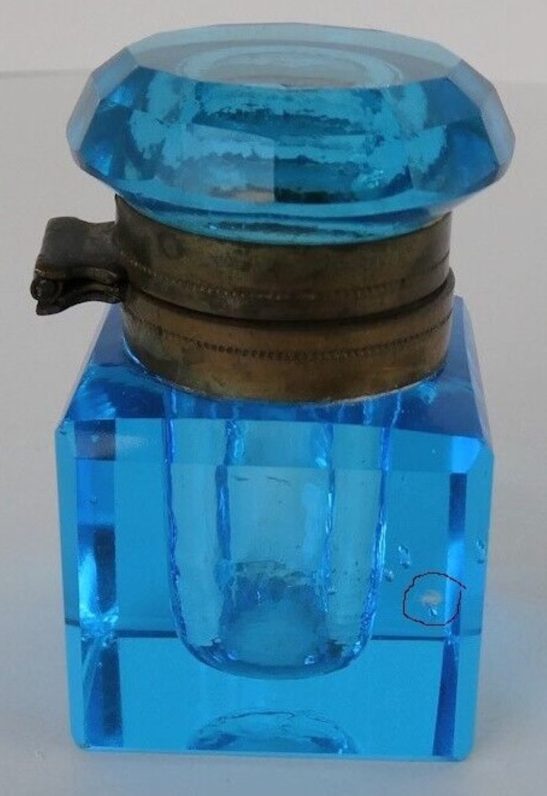 Blue Cut Glass Inkwell on Brass Base