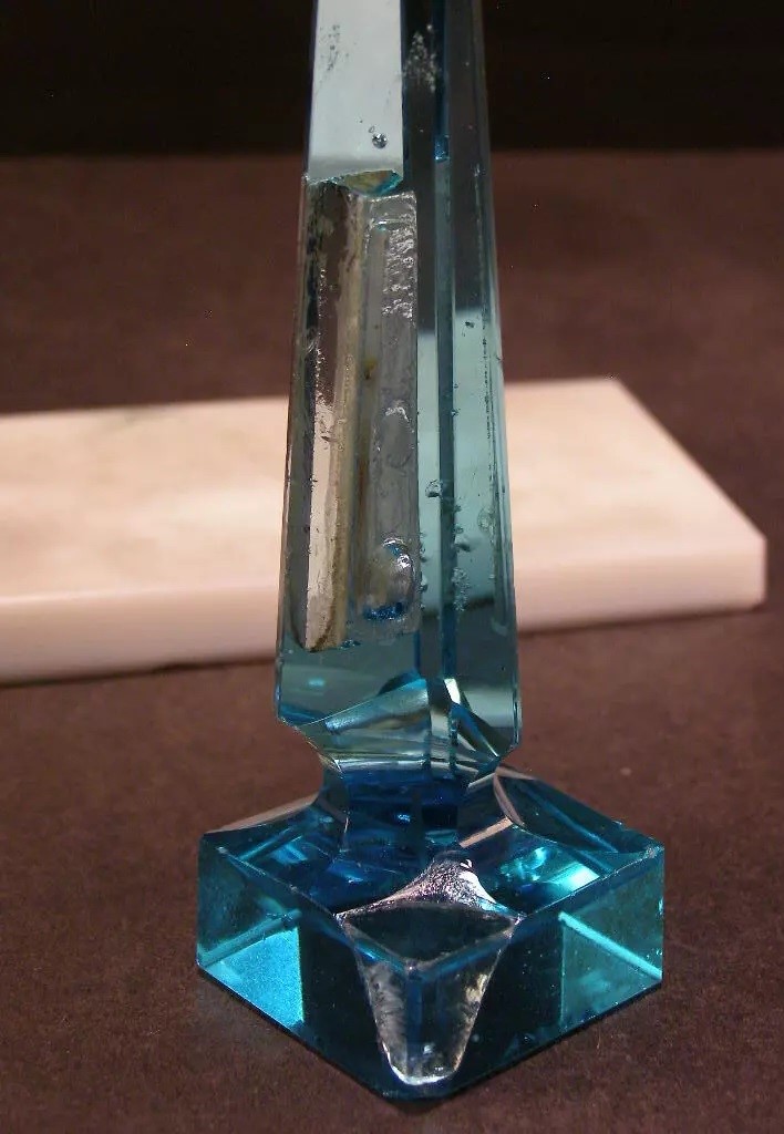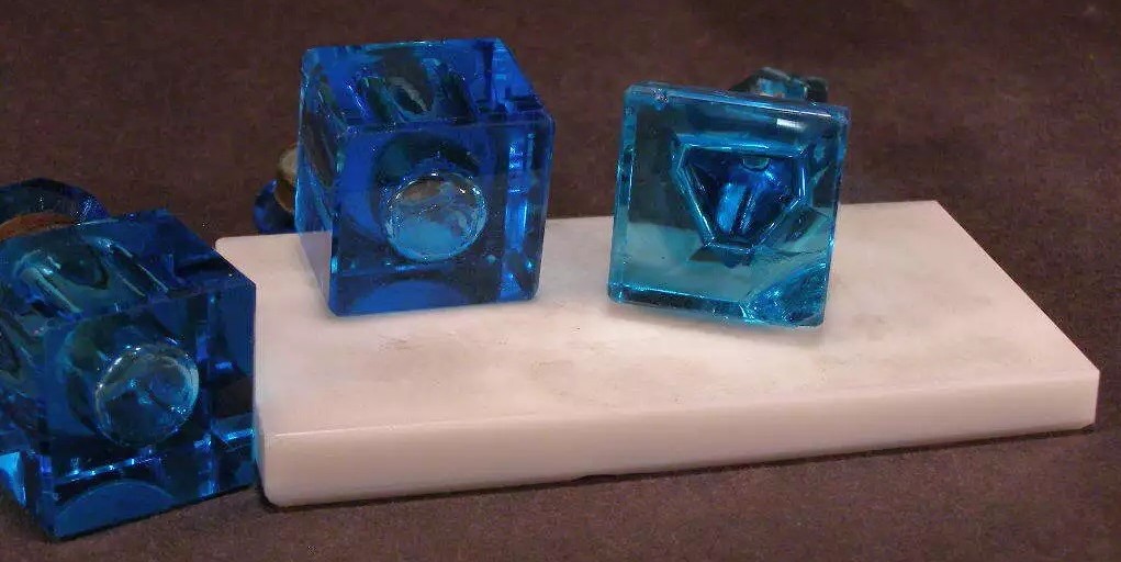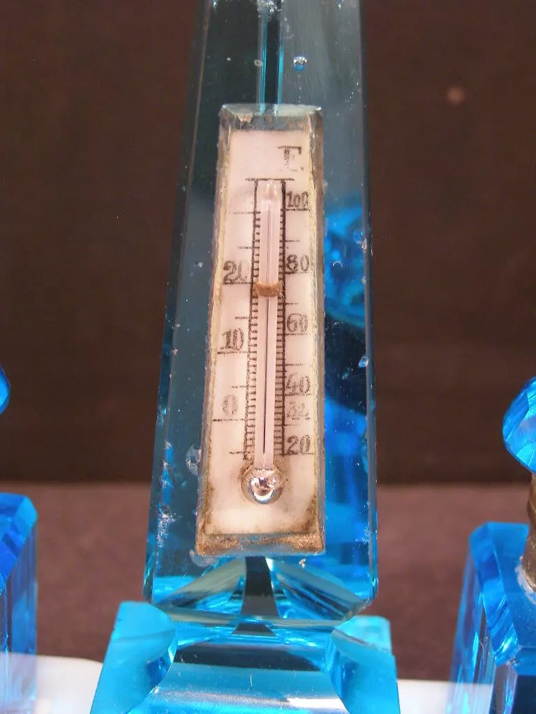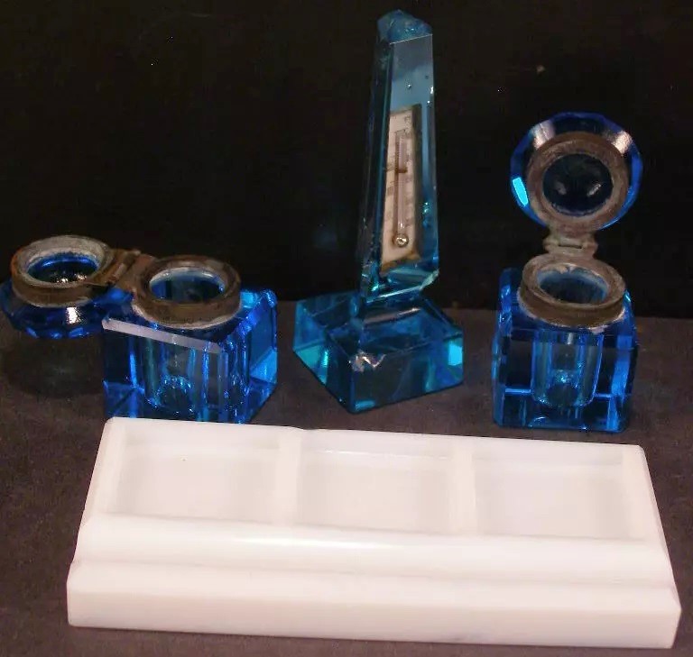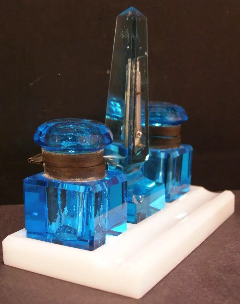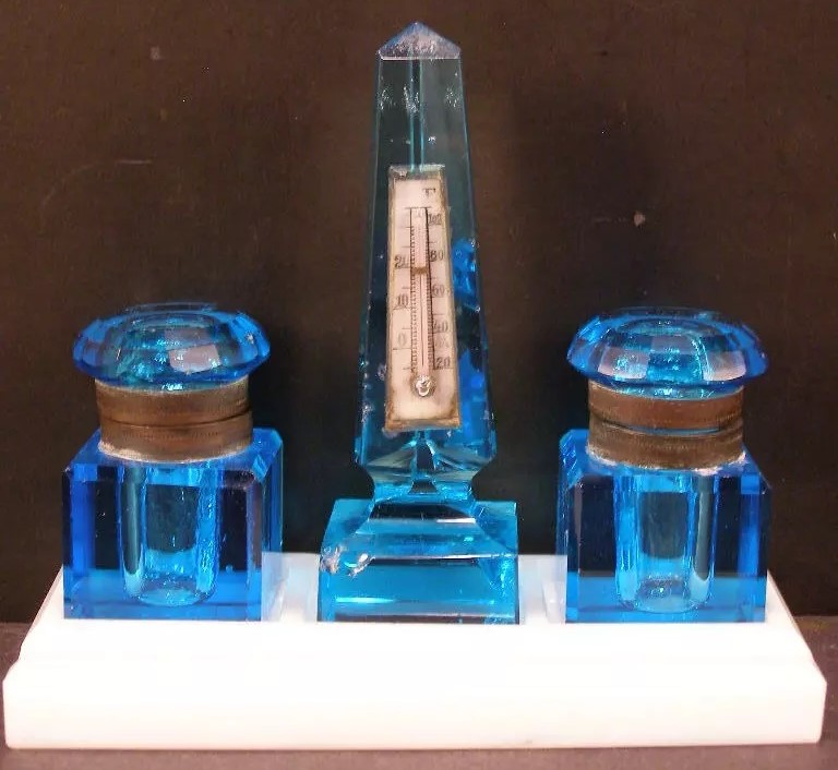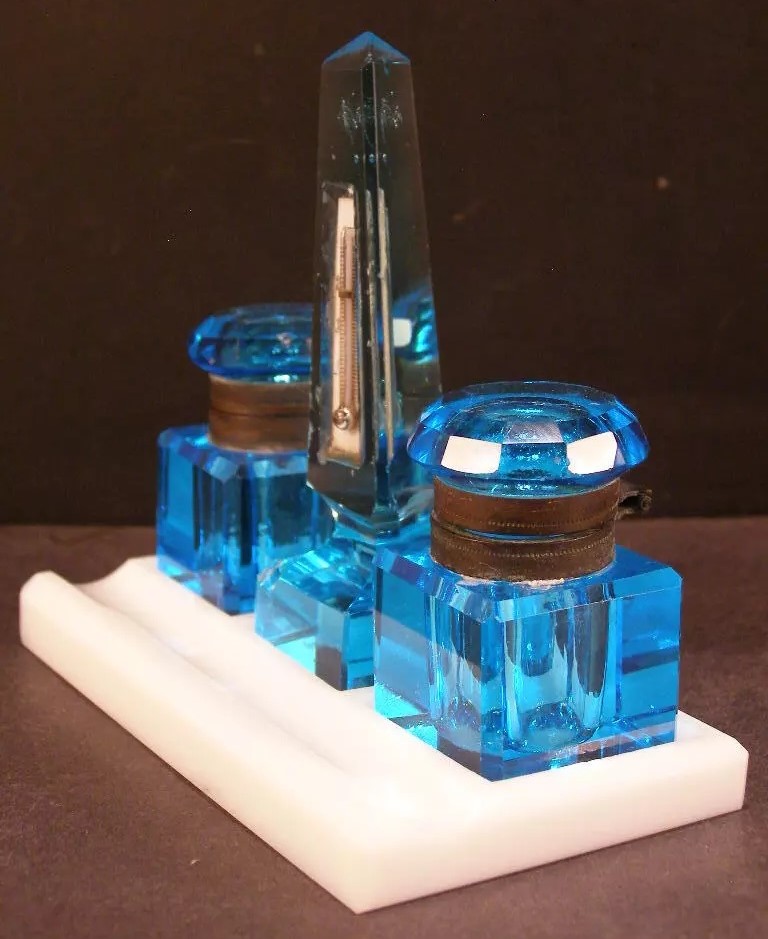 This blue glass inkstand features two square-bodied inkwells with round, faceted lids set on a white glass tray. The central feature is a thermometer, encased in a blue glass obelisk. The thermometer has markings for both Fahrenheit and Celsius.