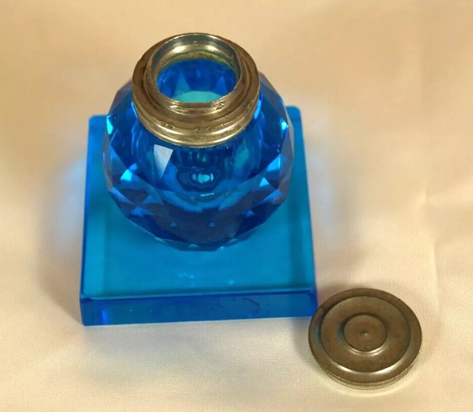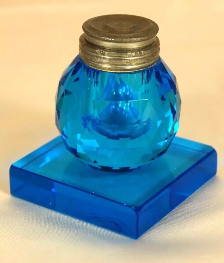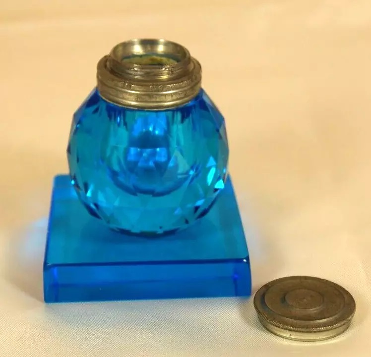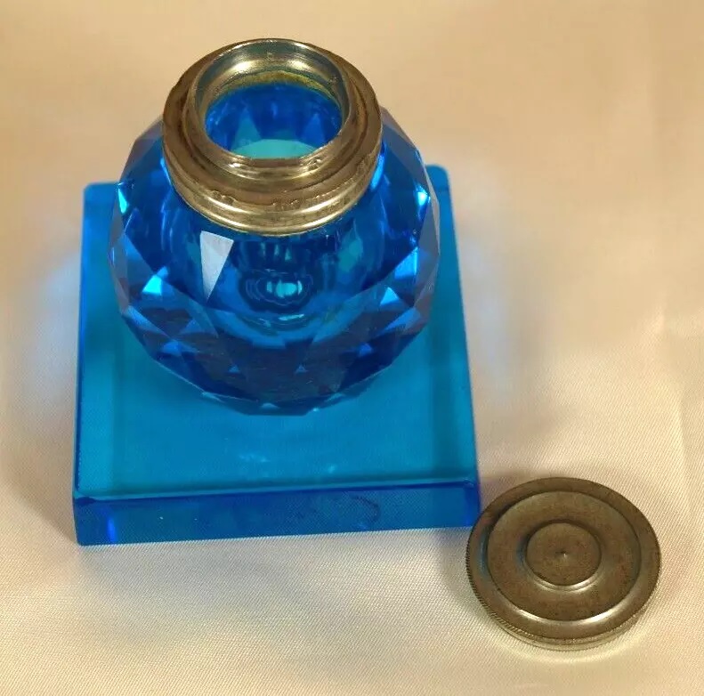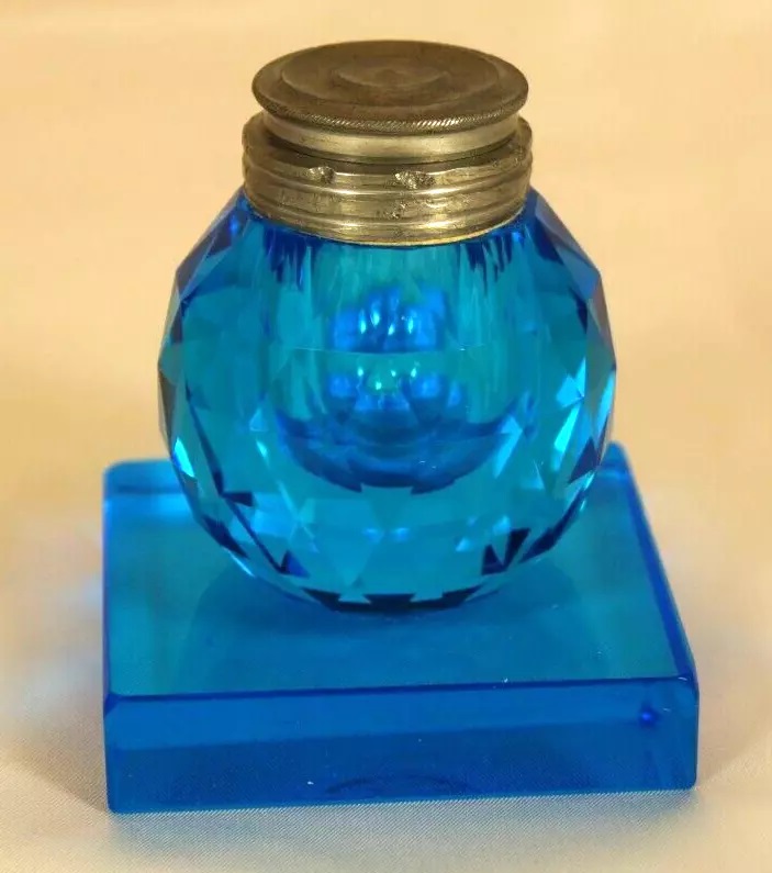 This egg-shaped blue glass inkwell features a vibrant cobalt blue color. Made of pressed glass, it has a faceted design. It sits on a matching blue glass base. The brass lid screws on top to seal the inkwell. The cobalt blue color was achieved using cobalt oxide.