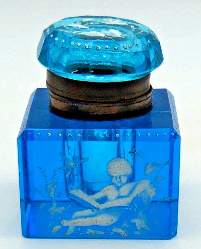 This cobalt blue glass inkwell is a high-quality example of Mary Gregory-style glassware, characterized by its distinct white enameled “boy reading” motif.