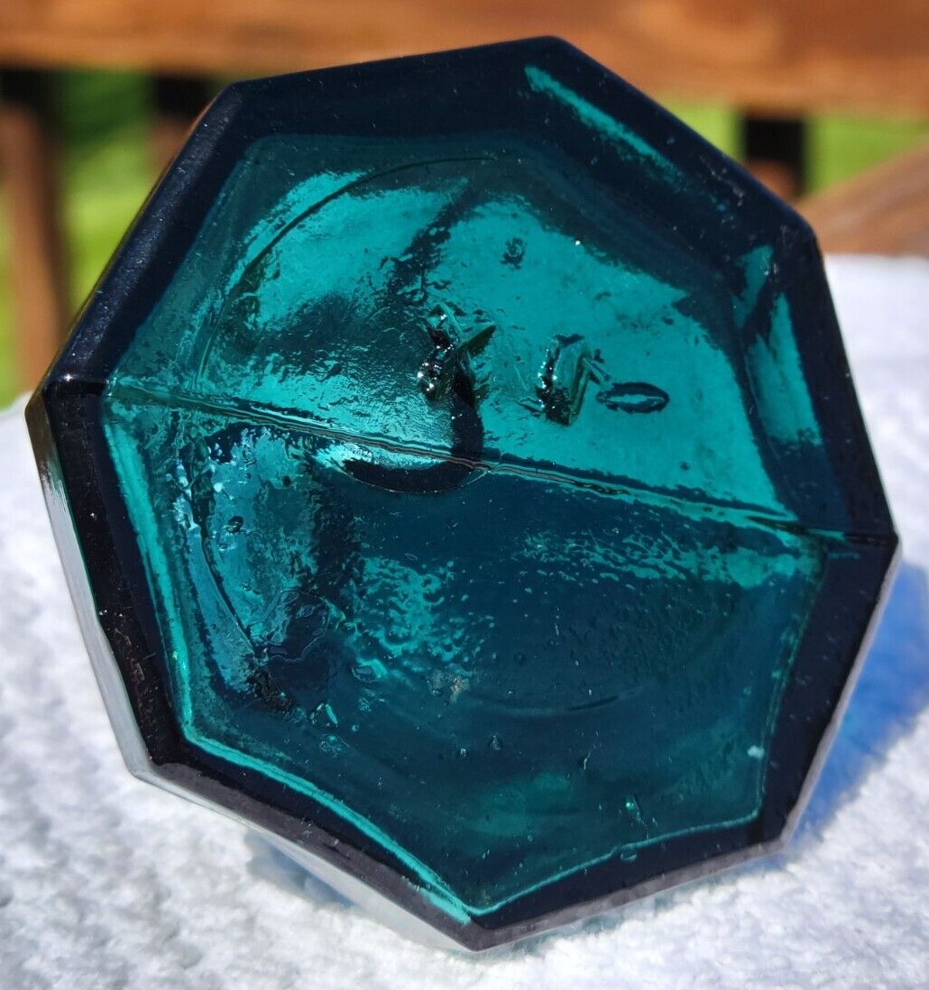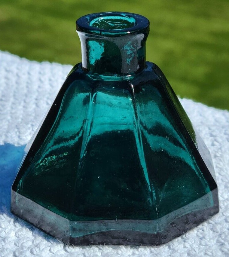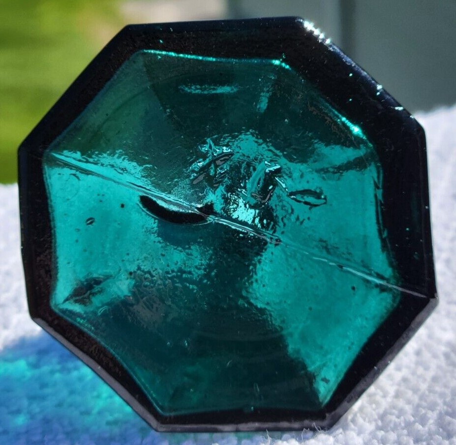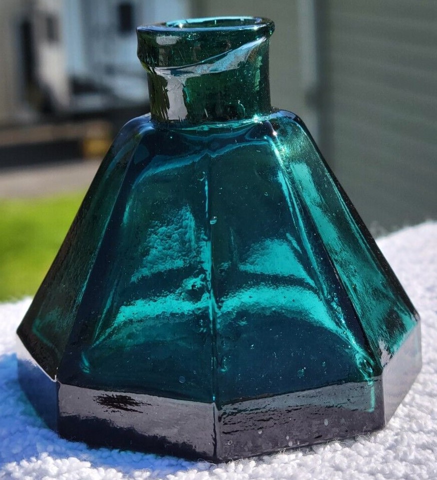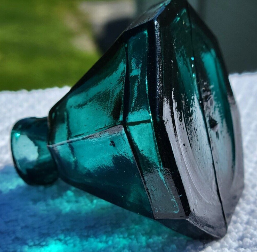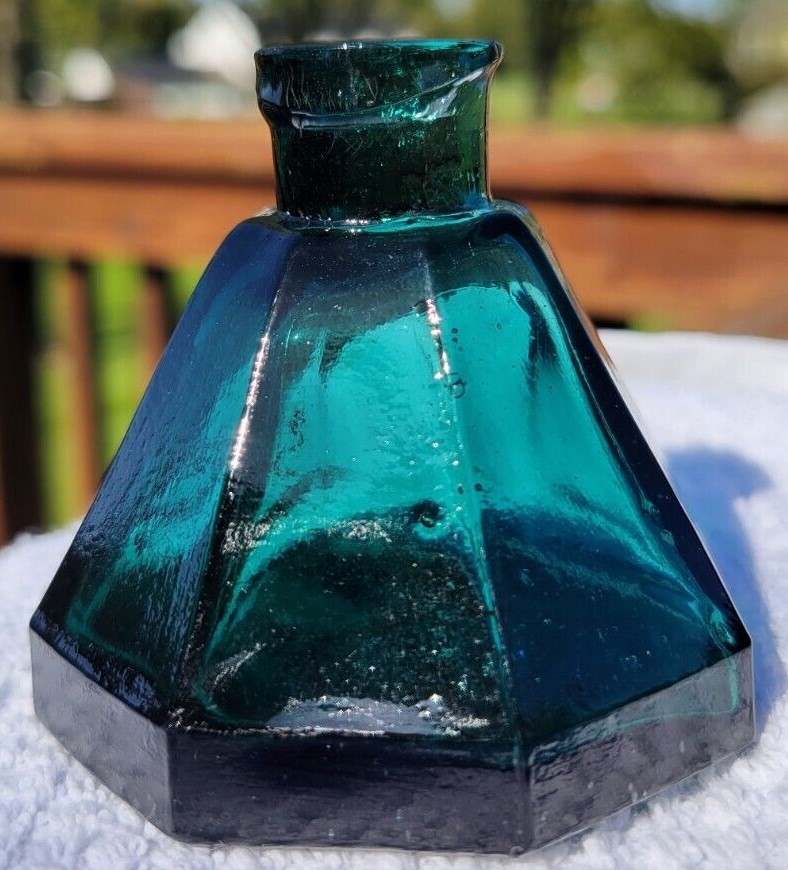 Crude, smooth base, snap case or two-piece mold 8-sided umbrella ink bottle. The color is a rich deep shaded blue teal green. This is a rare color for an early smooth base umbrella ink. The neck is puggy, and crude and the lip is very crudely laid on and applied with uneven glass. This ink has crude glass with some seed bubbles scattered throughout. The base is crude with an embossed X and the number 1. This could be a Lockport N.Y. blown ink.