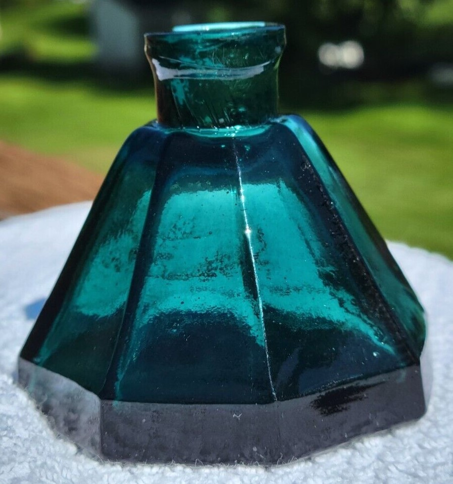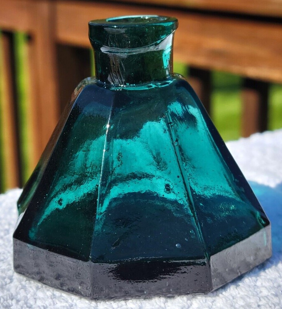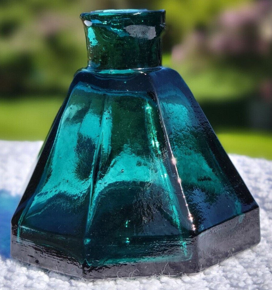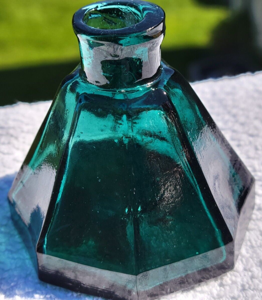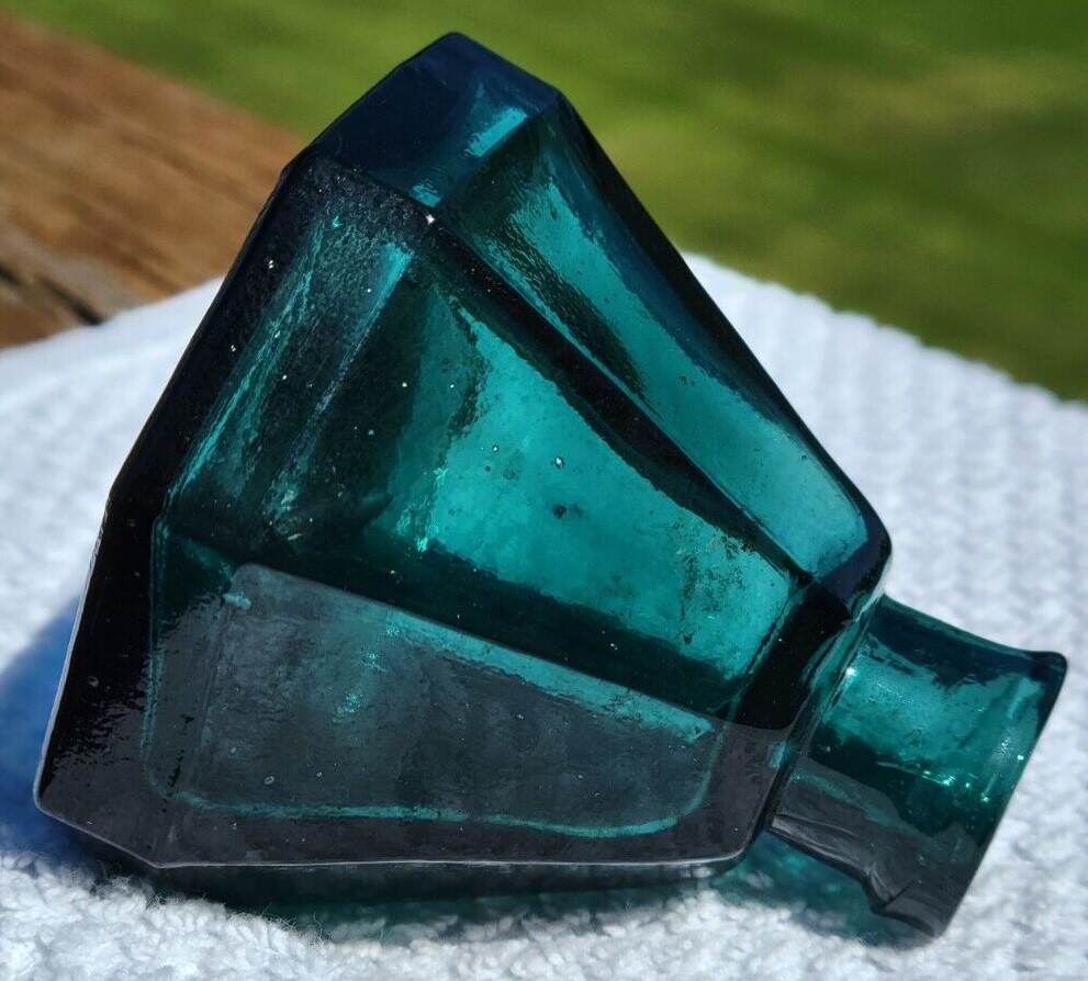 Crude, smooth base, snap case or two-piece mold 8-sided umbrella ink bottle. The color is a rich deep shaded blue teal green. This is a rare color for an early smooth base umbrella ink. The neck is puggy, and crude and the lip is very crudely laid on and applied with uneven glass. This ink has crude glass with some seed bubbles scattered throughout. The base is crude with an embossed X and the number 1. This could be a Lockport N.Y. blown ink.