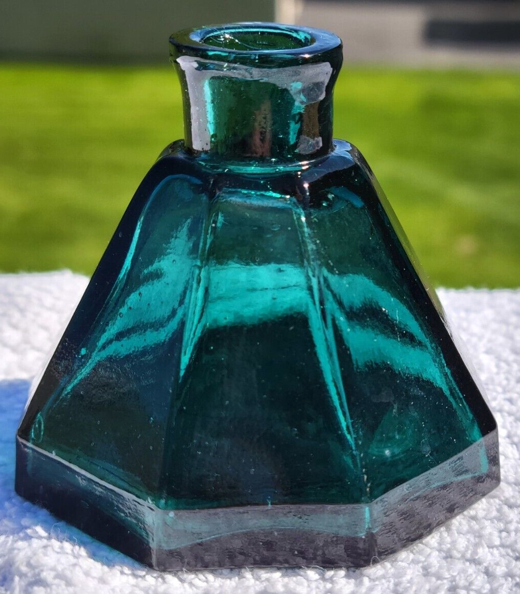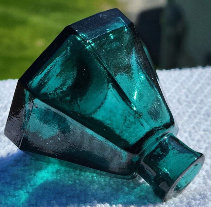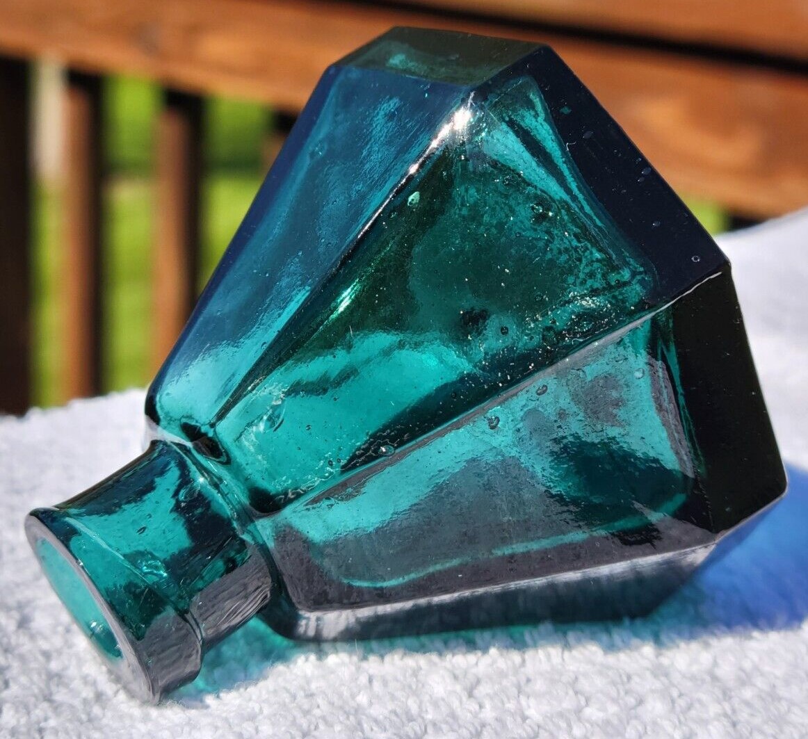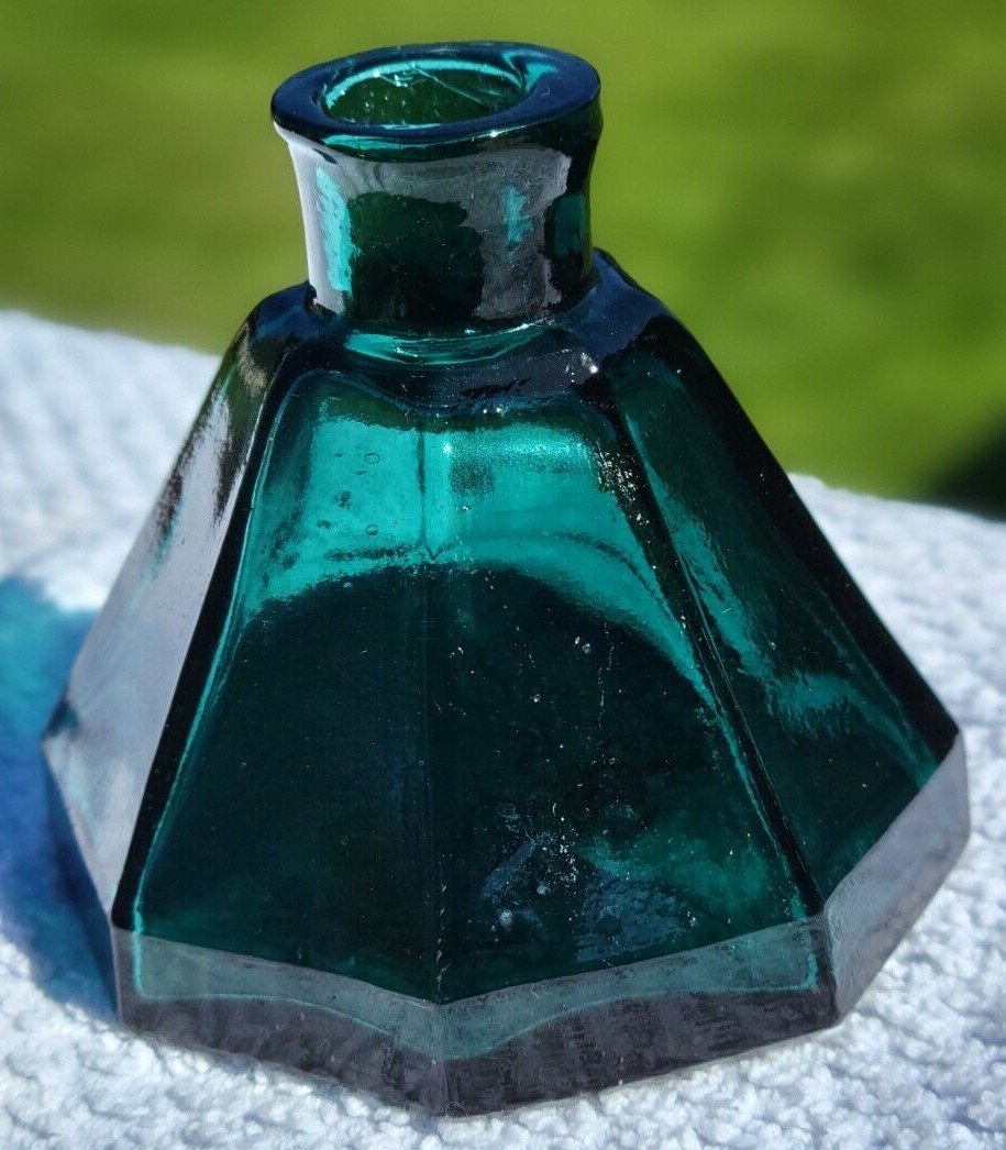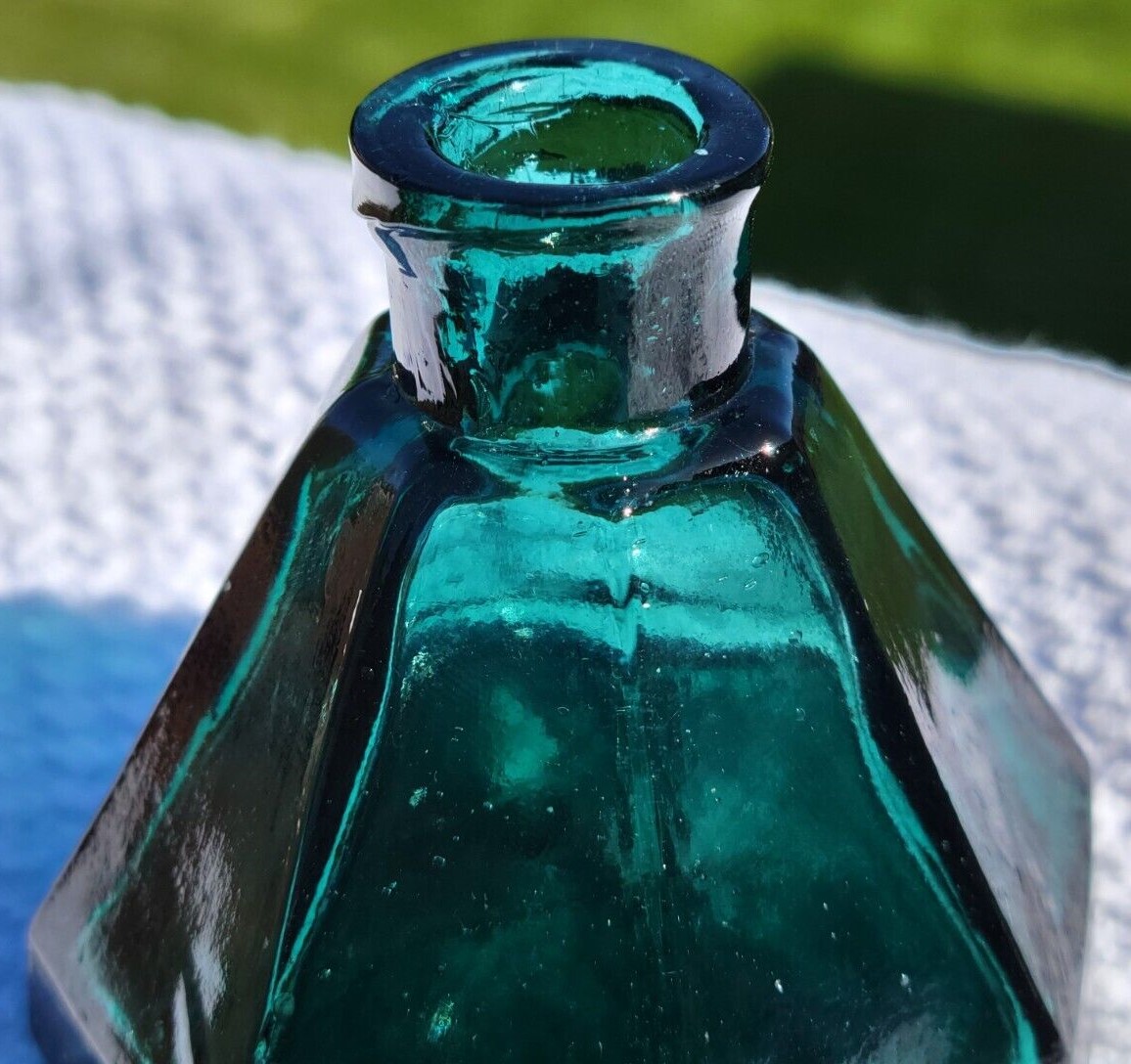 Crude, smooth base, snap case or two-piece mold 8-sided umbrella ink bottle. The color is a rich deep shaded blue teal green. This is a rare color for an early smooth base umbrella ink. The neck is puggy, and crude and the lip is very crudely laid on and applied with uneven glass. This ink has crude glass with some seed bubbles scattered throughout. The base is crude with an embossed X and the number 1. This could be a Lockport N.Y. blown ink.