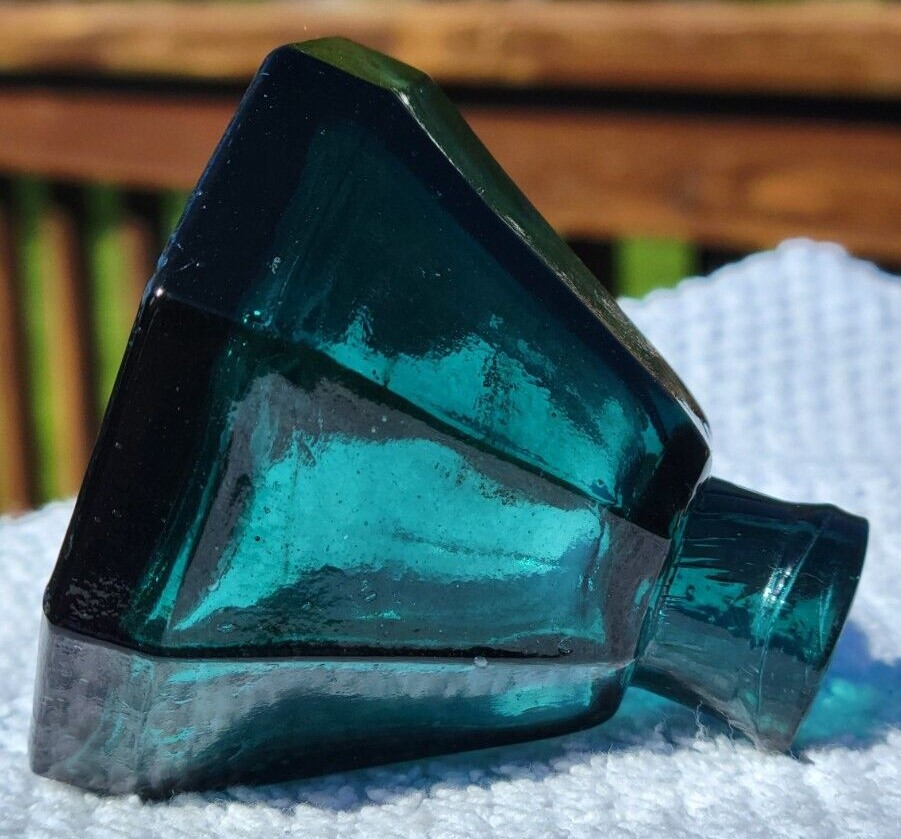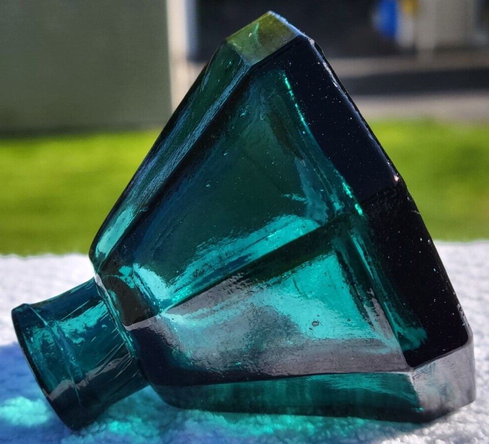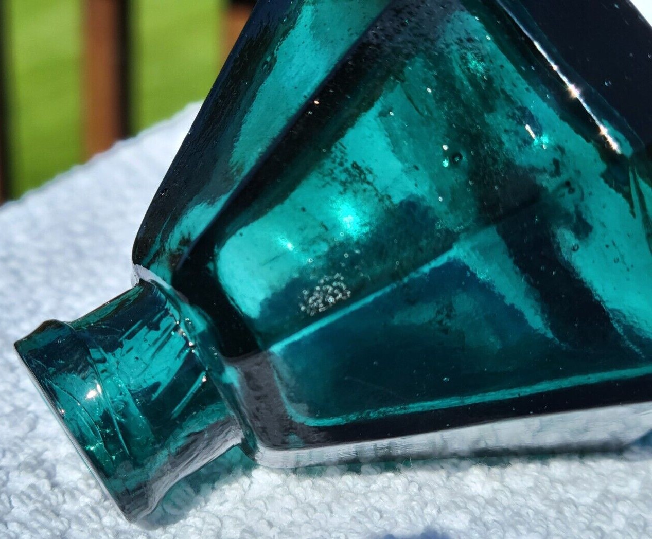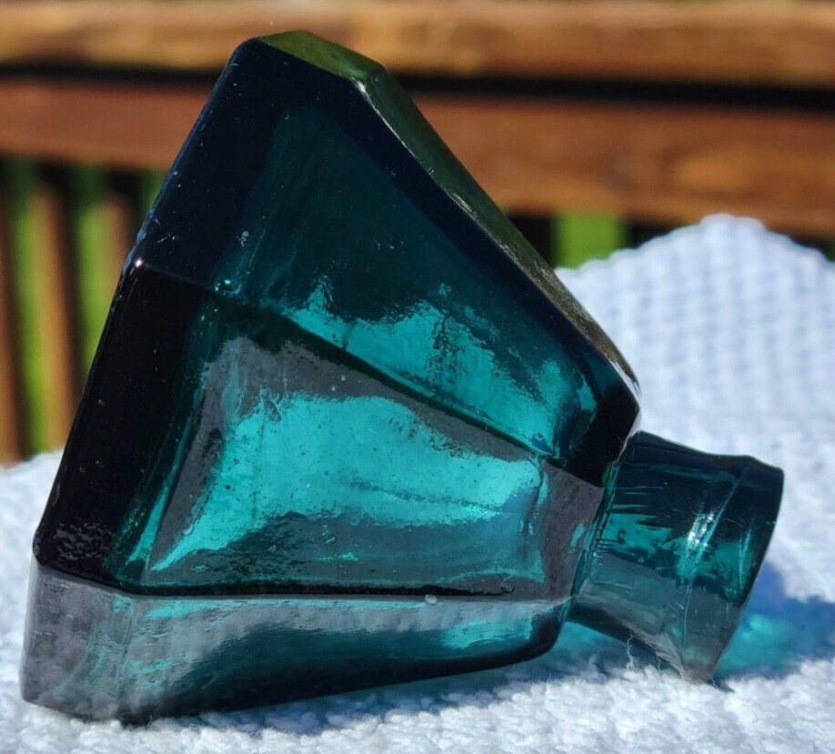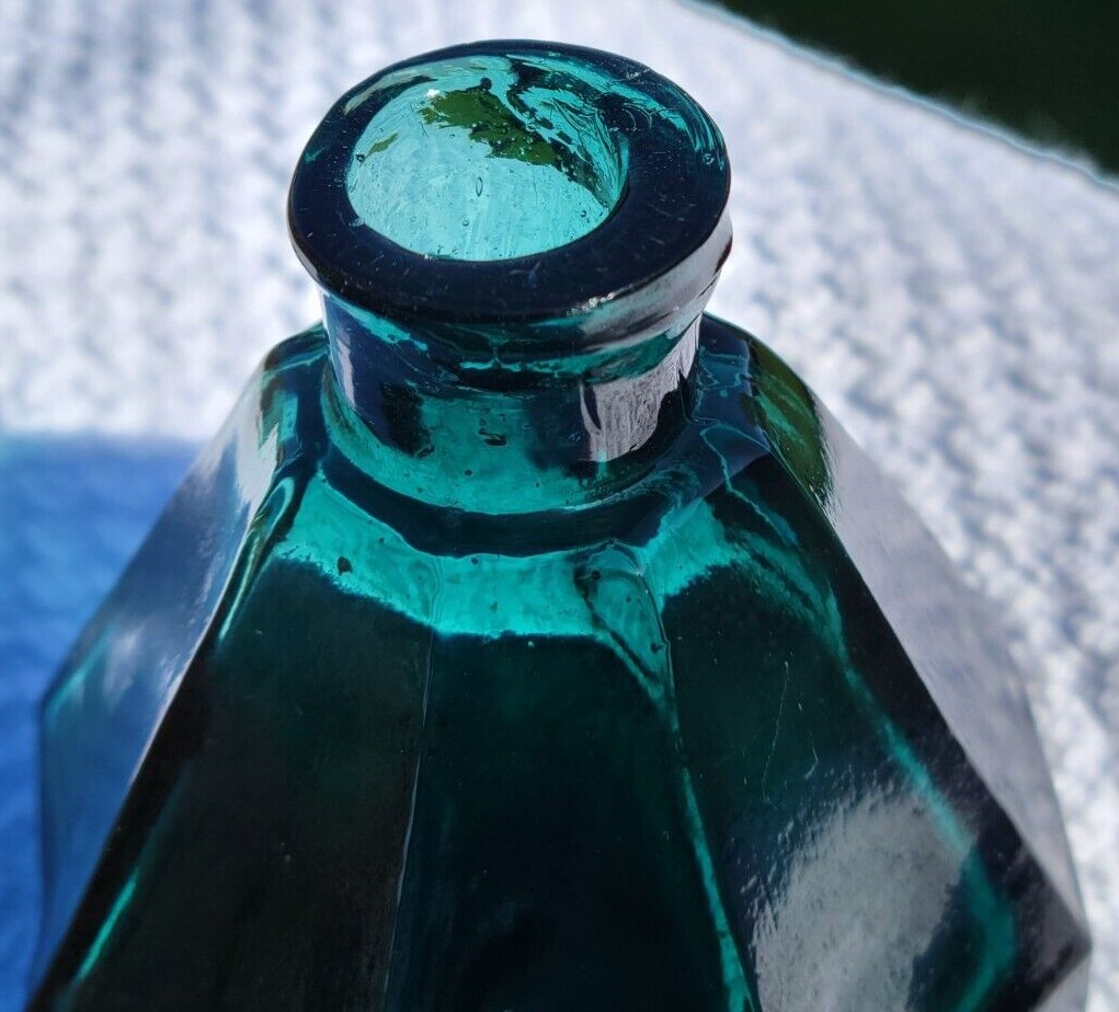 Crude, smooth base, snap case or two-piece mold 8-sided umbrella ink bottle. The color is a rich deep shaded blue teal green. This is a rare color for an early smooth base umbrella ink. The neck is puggy, and crude and the lip is very crudely laid on and applied with uneven glass. This ink has crude glass with some seed bubbles scattered throughout. The base is crude with an embossed X and the number 1. This could be a Lockport N.Y. blown ink.