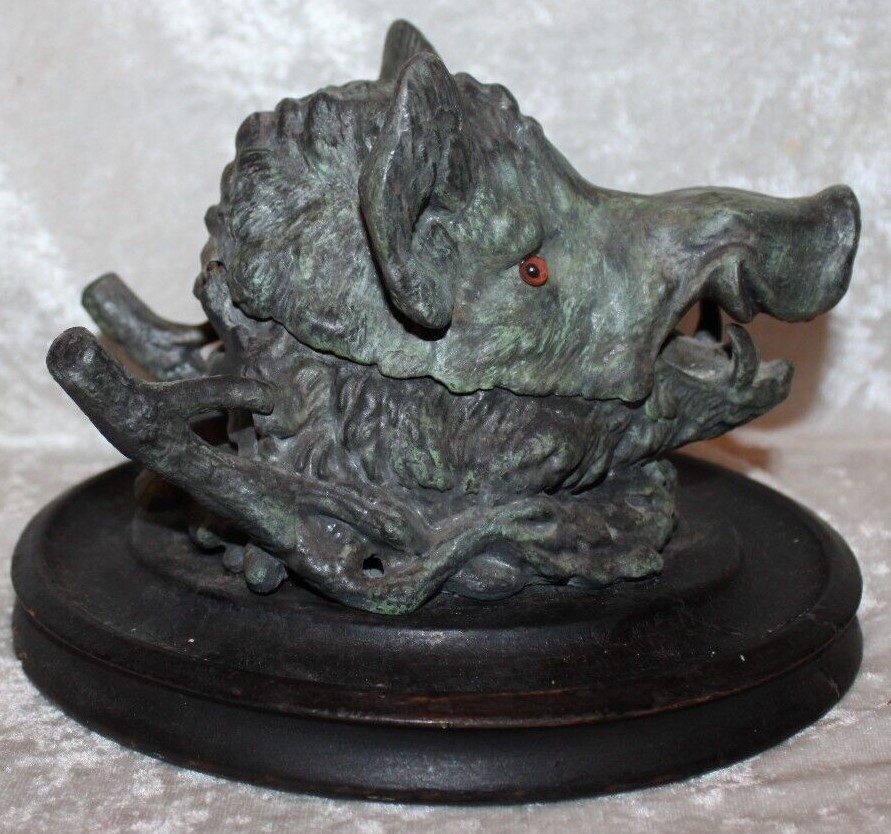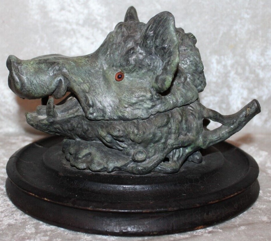This wild razorback hog’s or boar’s head has striking glass eyes and its original ink pot. A detailed metal casting, it rests on an oval wooden base and has a pen holder in the back.