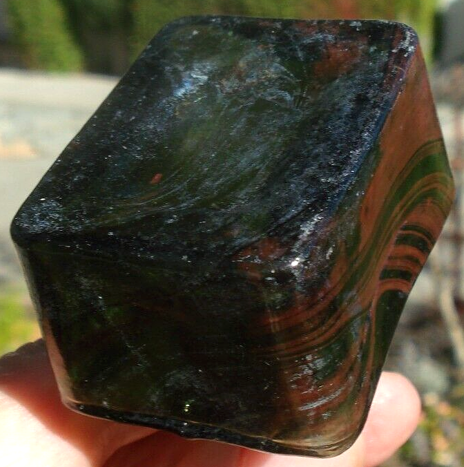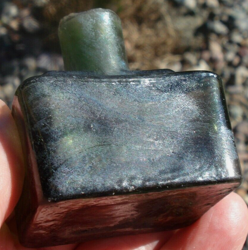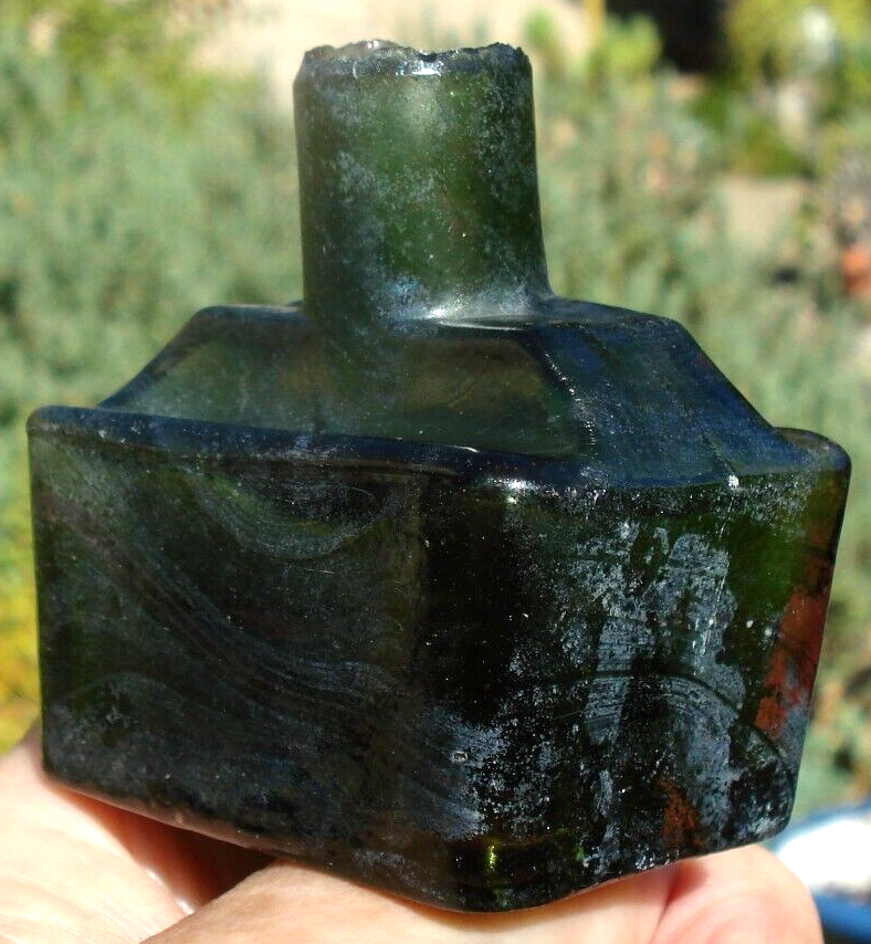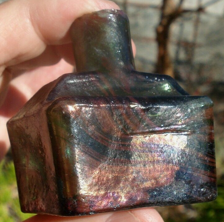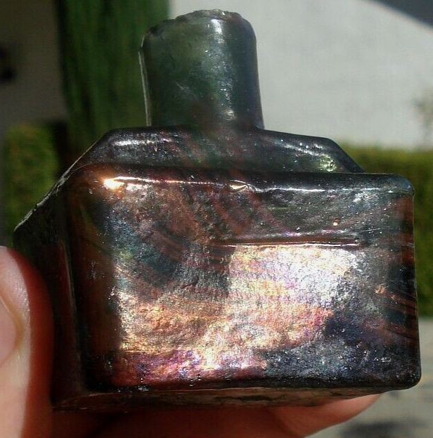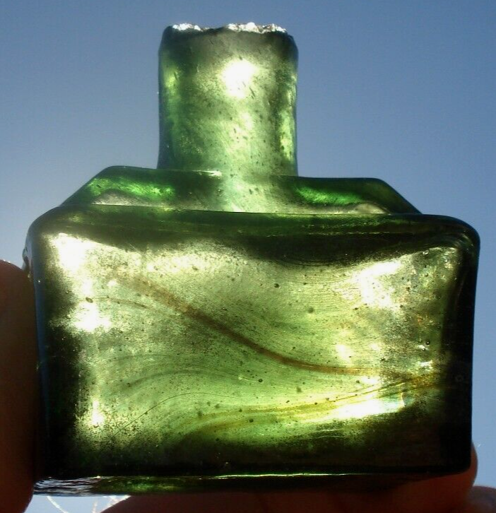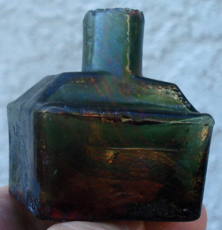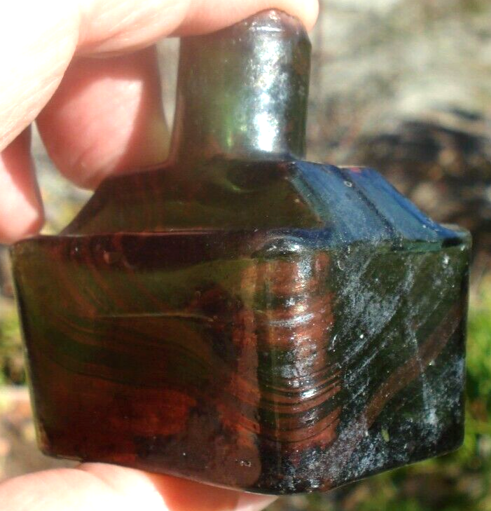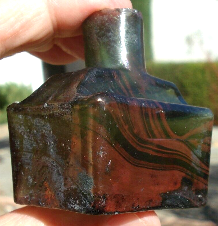 Antique, sheared lip, “boat ink” glass bottle with indentations for two pens with unusual color markings against a green background. The bottle has swathes of striated coloration on about one-half of the bottle. Unable to determine if this unusual coloration is inside or outside of the glass. It has an outer sheen of cloudiness. When the striated lines are held to the light, it shows iridescence. Otherwise, it shows an orange-red pattern. The bottle is free from cracks or chips.