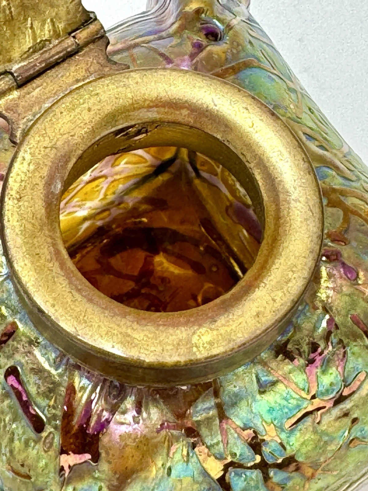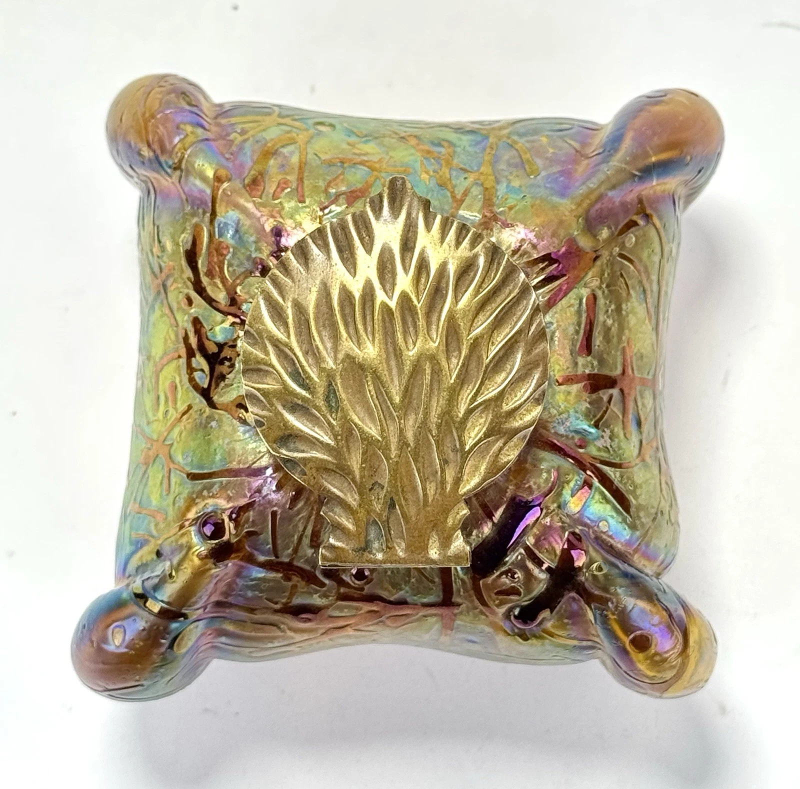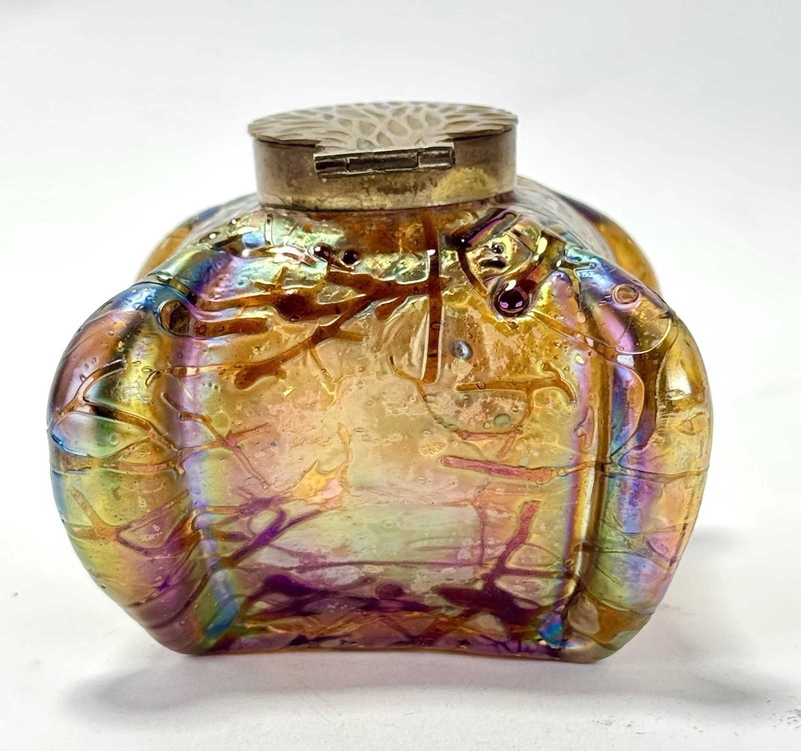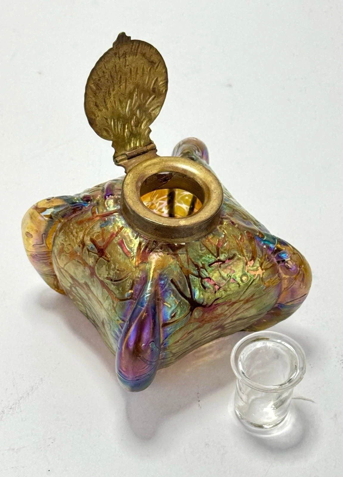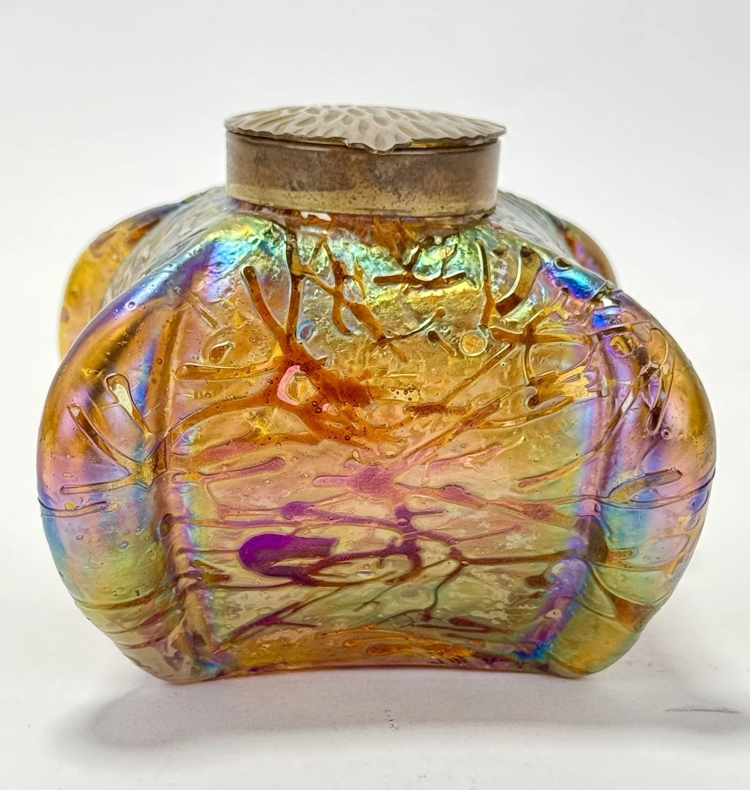 - Loetz: Their metal mounts were often more elaborate, sometimes made of silver or silver-plated pewter, and frequently designed by specific artists like Kolo Moser. Loetz inkwells are less likely to have these standard relief-cast brass leaf lids.