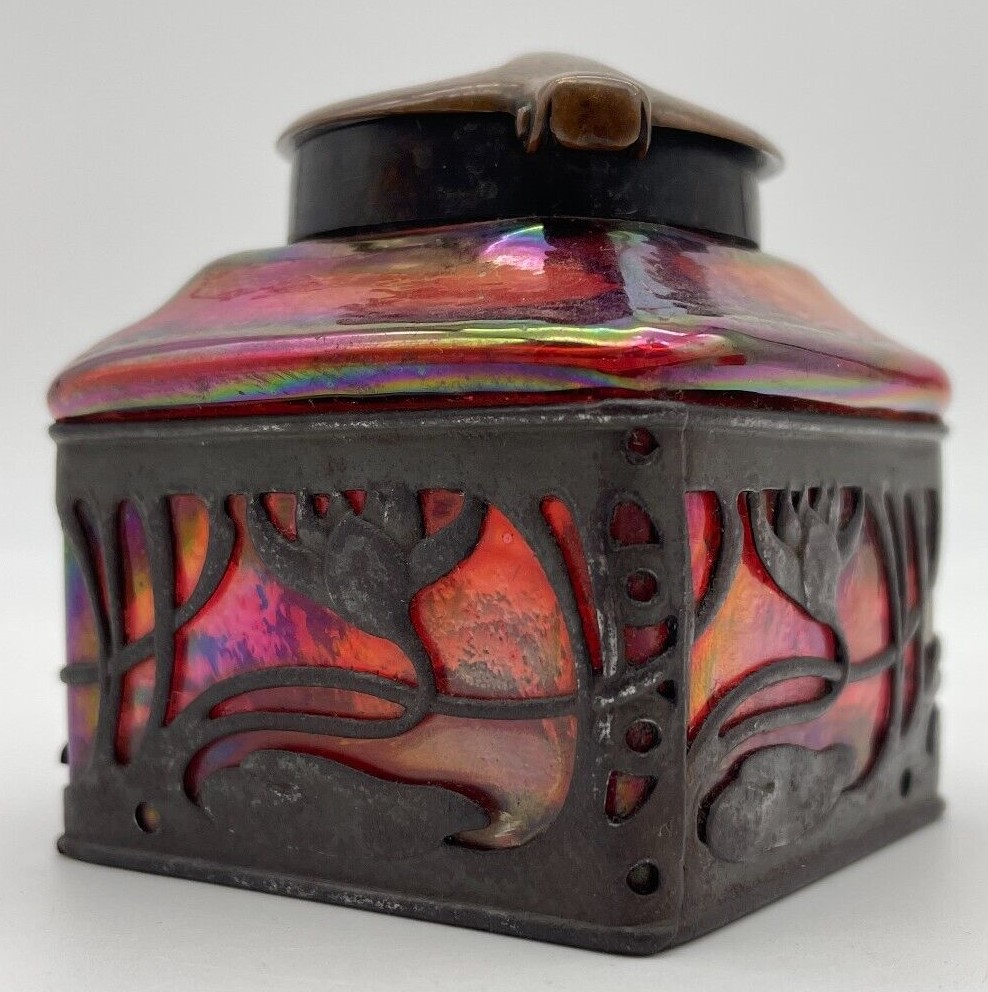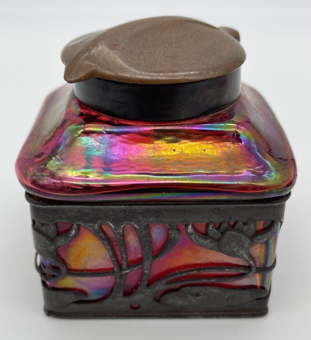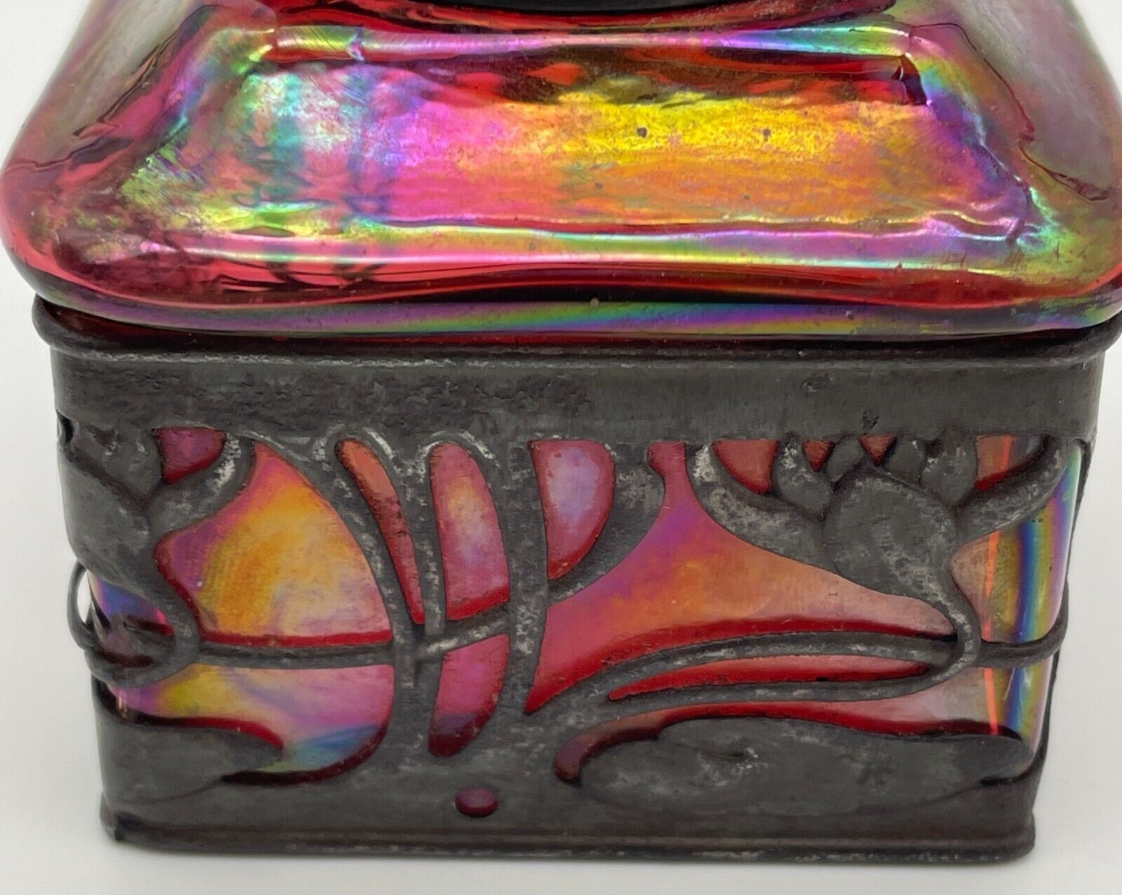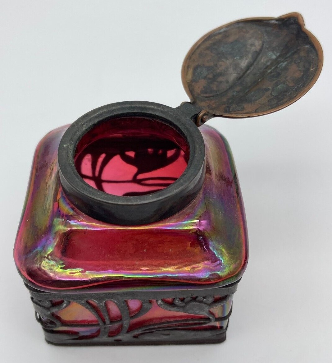 Stunning iridescent red glass inkwell with metal overlay. There is some damage to the metal work.
