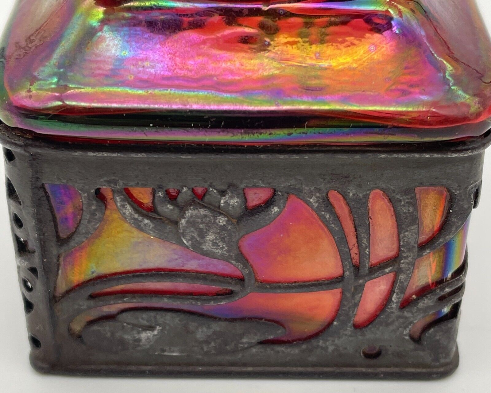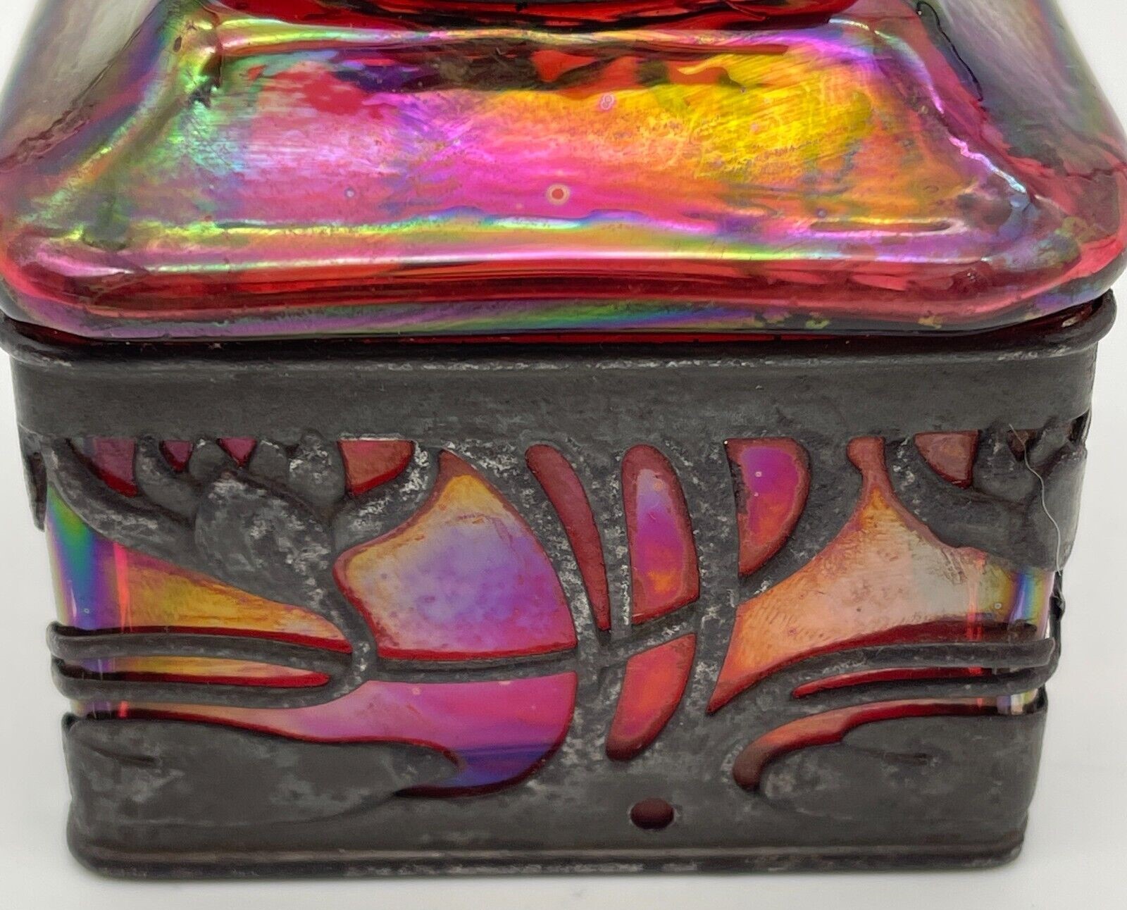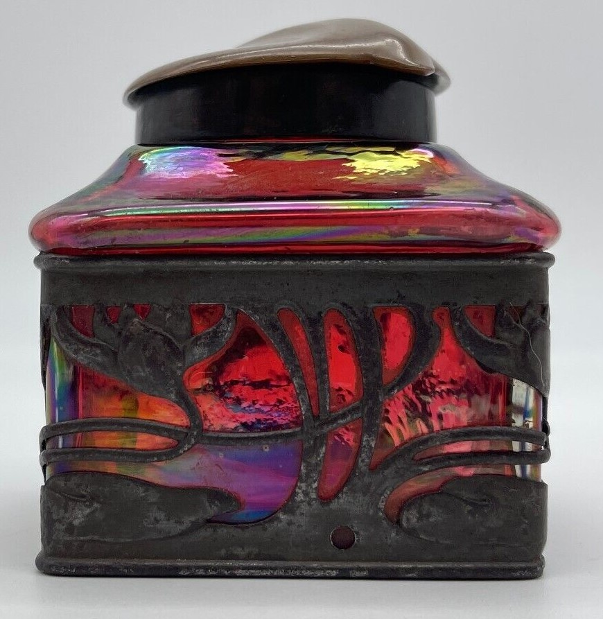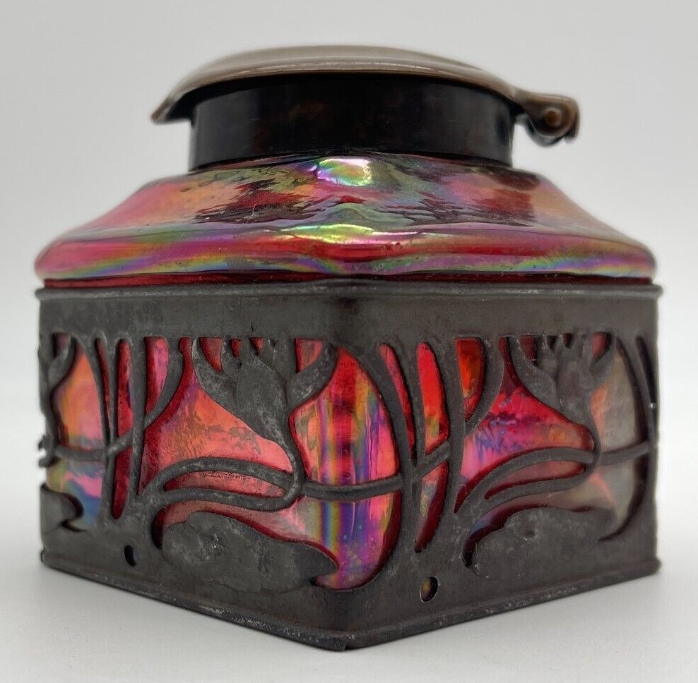 Stunning iridescent red glass inkwell with metal overlay. There is some damage to the metal work.