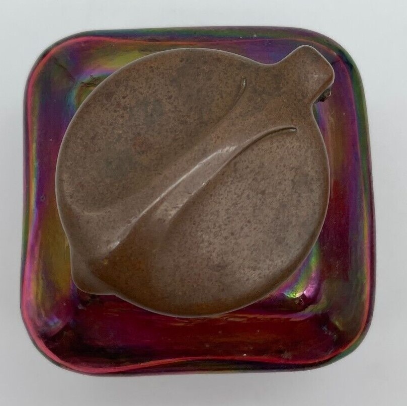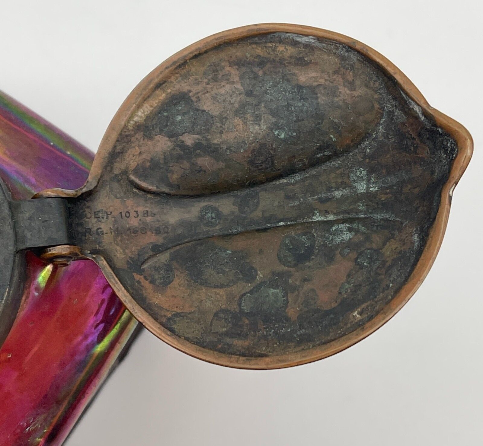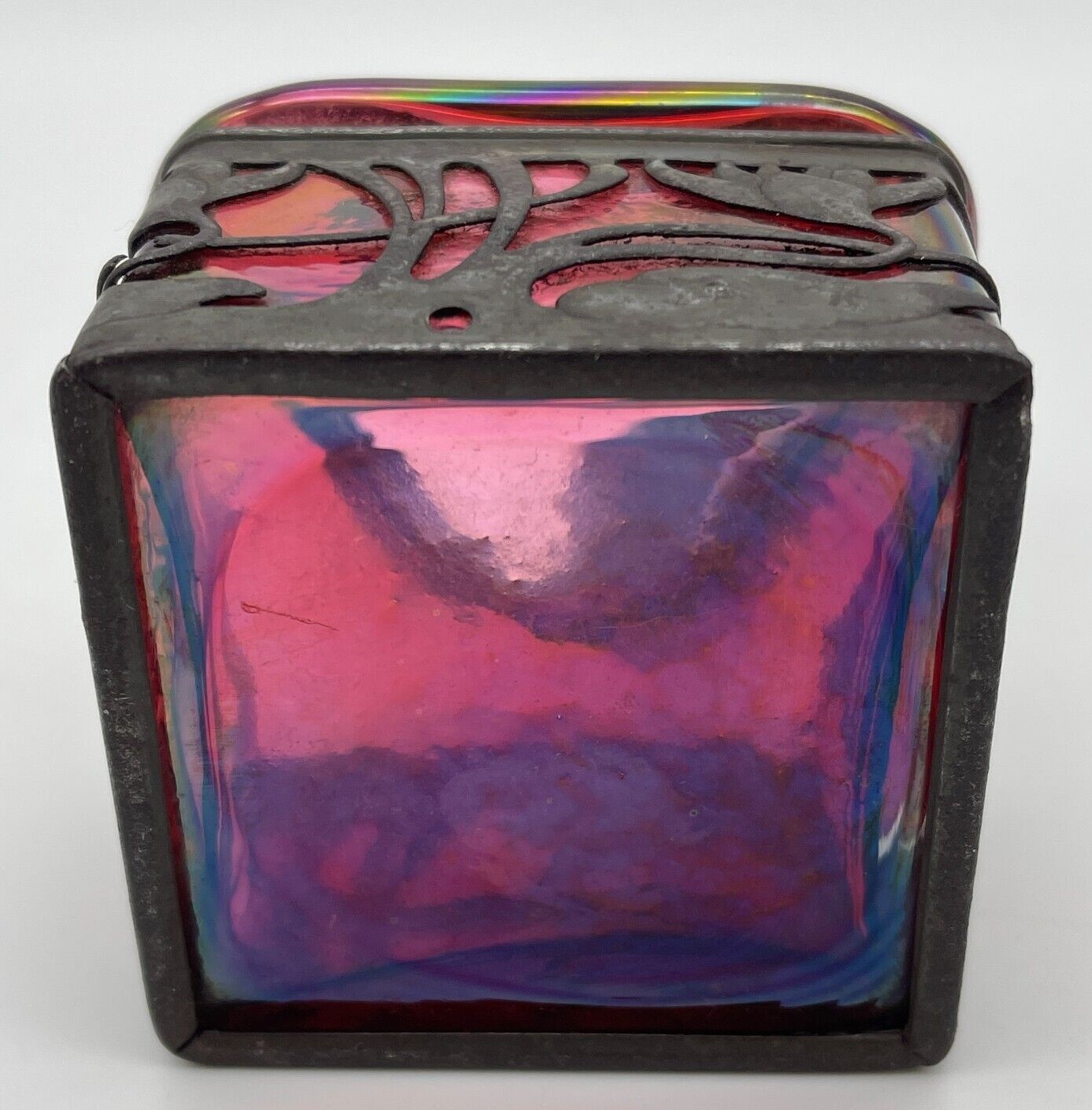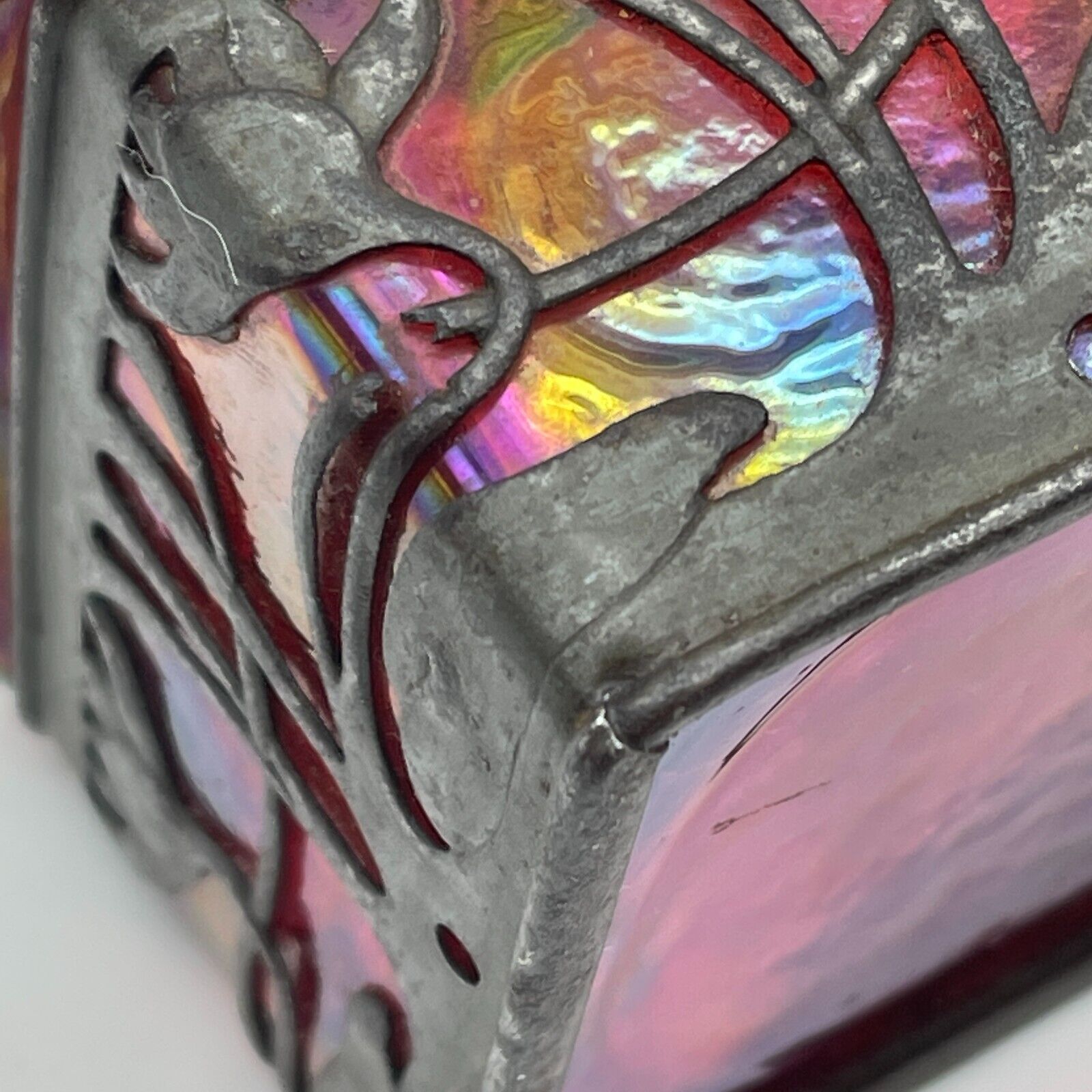 Stunning iridescent red glass inkwell with metal overlay. There is some damage to the metal work.