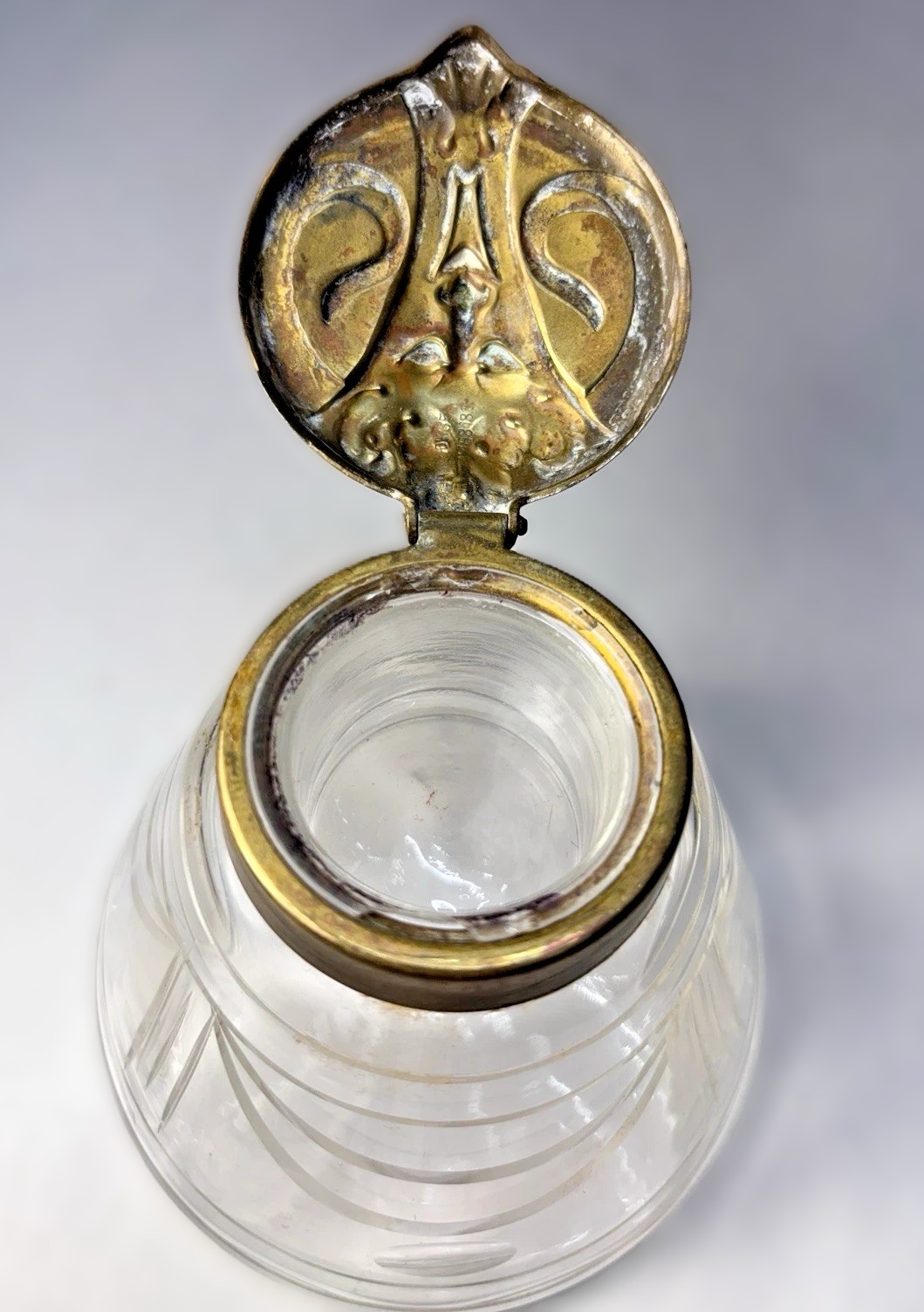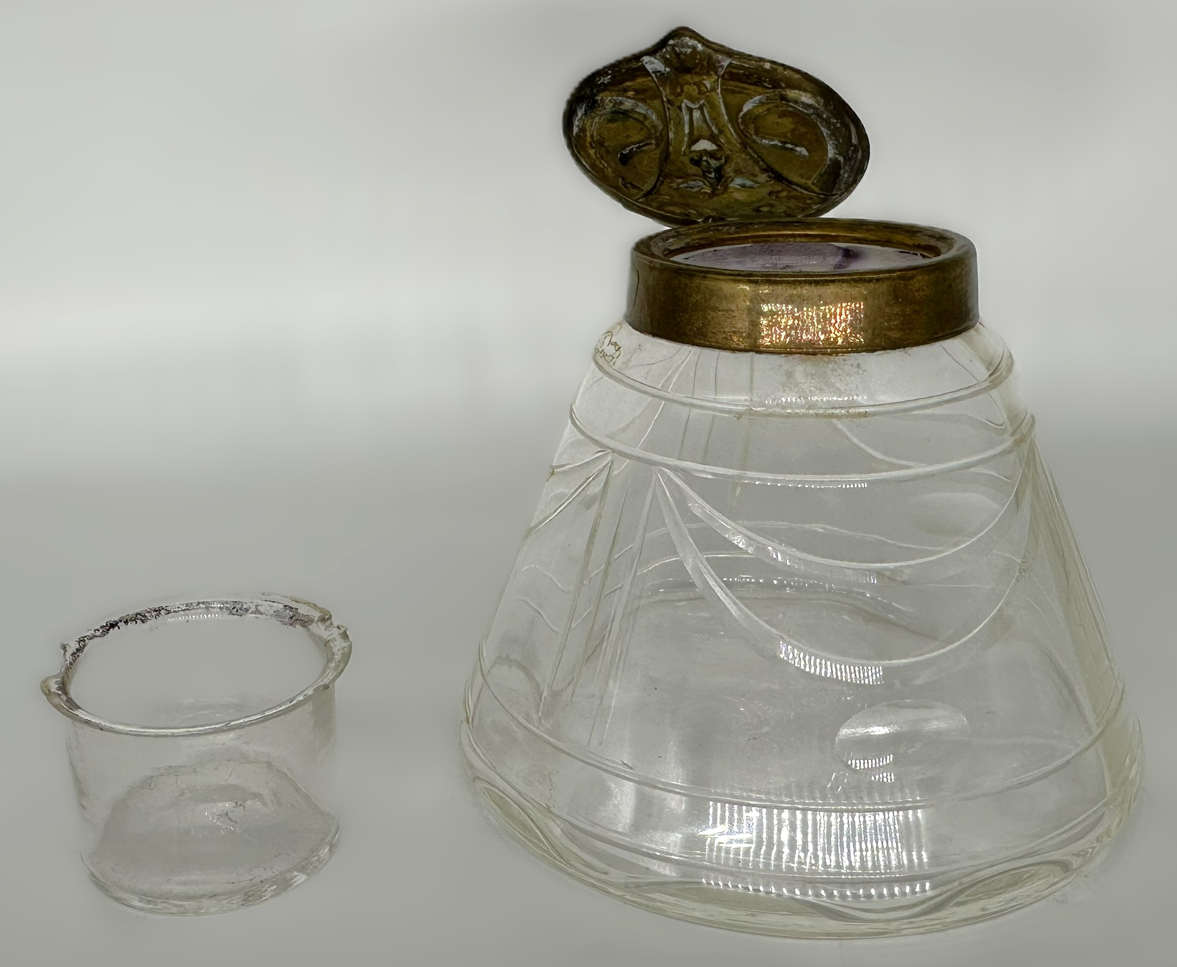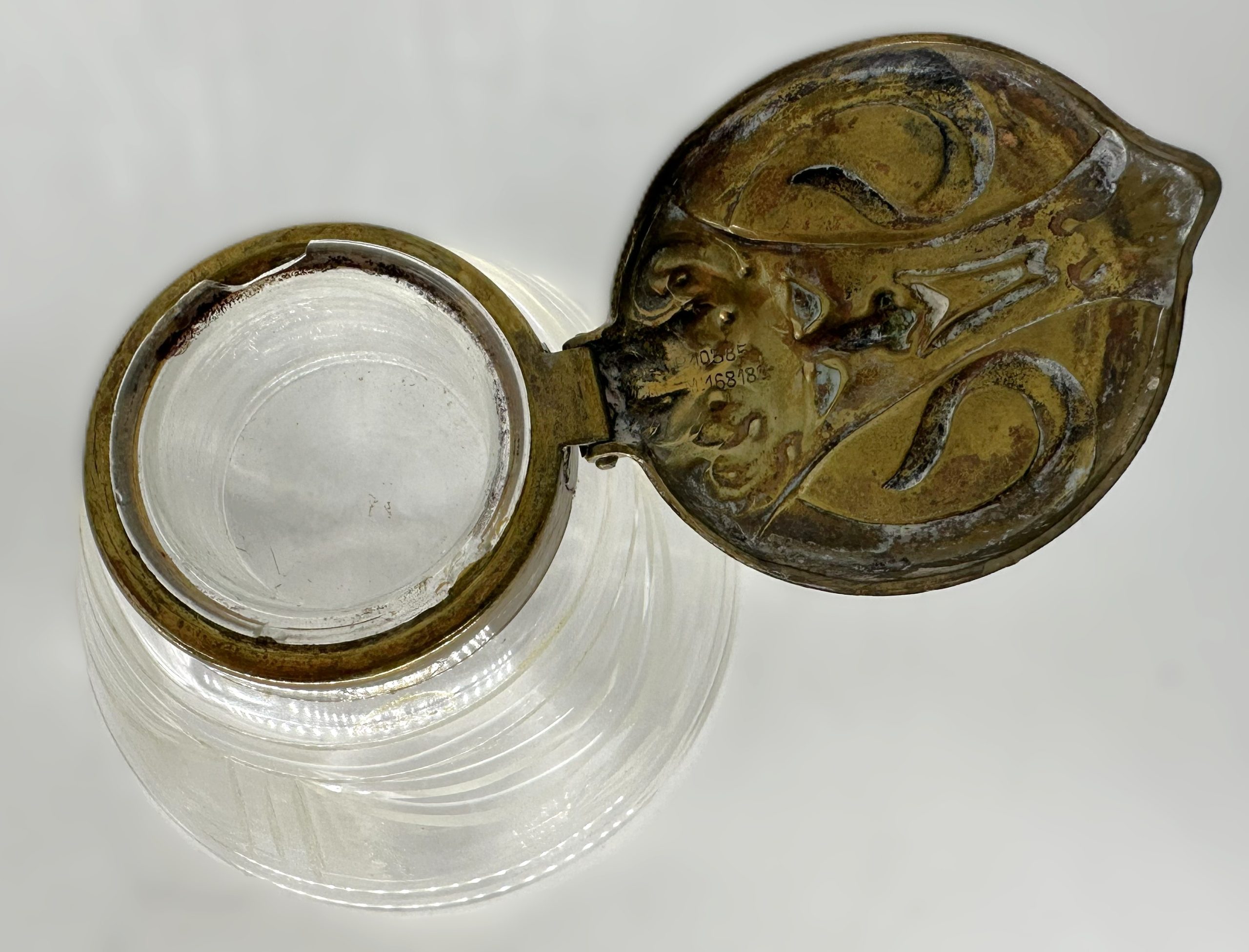 Attributed to: Stölzle & Sons (Suchenthal Factory) Period: Circa 1901–1905 Material: Mold-blown clear glass with a patinated brass/bronze-finish hinged lid.