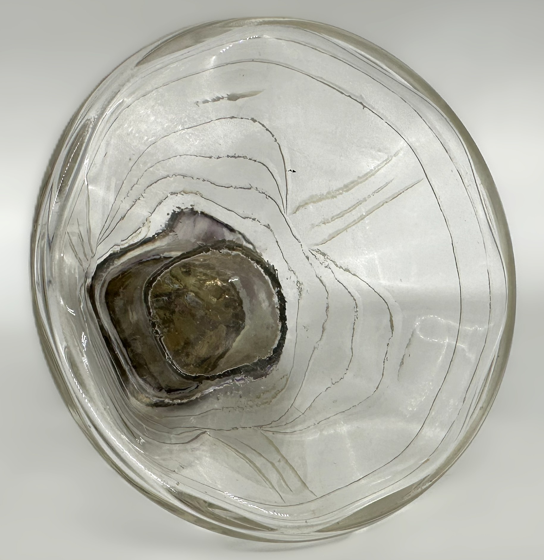 Looking through the bottom, you can see the thickness and clarity of the glass. The “wavy” internal lines suggest this was mold-blown rather than pressed, which gives the glass its characteristic Bohemian brilliance and fire when it catches the light.