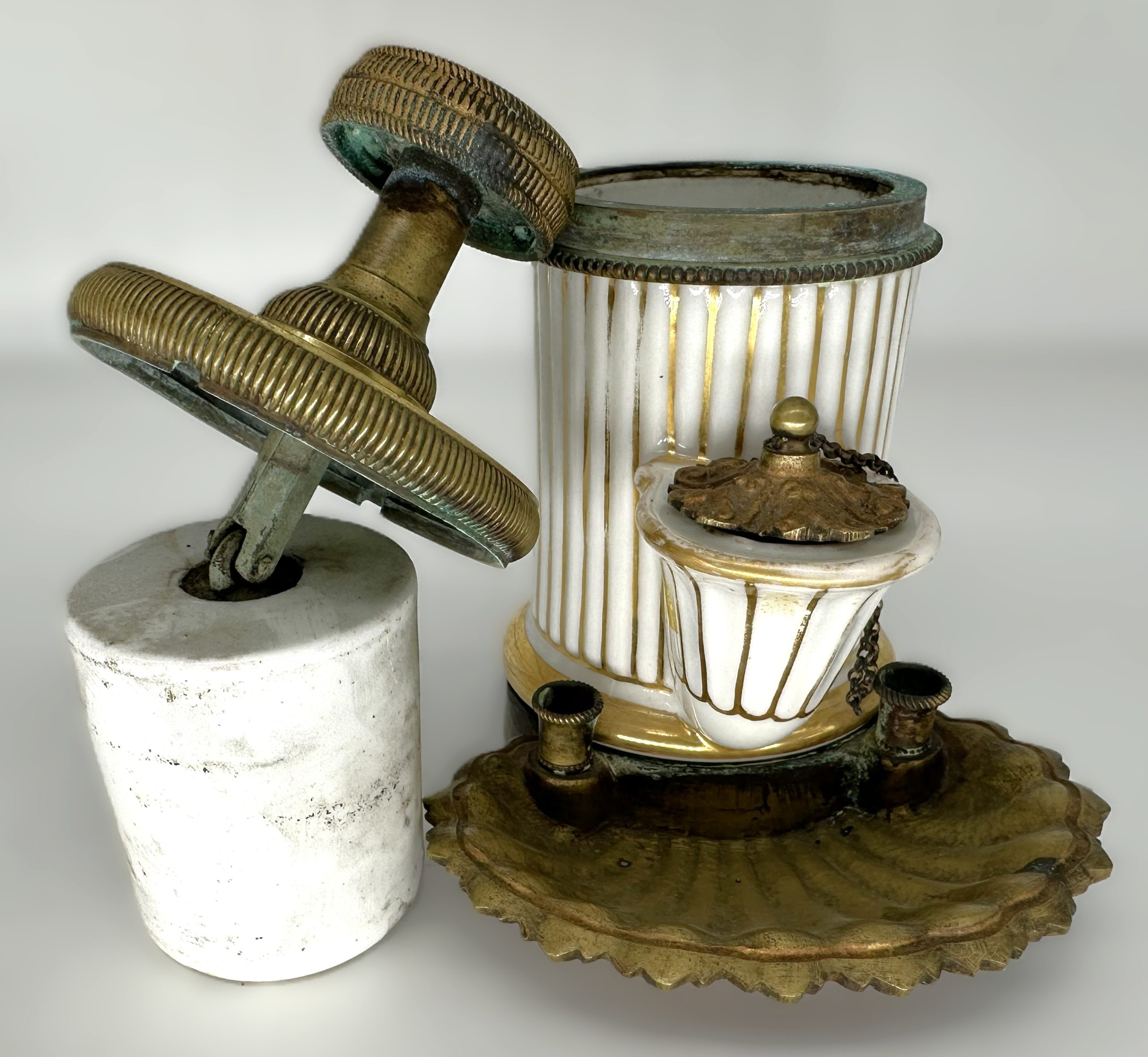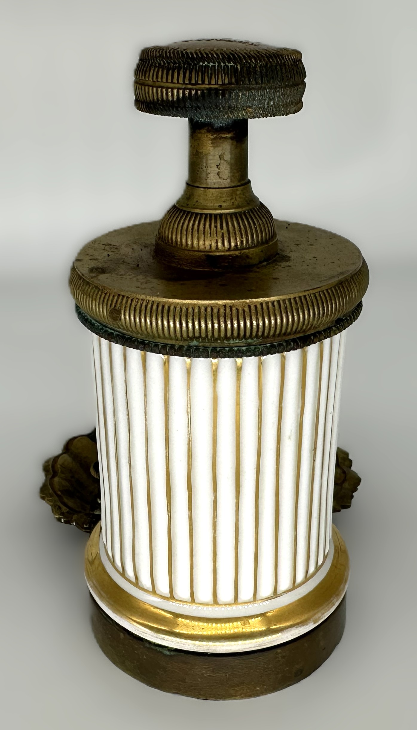 The inkstand is constructed from white porcelain decorated with vertical gold-leaf fluting, giving it a neoclassical, columnar appearance.