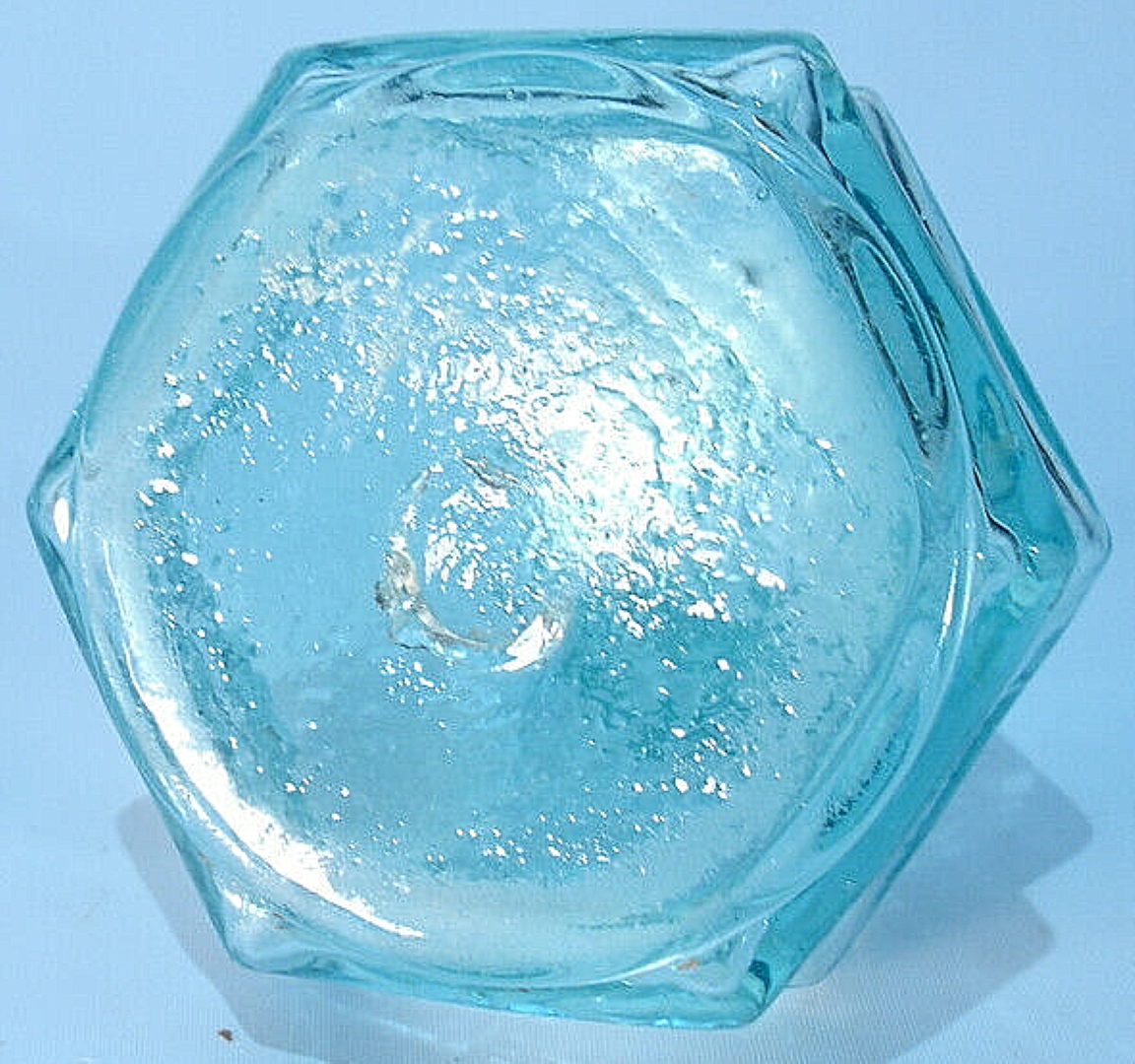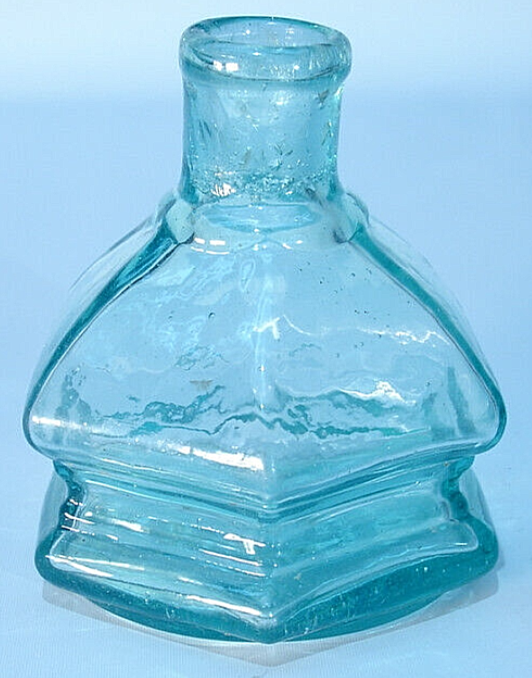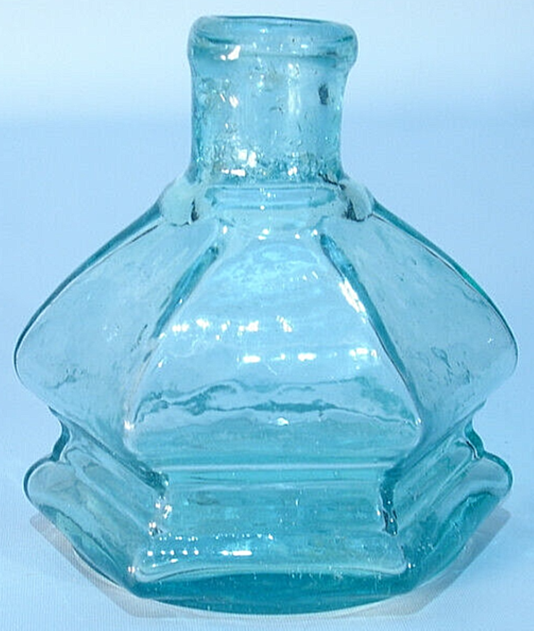 This is an aqua, 6-sided, pontiled, rolled lip ink bottle. It is embossed “BOSS PATENT” and has no chips, cracks, or stain. A rare pontiled ink.