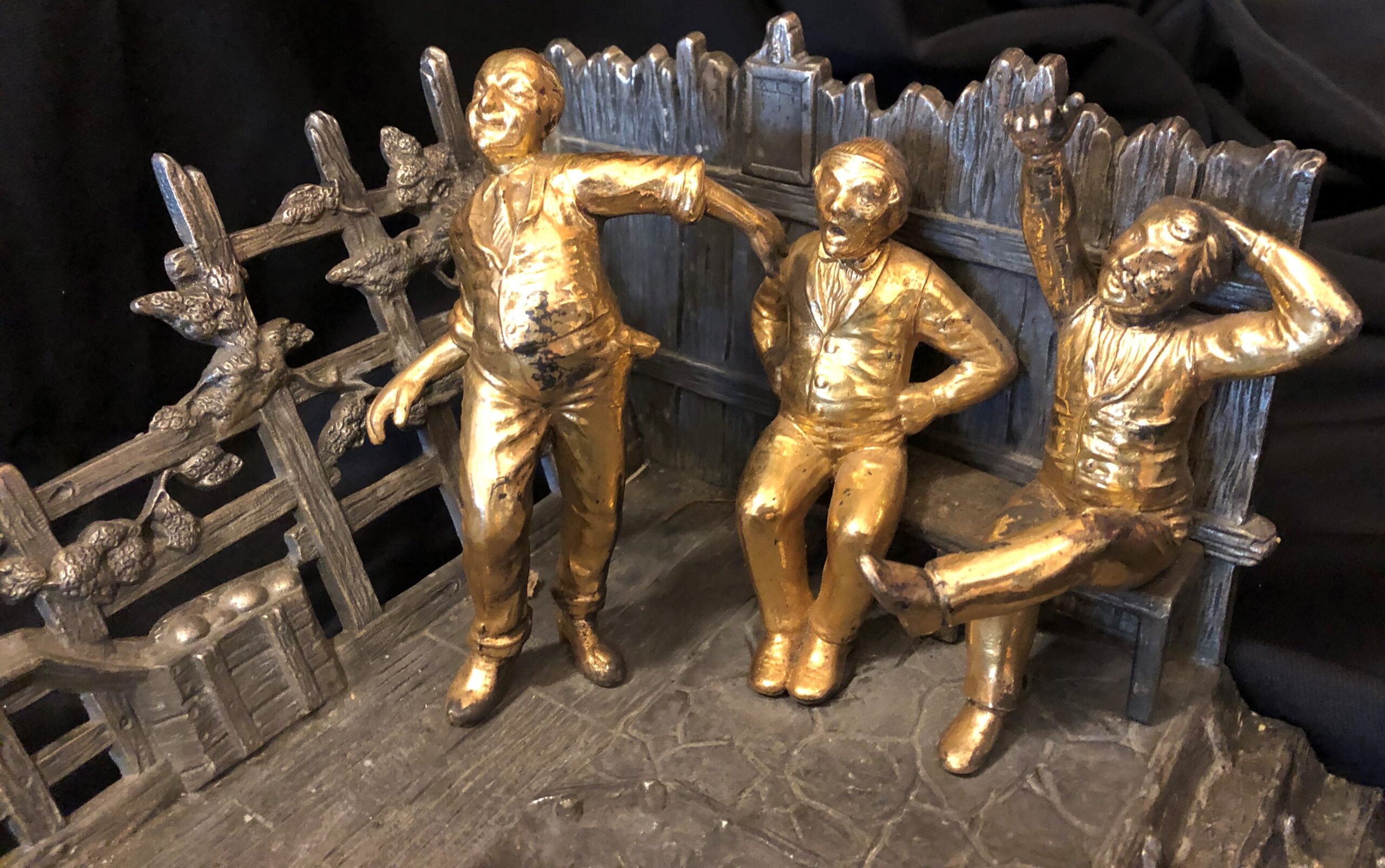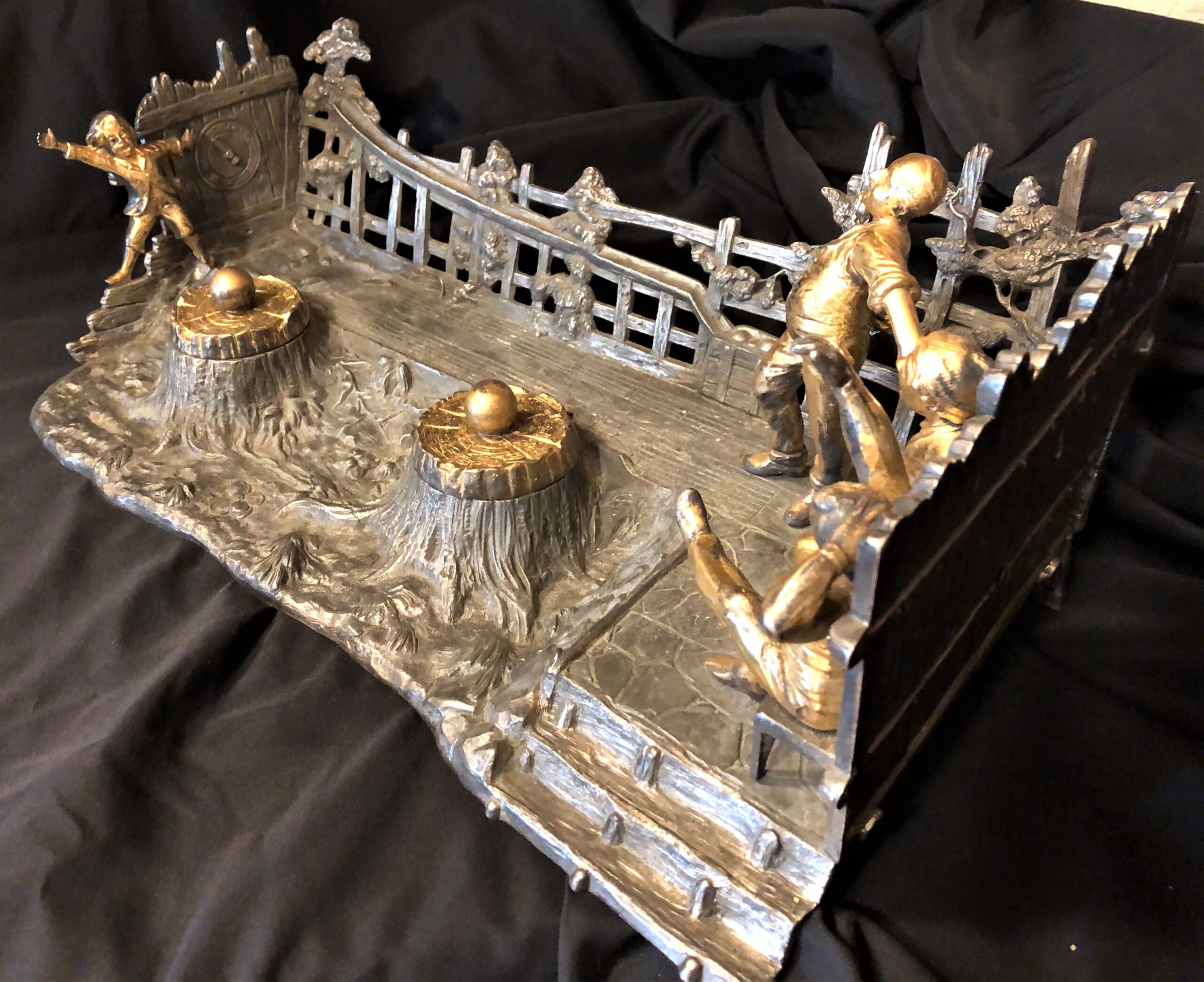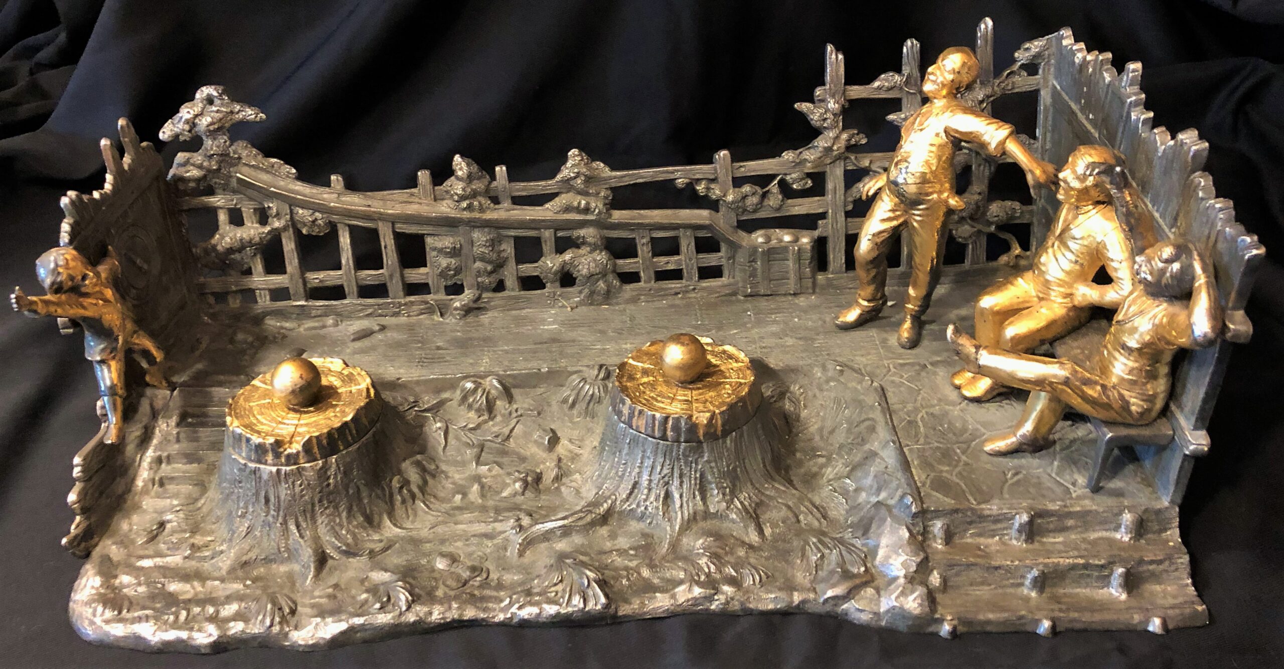 This large inkstand depicts men and boy playing a lawn game – 9 Pin bowling. The figures are gold-plated. One gentleman has just bowled. Another looks in astonishment. The third lifts his hand cheering. At the other end is a young boy, the pinsetter. 9 pins have fallen, and the mounted counter points to 9.