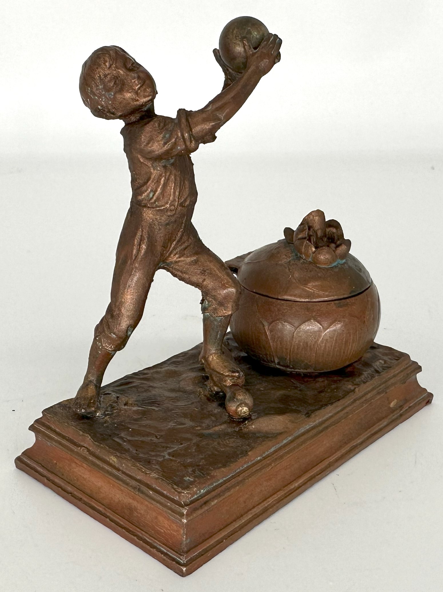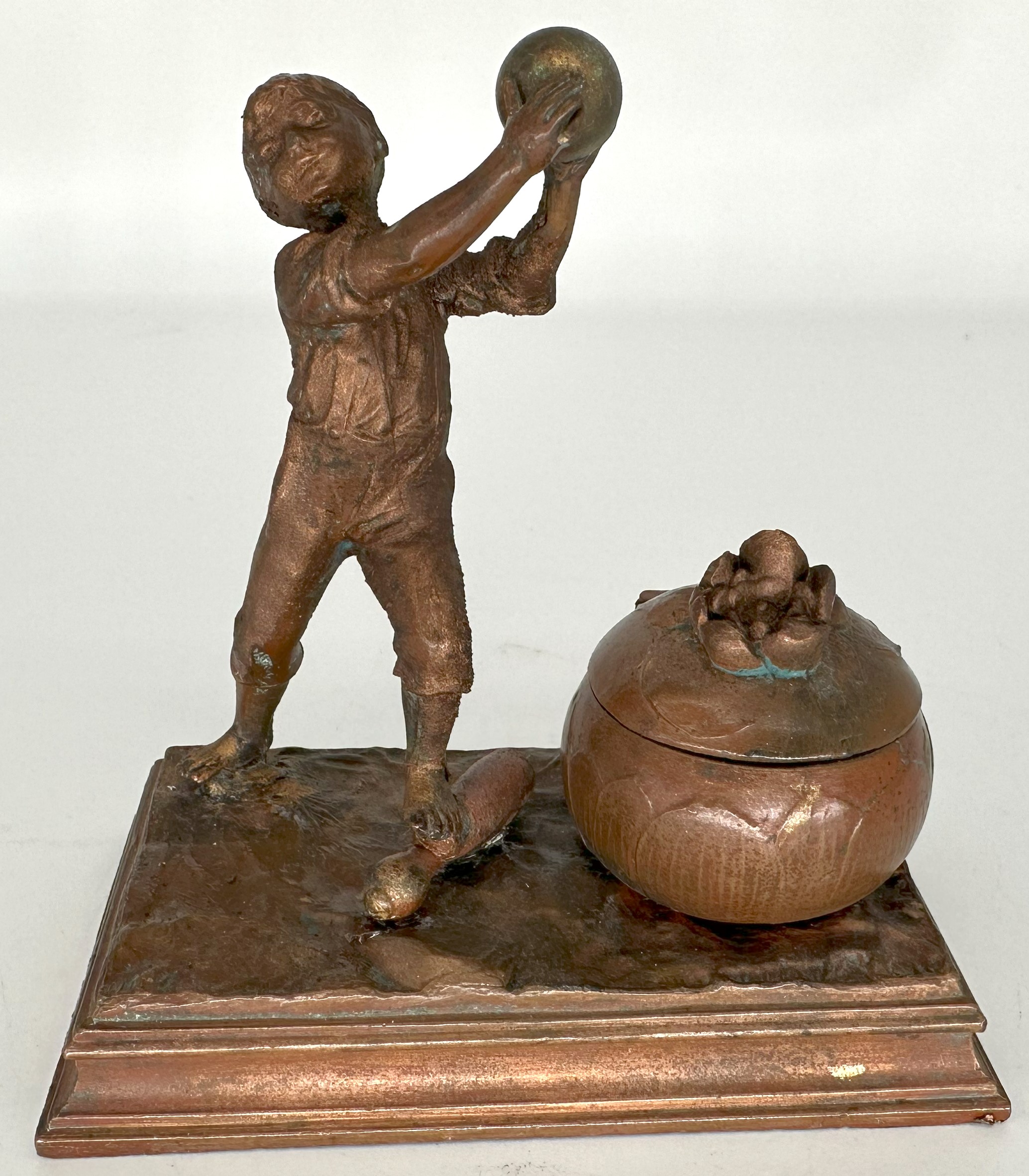 This inkstand features a barefoot boy holding up a ball, presumed to be a bowling ball because the boy’s foot rests atop a bowling kegel.