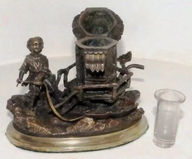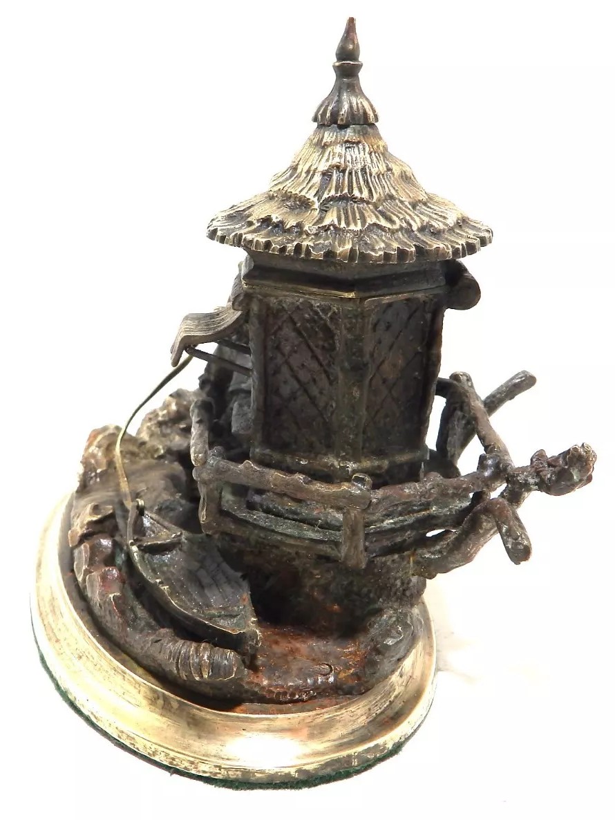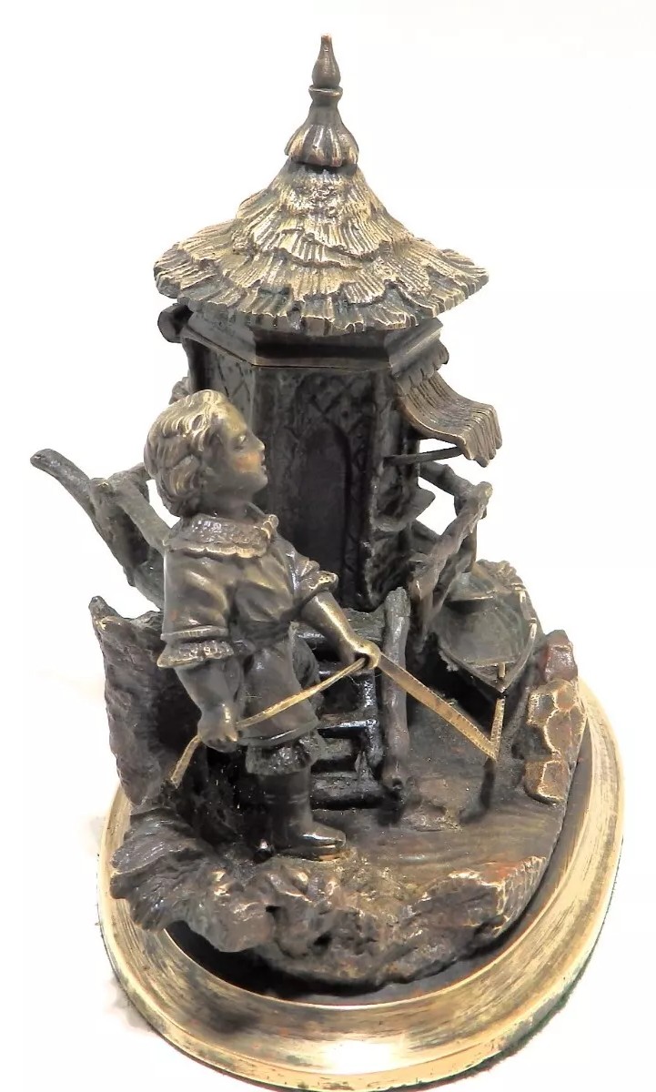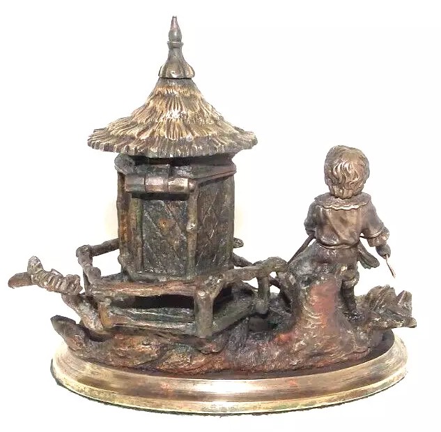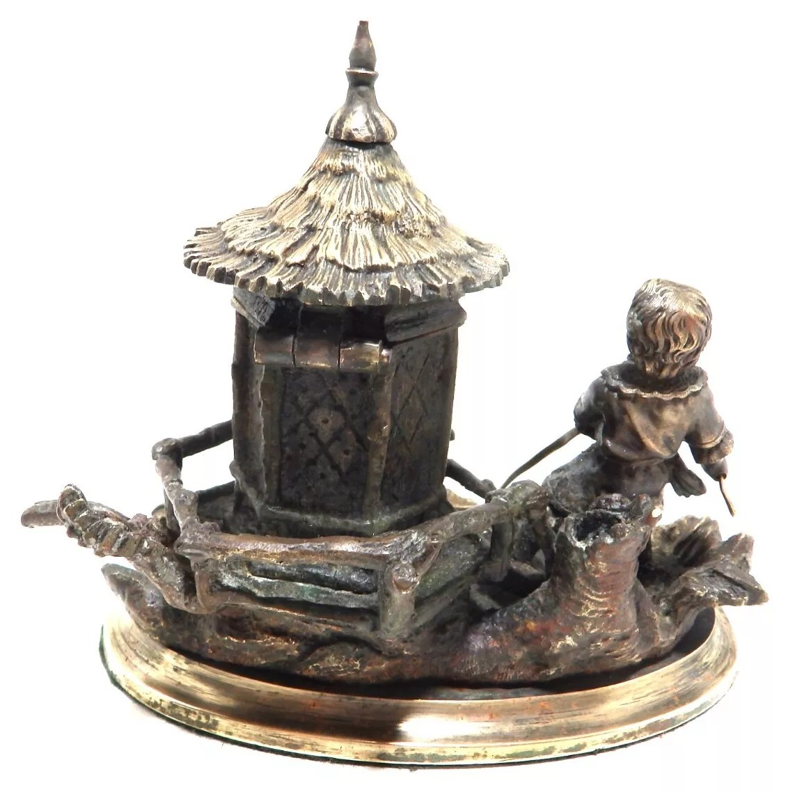 This inkstand features a charming and detailed sculptural scene. It portrays a boy standing beside a small hut on a rocky base, holding a rope that pulls a toy boat. The boy is dressed in period-style clothing. Adjacent to the boy is a rustic hut with a thatched roof and textured walls evoke a quaint, countryside feeling. The hinged roof of the hut cleverly conceals the inkwell within. The entire piece is mounted on a circular base.