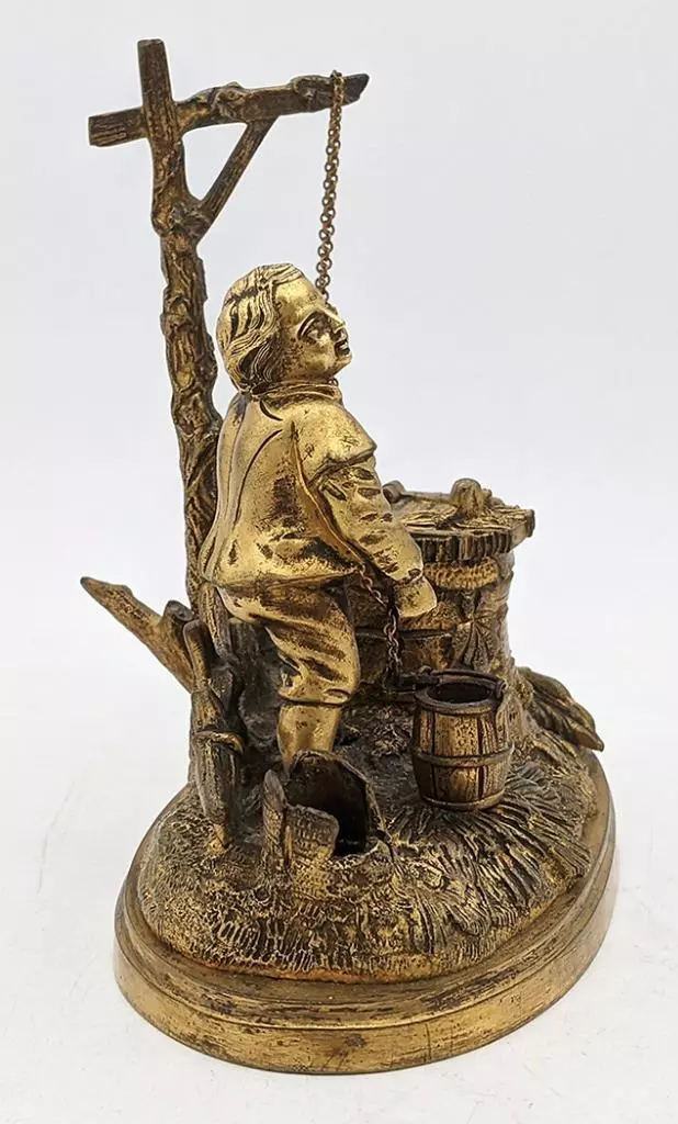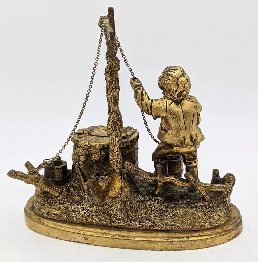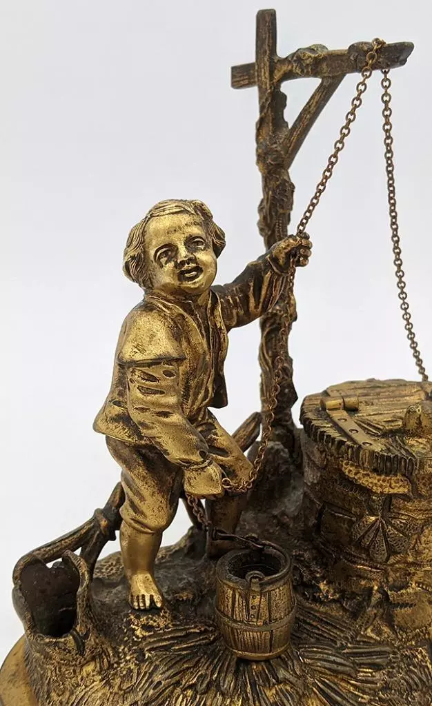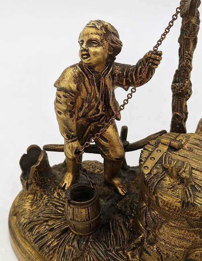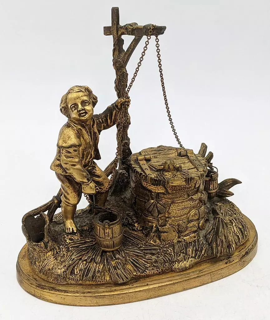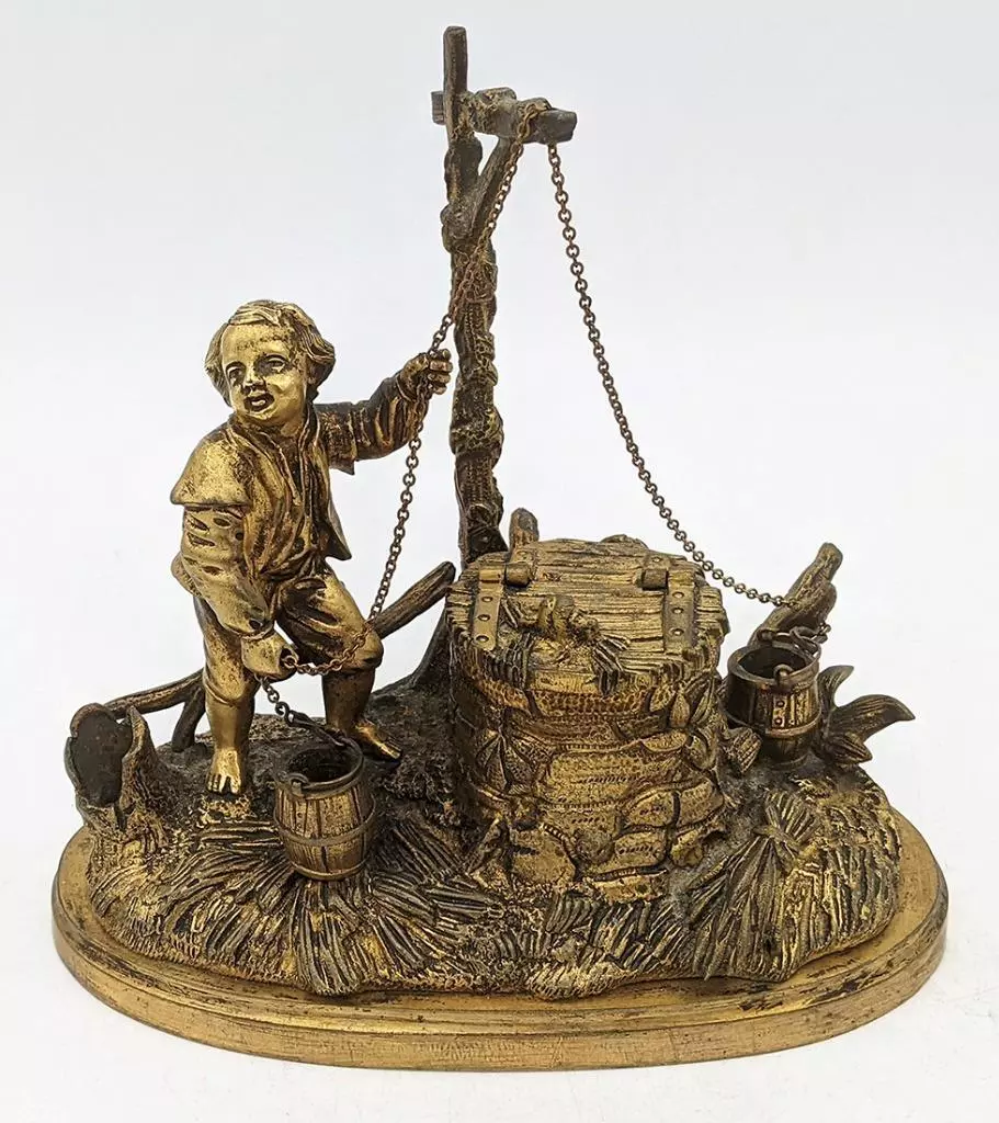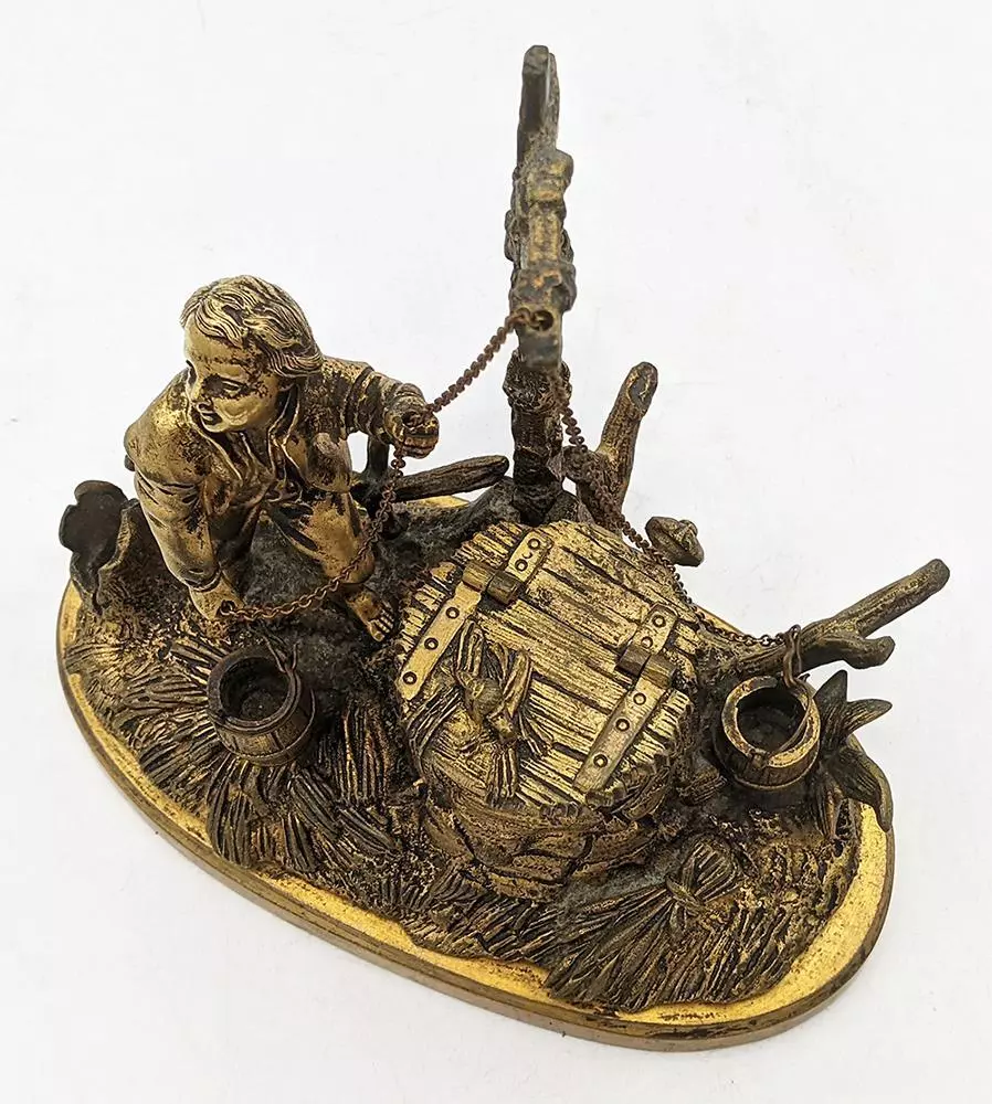 This French gilt bronze inkstand depicts a boy retrieving water from a well. The well itself conceals the inkwell.
