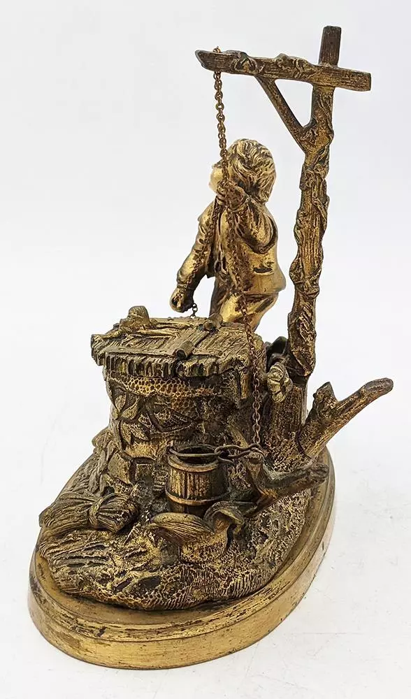 • Figural Representation: A young boy is depicted in gilt bronze, posed as if he is pulling a bucket of water from the well.