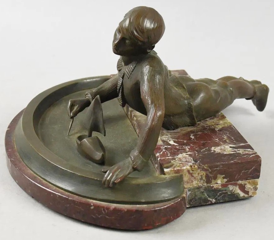 This bronze inkstand features a boy lying on his stomach, engrossed in playing with a sailboat. The boy’s school bag, positioned beside him, is hinged, allowing it to open and reveal the inkwell inside. The entire scene is set on a round base made of marble.