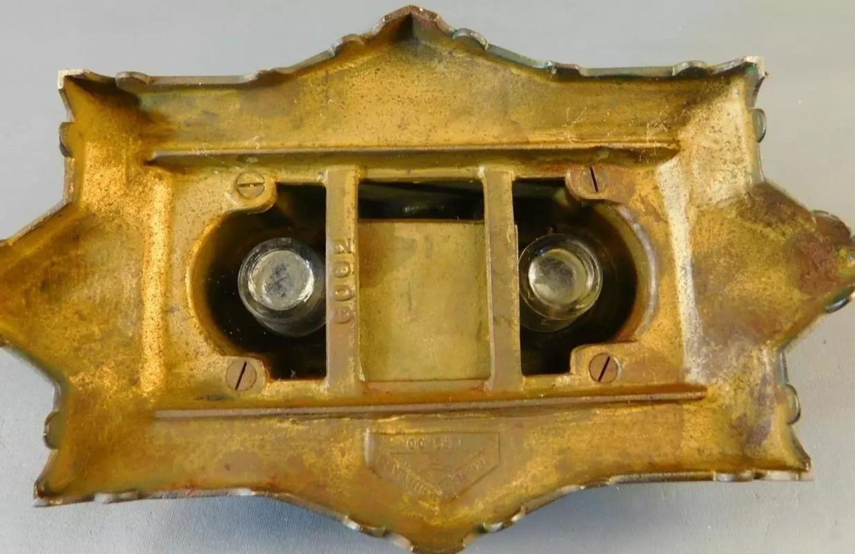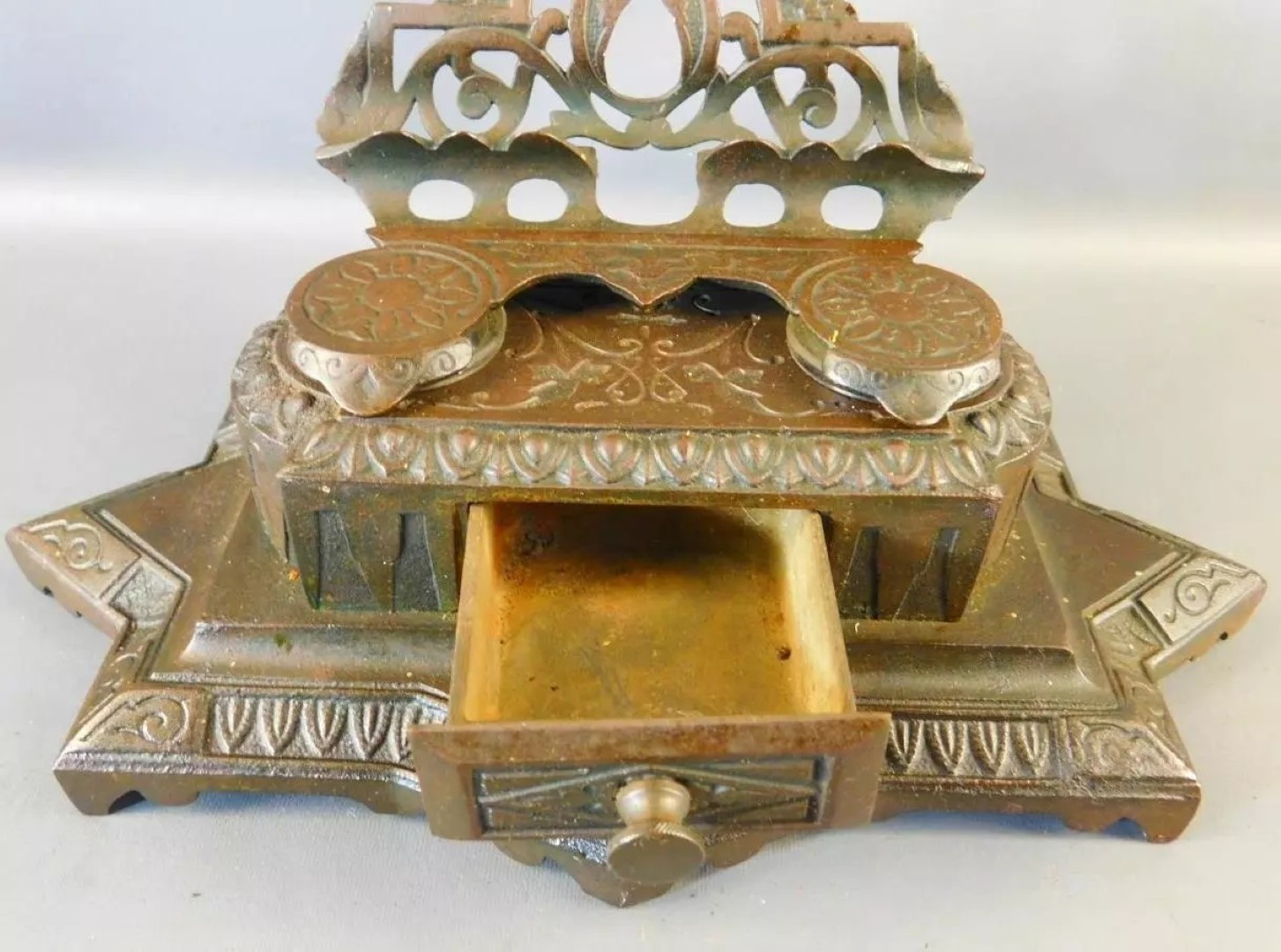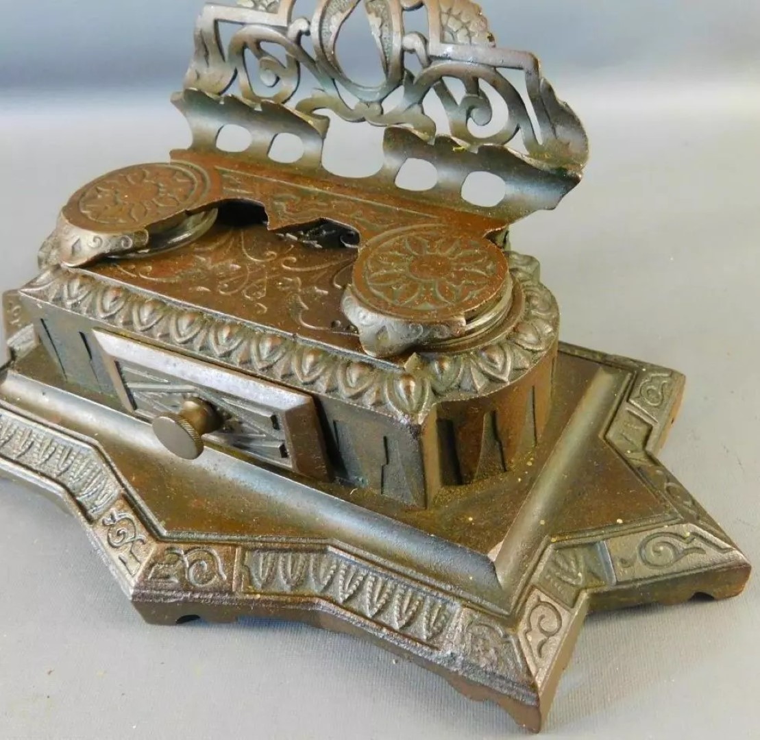 This Bradley & Hubbard cast brass inkstand features an ornate design with intricate geometric patterns. The base of the inkstand is shaped as a parallelogram, with opposite sides that are equal with matching star point projections at the corners and in the center. The hinged top with a pen holder tilts back to reveal two inkwells. There is a pull-out drawer for stamps, nibs, etc. in the center. The base is marked with the number 6062.