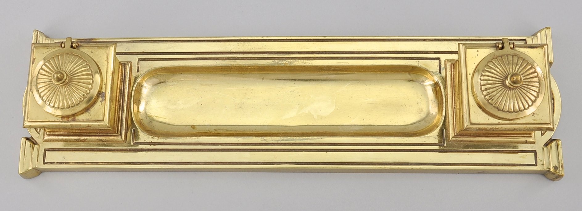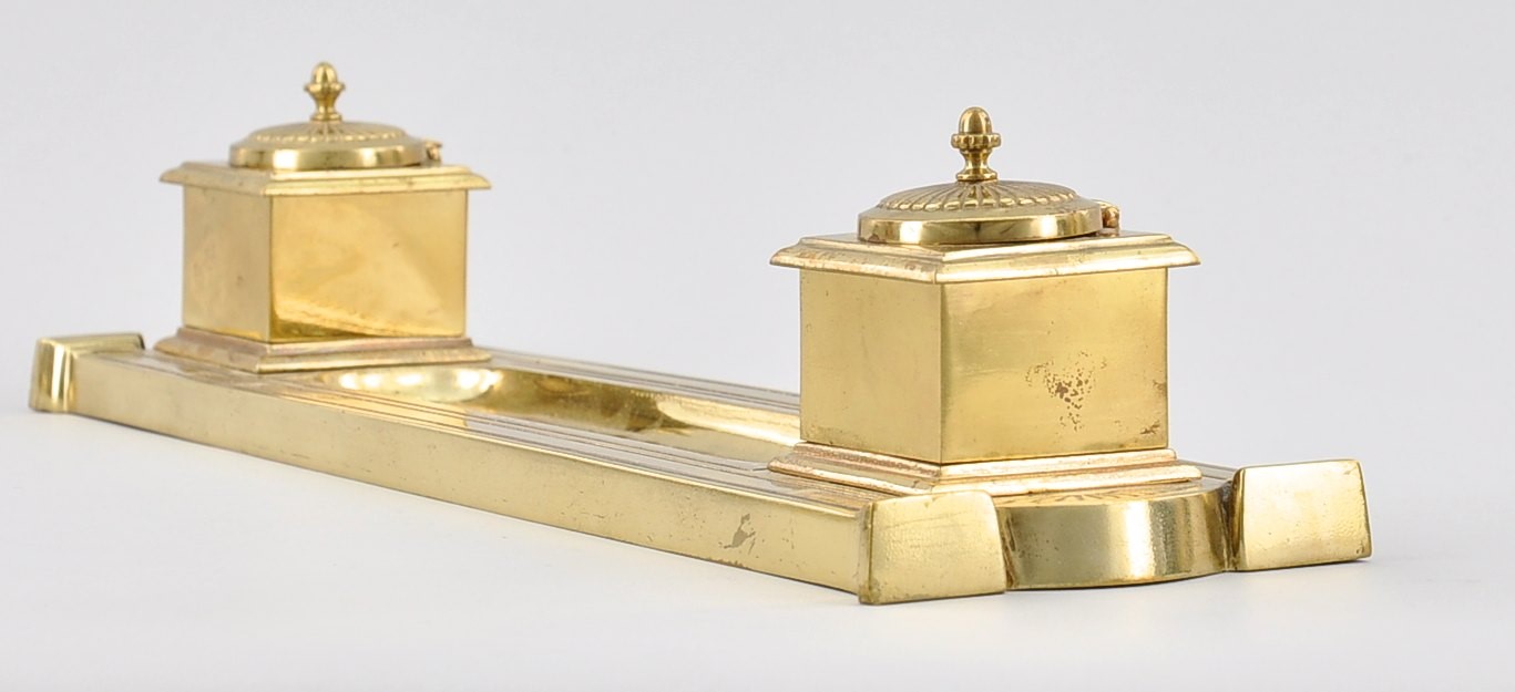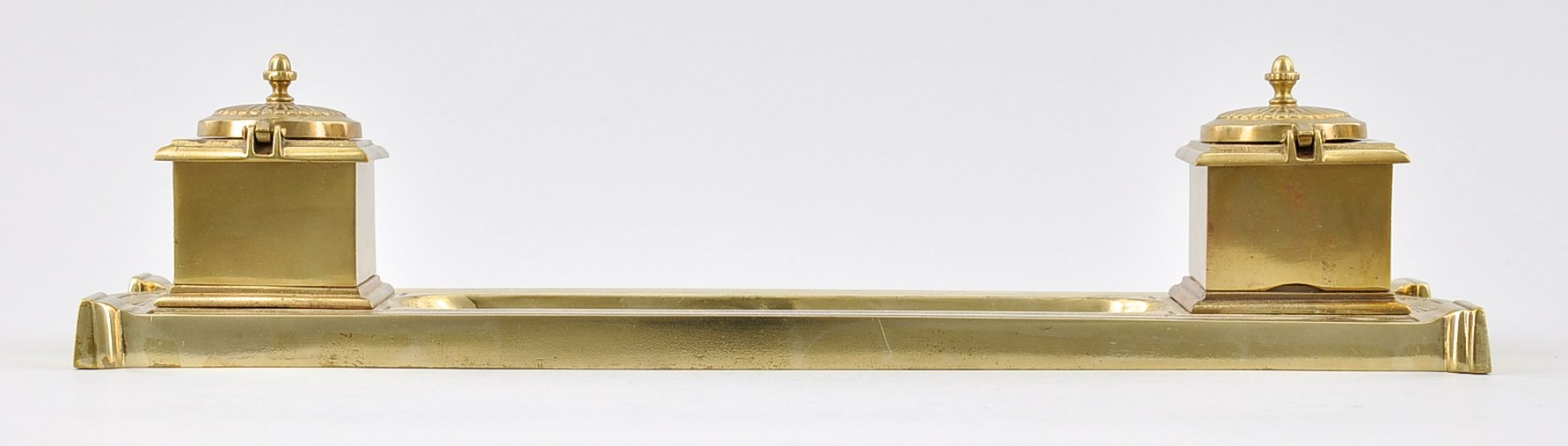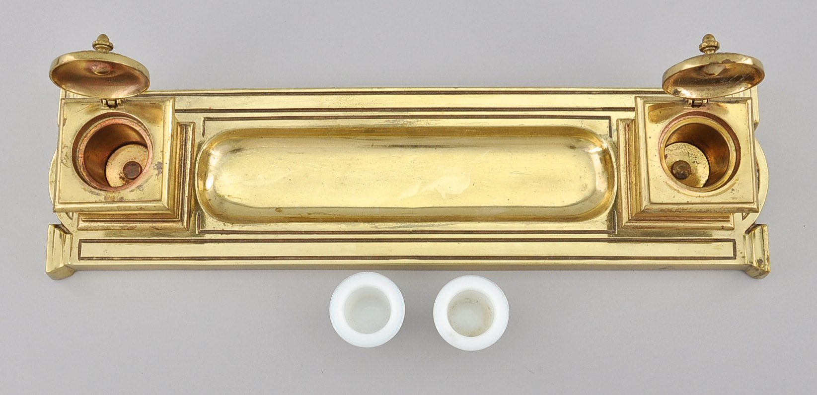 This polished brass inkstand has two inkwells with hinged lids and milk glass inserts. All is mounted on a simple, but long base, with a center pen tray. Stamped on the underside “Bradley & Hubbard”.