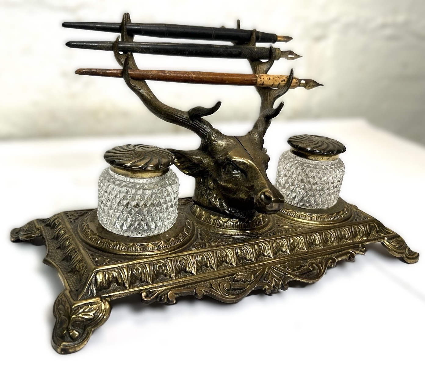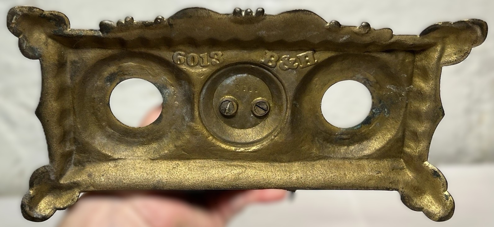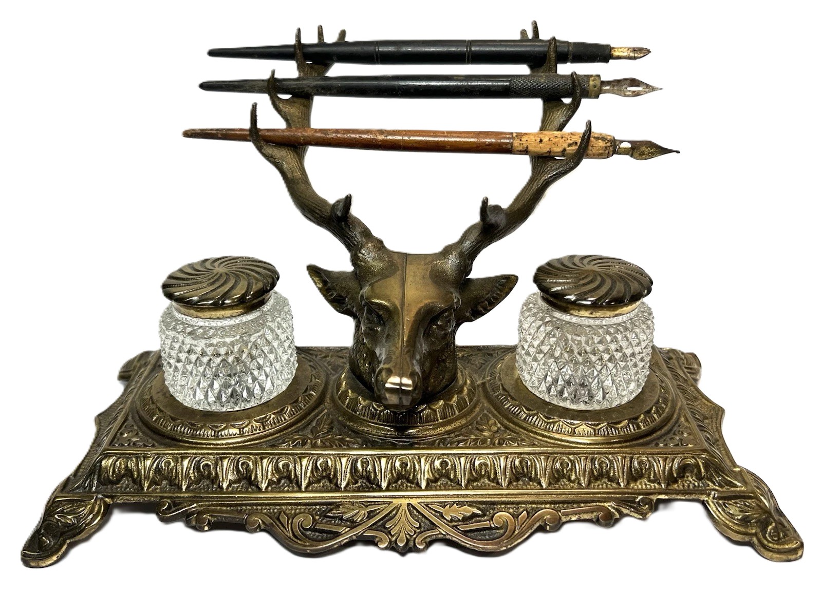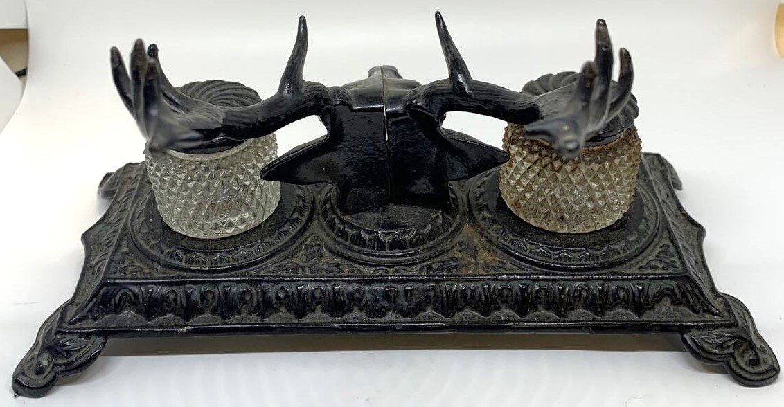 Made by Bradley & Hubbard, this cast-iron double inkstand features a stag’s (elk) head with “pen-rest” antlers. The inkwells are diamond point design pressed glass with lids. Mark “B & H” and numbered 6013.