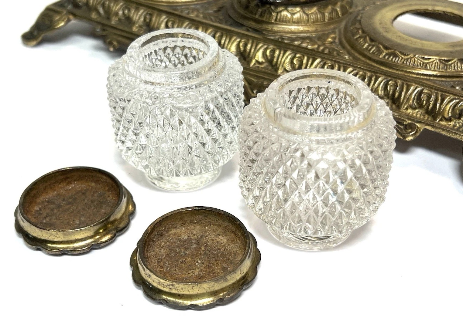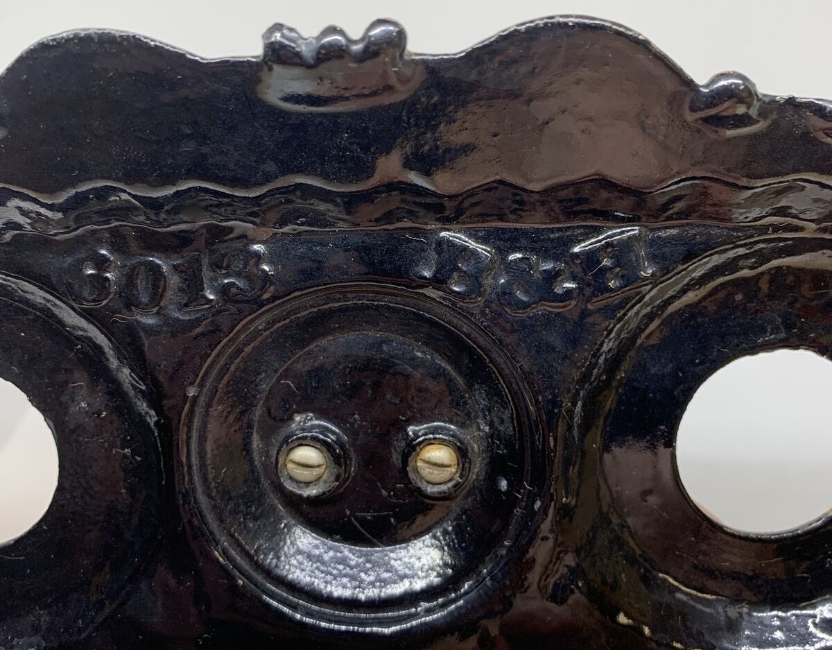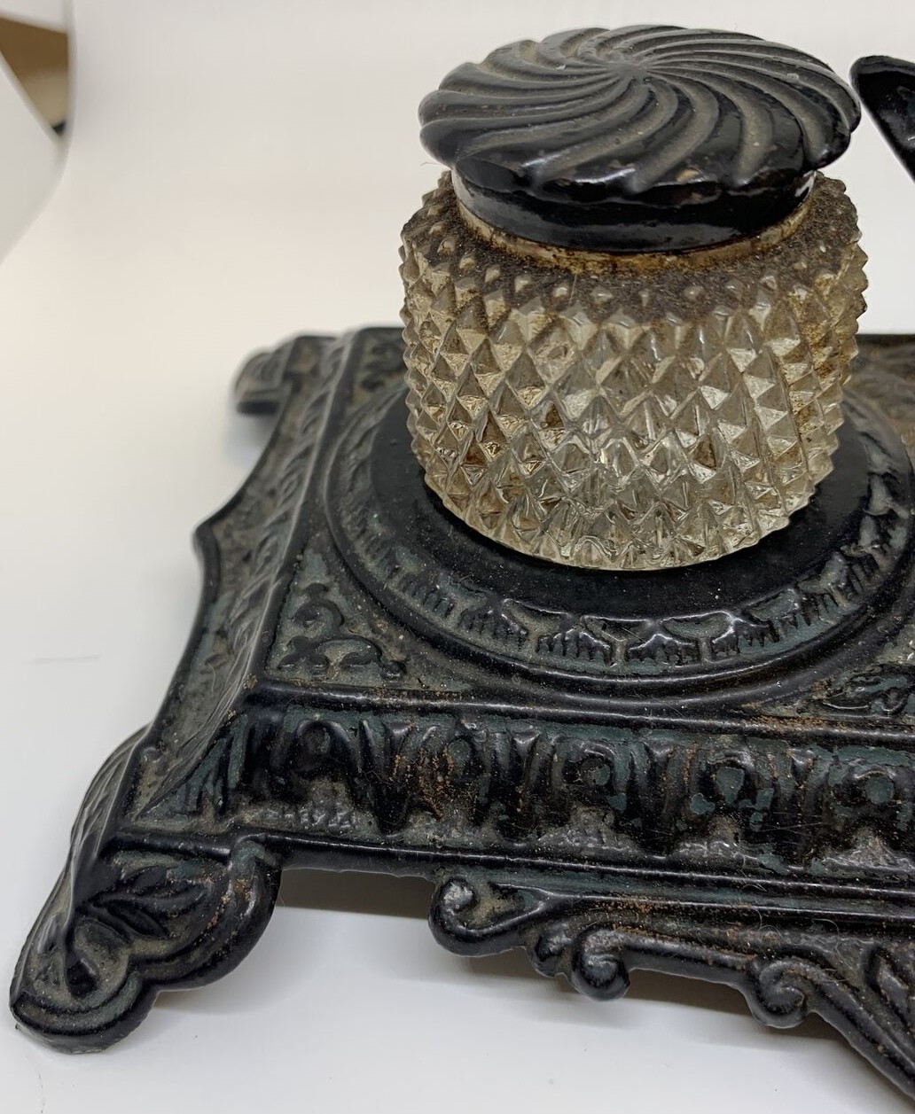 Made by Bradley & Hubbard, this cast-iron double inkstand features a stag’s (elk) head with “pen-rest” antlers. The inkwells are diamond point design pressed glass with lids. Mark “B & H” and numbered 6013.