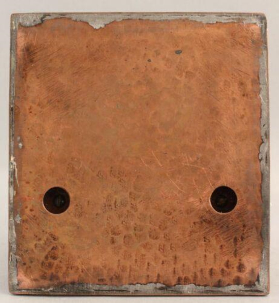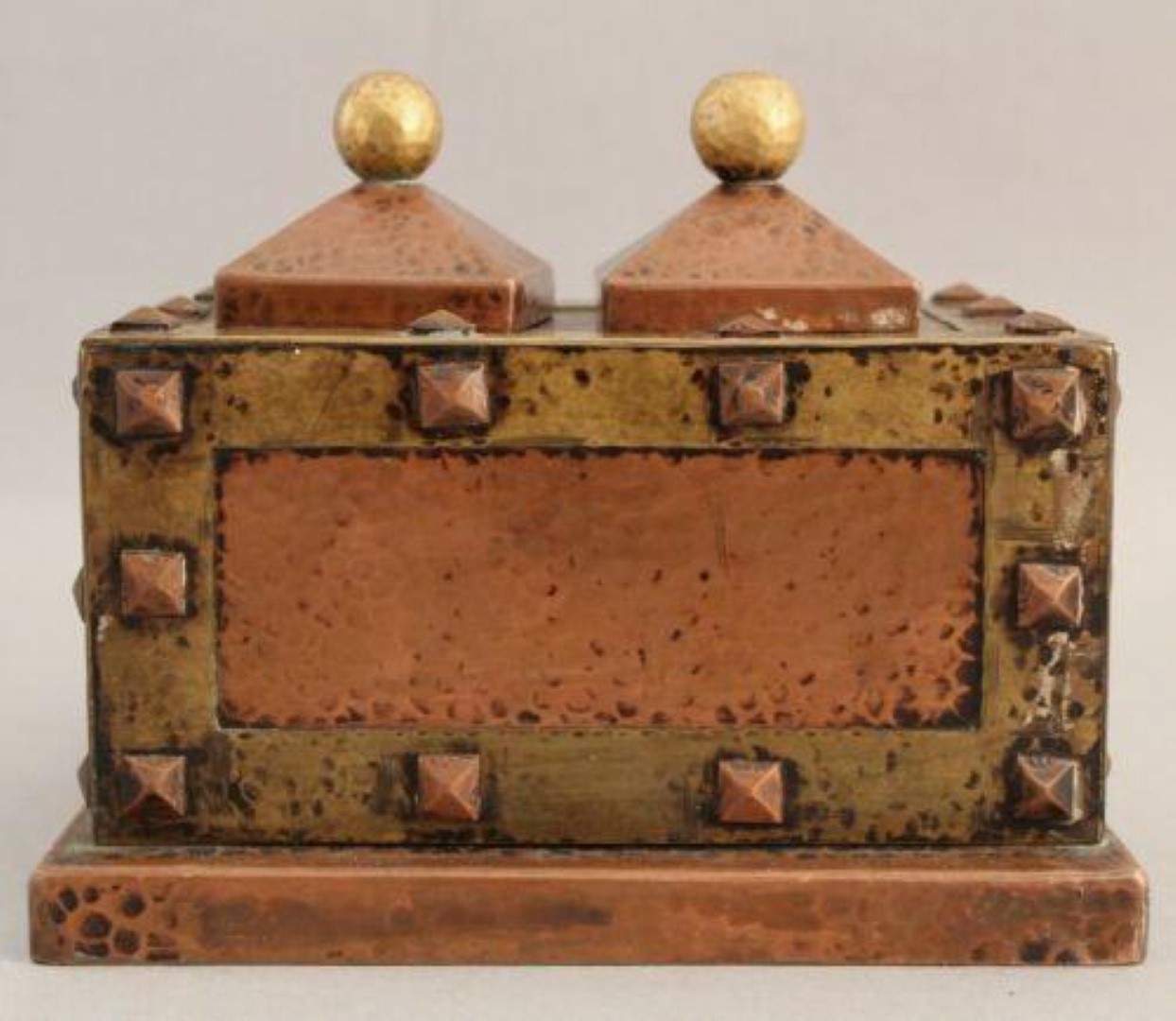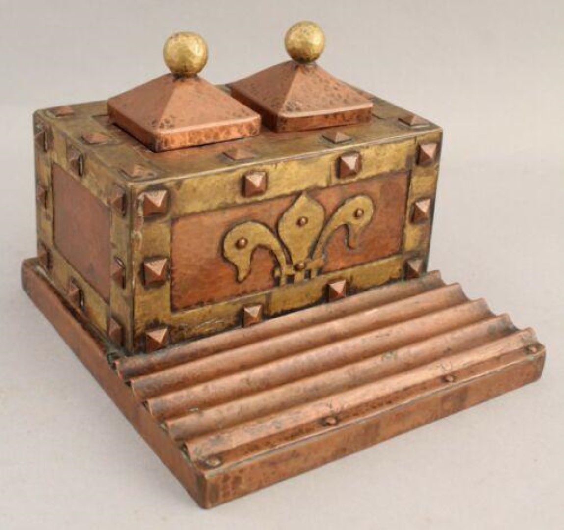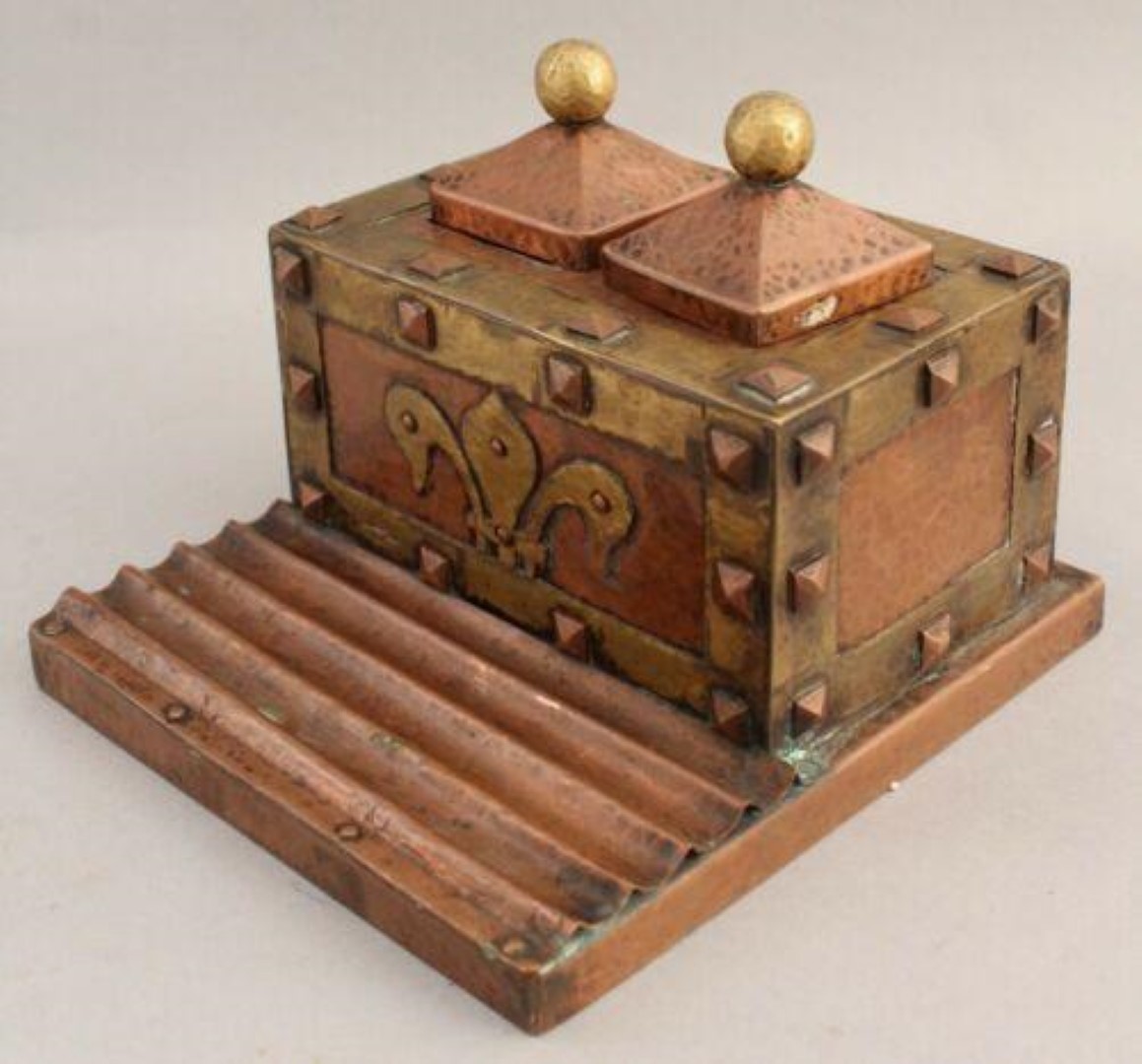 Large, hand-hammered brass and copper double inkstand with pen rest. On the front is a large Fleur-de-lis decoration. Two glass inkwells fit into a hammered copper holder, which is banded in brass and held in place with copper pyramid tacks. Covering the inkwells are two pyramid-shaped copper covers with brass ball finials.