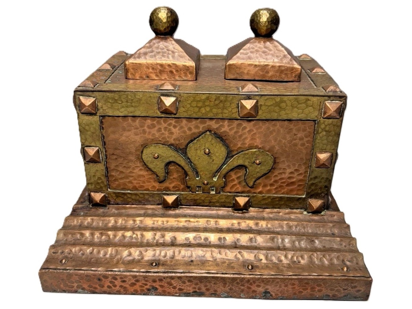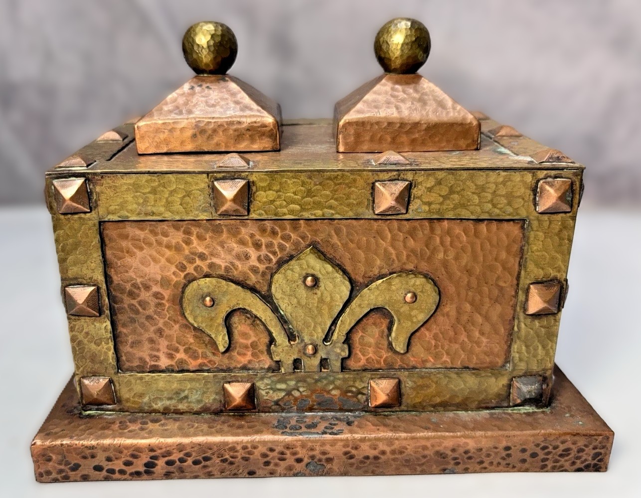 - Fleur-de-lis & Finials: The front is dominated by a large, applied brass fleur-de-lis, a popular motif in the early 20th century that added a touch of heraldic elegance to the rustic hammered finish. The pyramid-shaped lids are topped with hammered brass ball finials.
