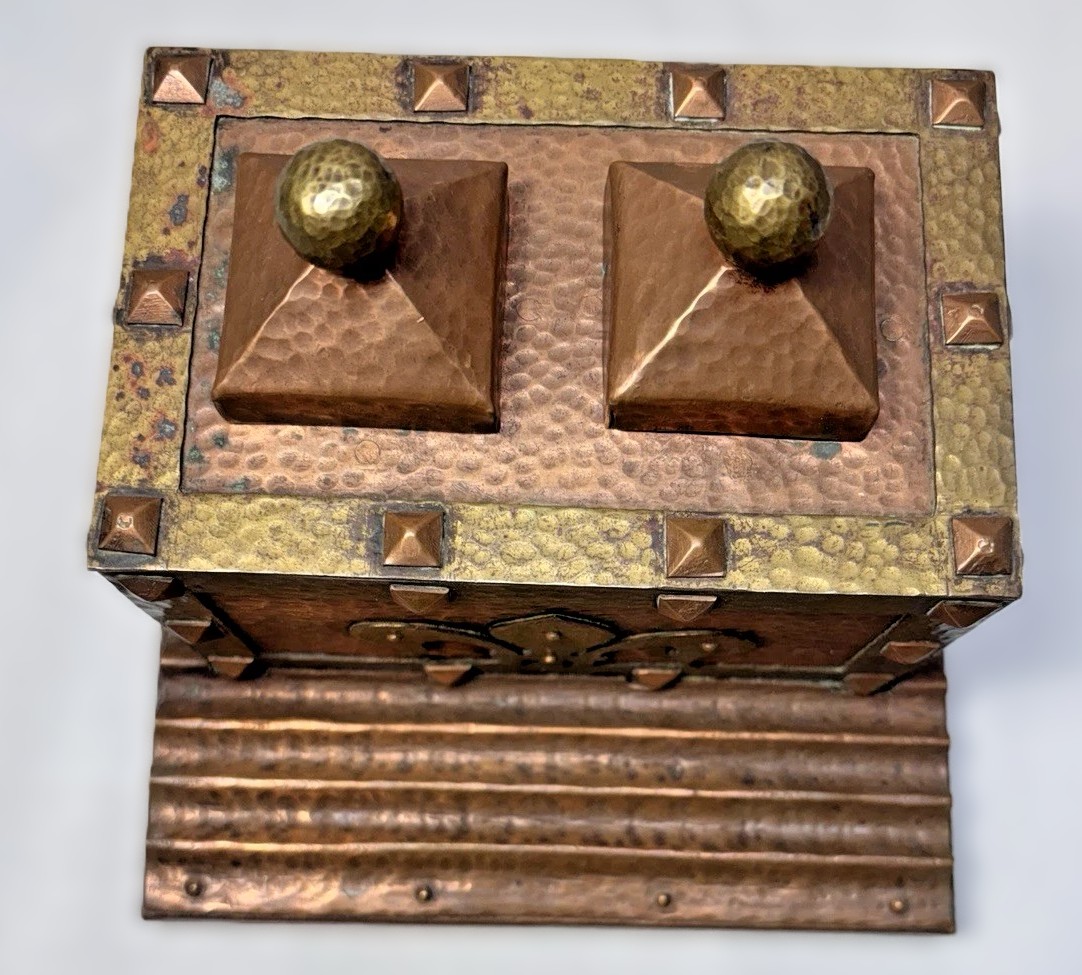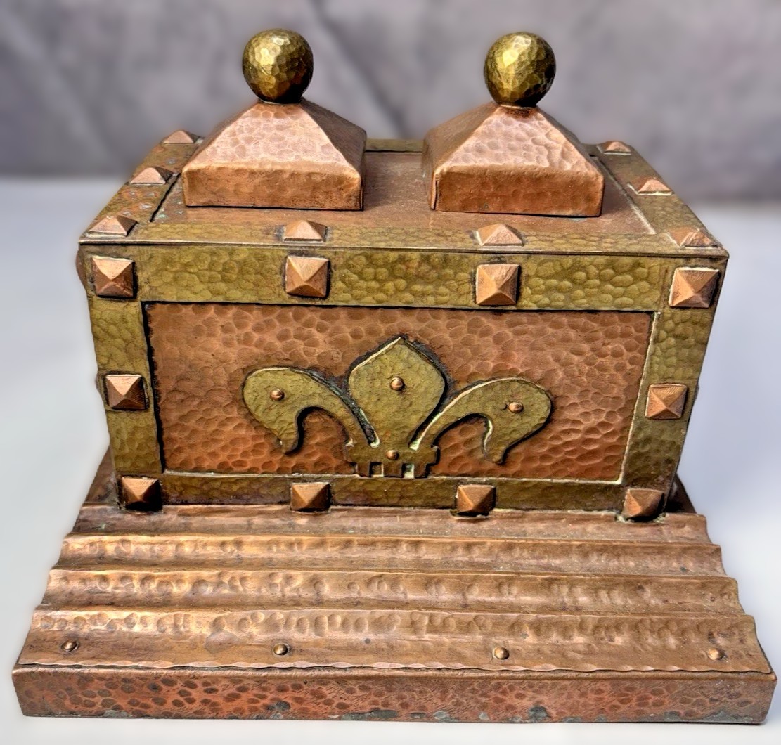 - Mixed Metal Design: The inkstand features a contrast between hand-hammered copper and brass. Benedict Art Studios was specifically known for this “mixed metal” aesthetic, often using brass for decorative banding, handles, and trim to accent a copper base.