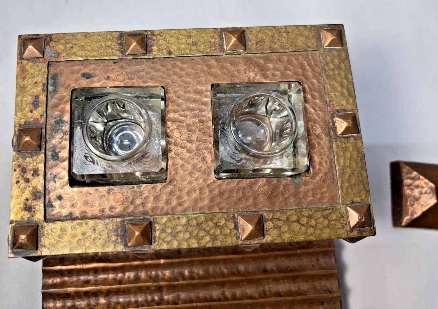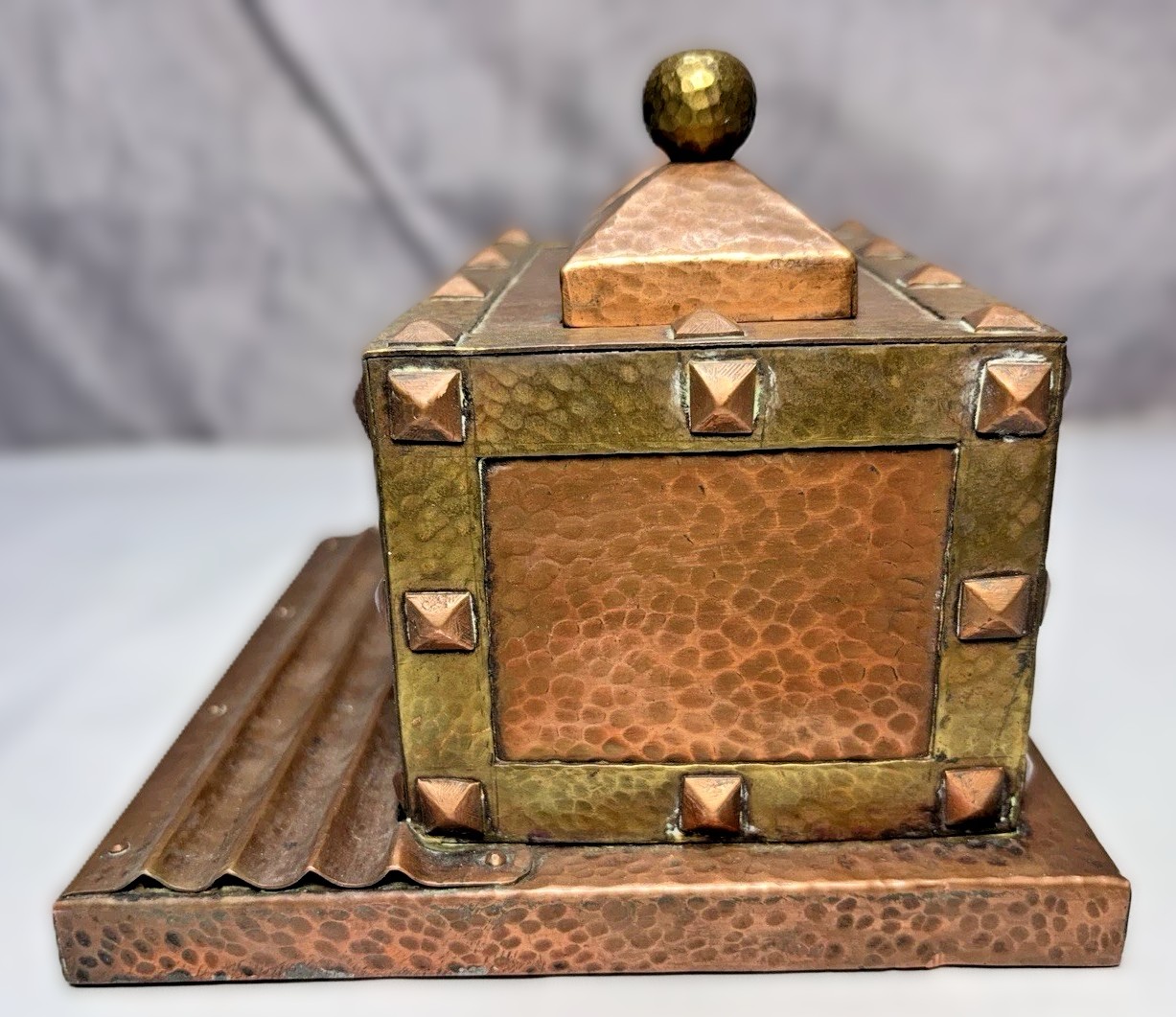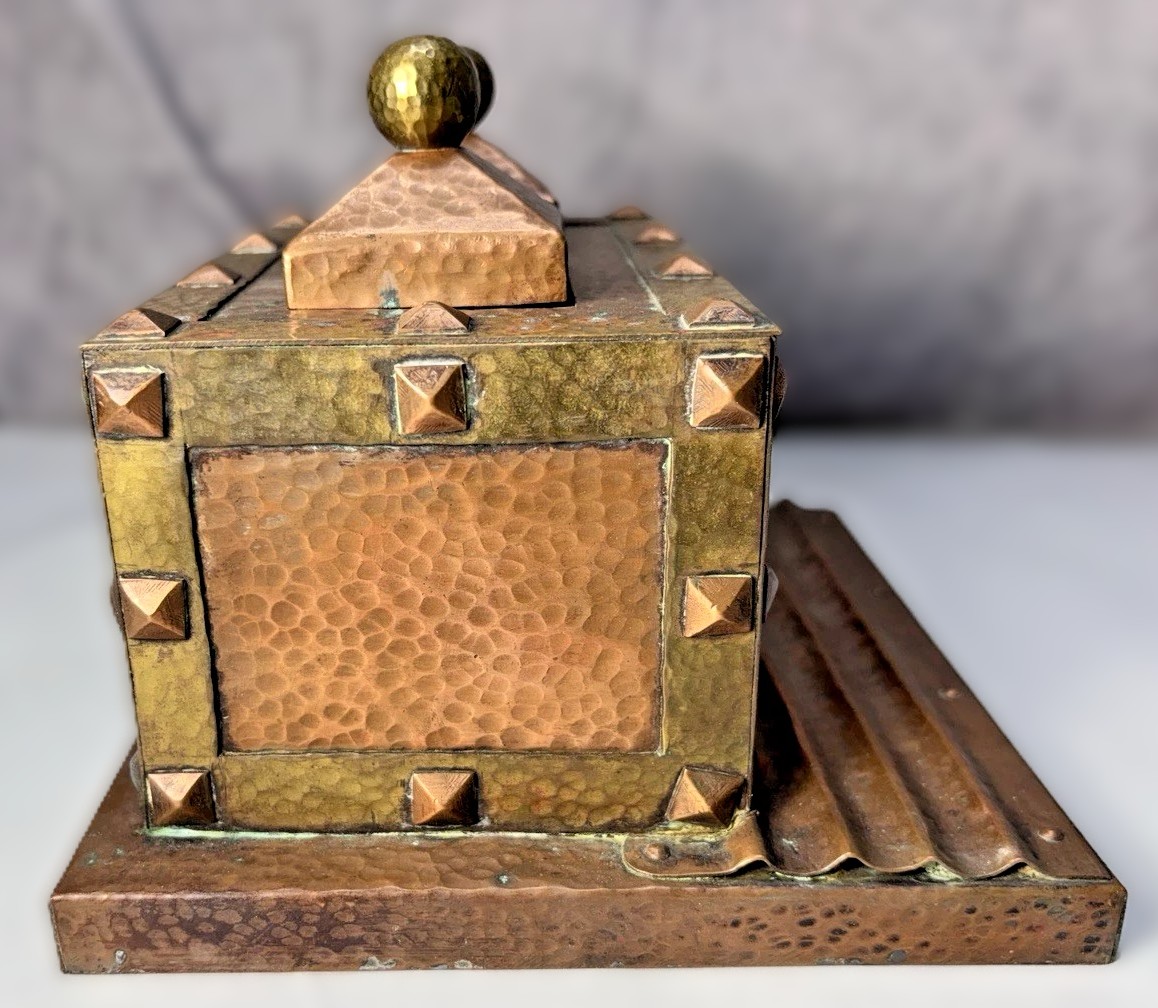 - Construction Details: The copper body is “banded” in brass and secured with prominent copper pyramid-head tacks (or rivets). The front features a tiered, ridged pen tray, which is integrated into the heavy copper base.