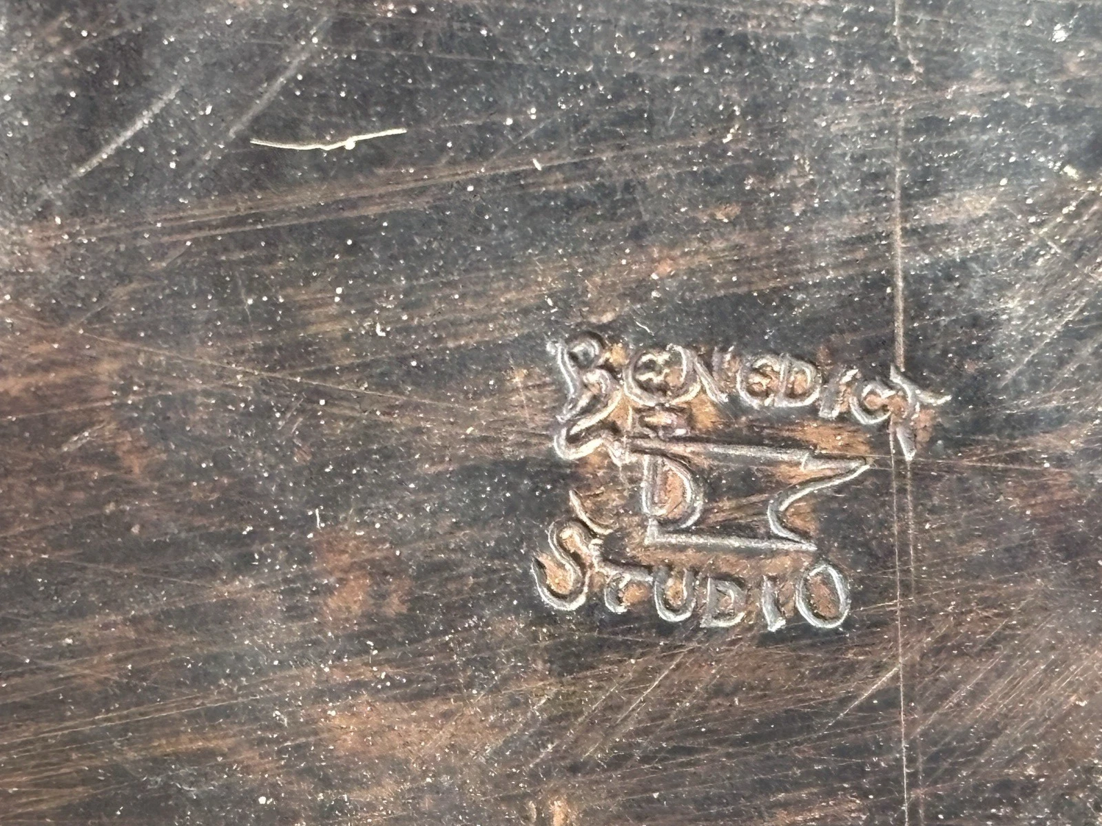 The mark on the underside – a hammer and anvil with the words “Benedict Studio” identifies this as a product of Benedict Art Studios of East Syracuse, New York.