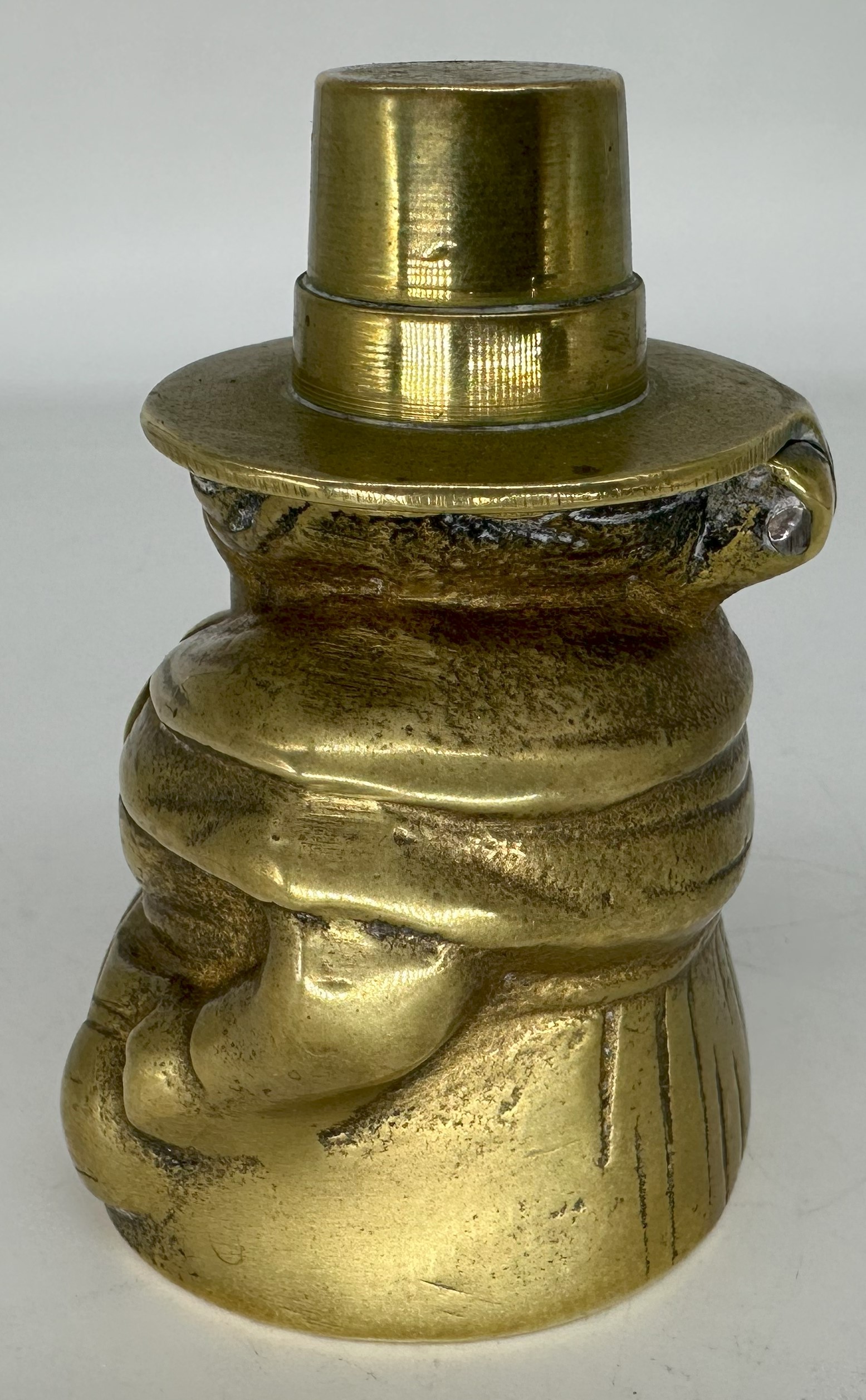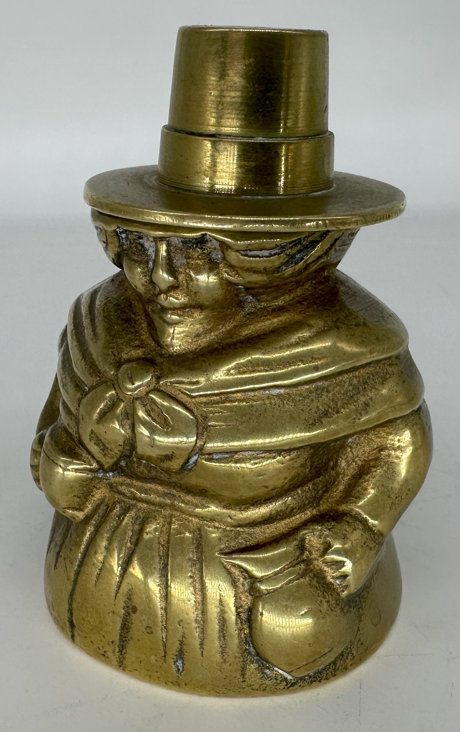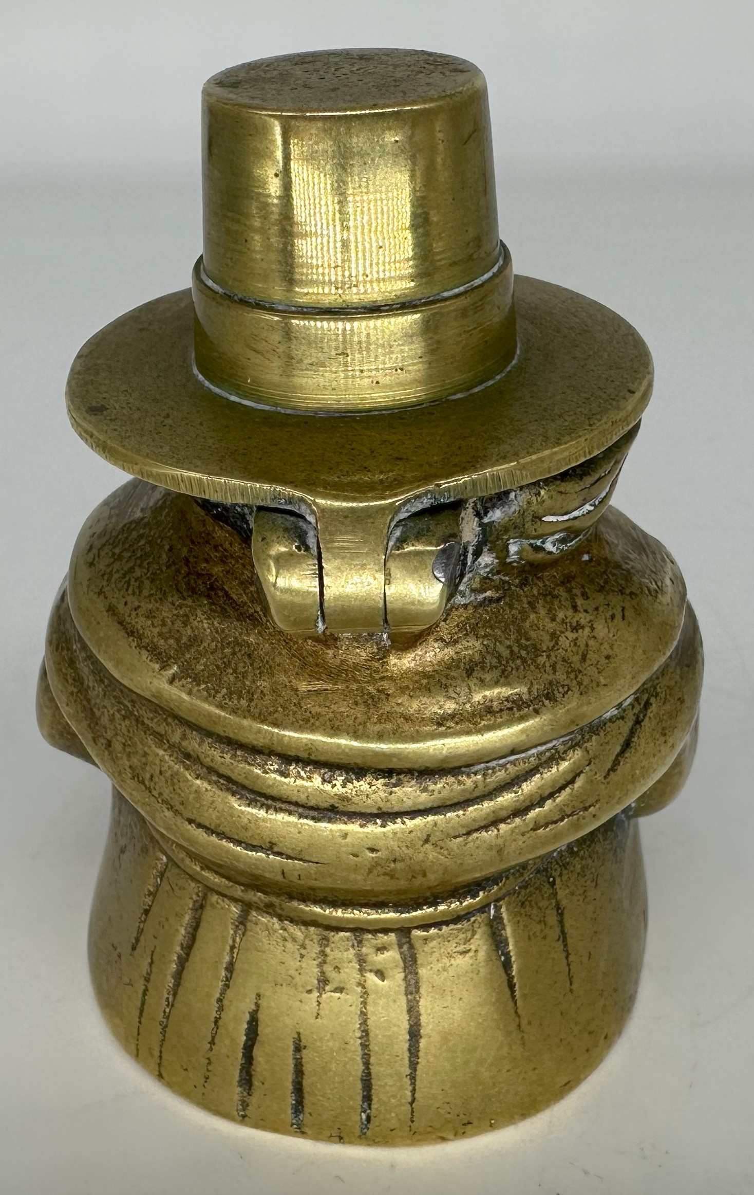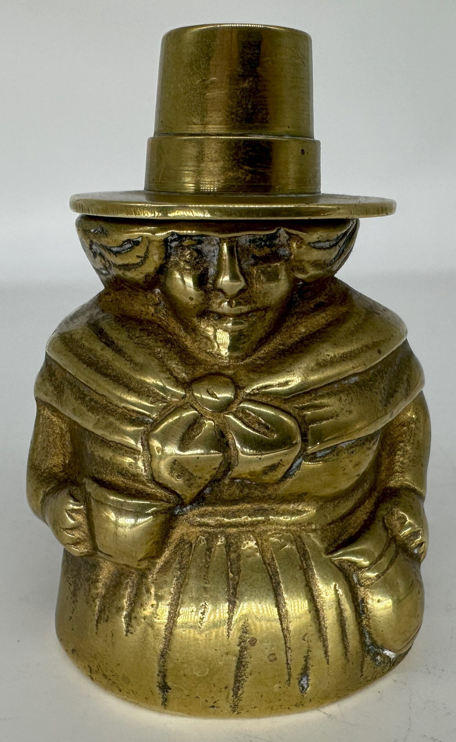 This figural brass inkwell is in the form of a woman wearing a traditional Welsh hat. The tall, stovepipe-style hat was an indispensable part of a woman’s national costume in Wales in the 19th century.