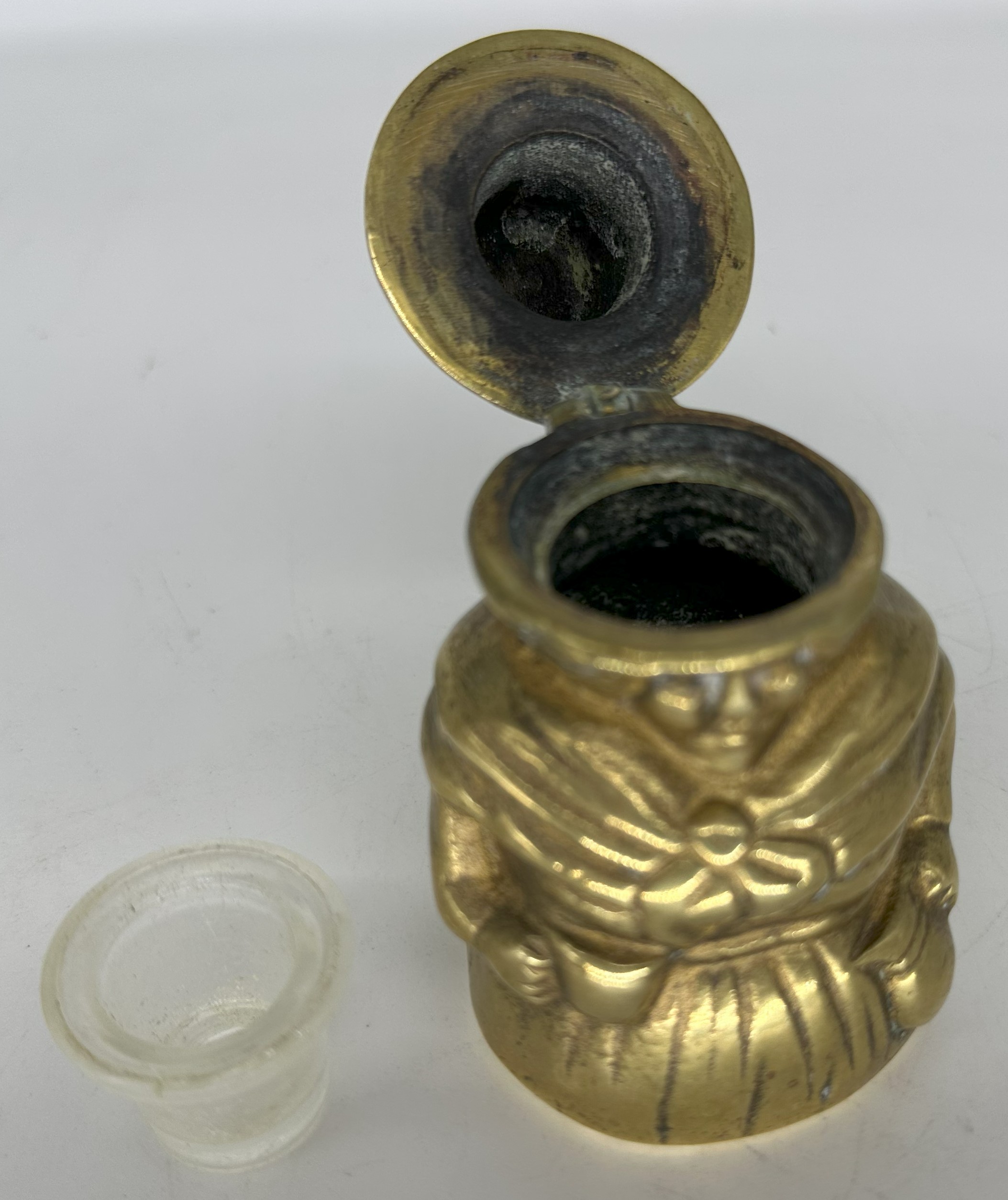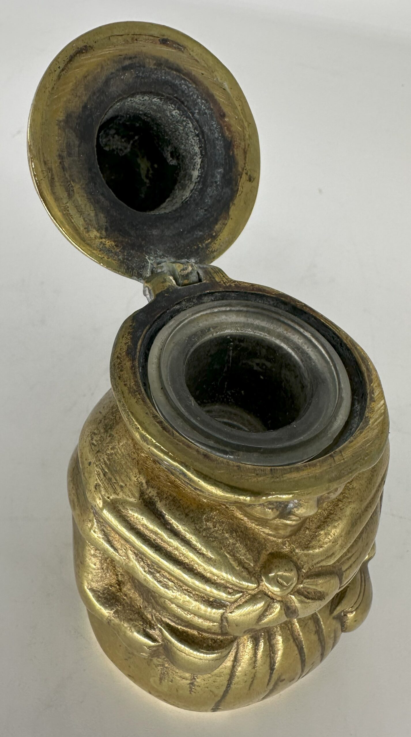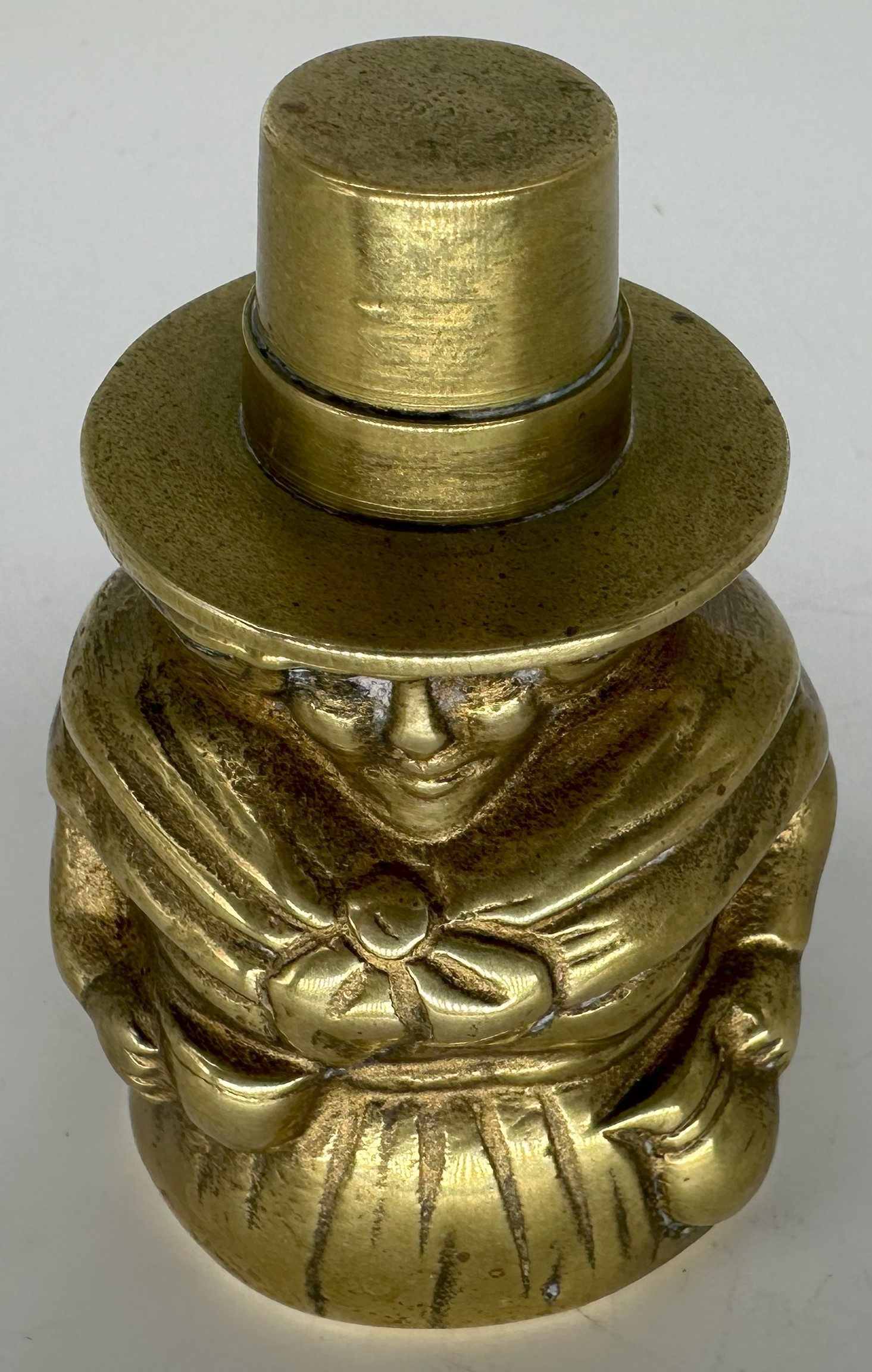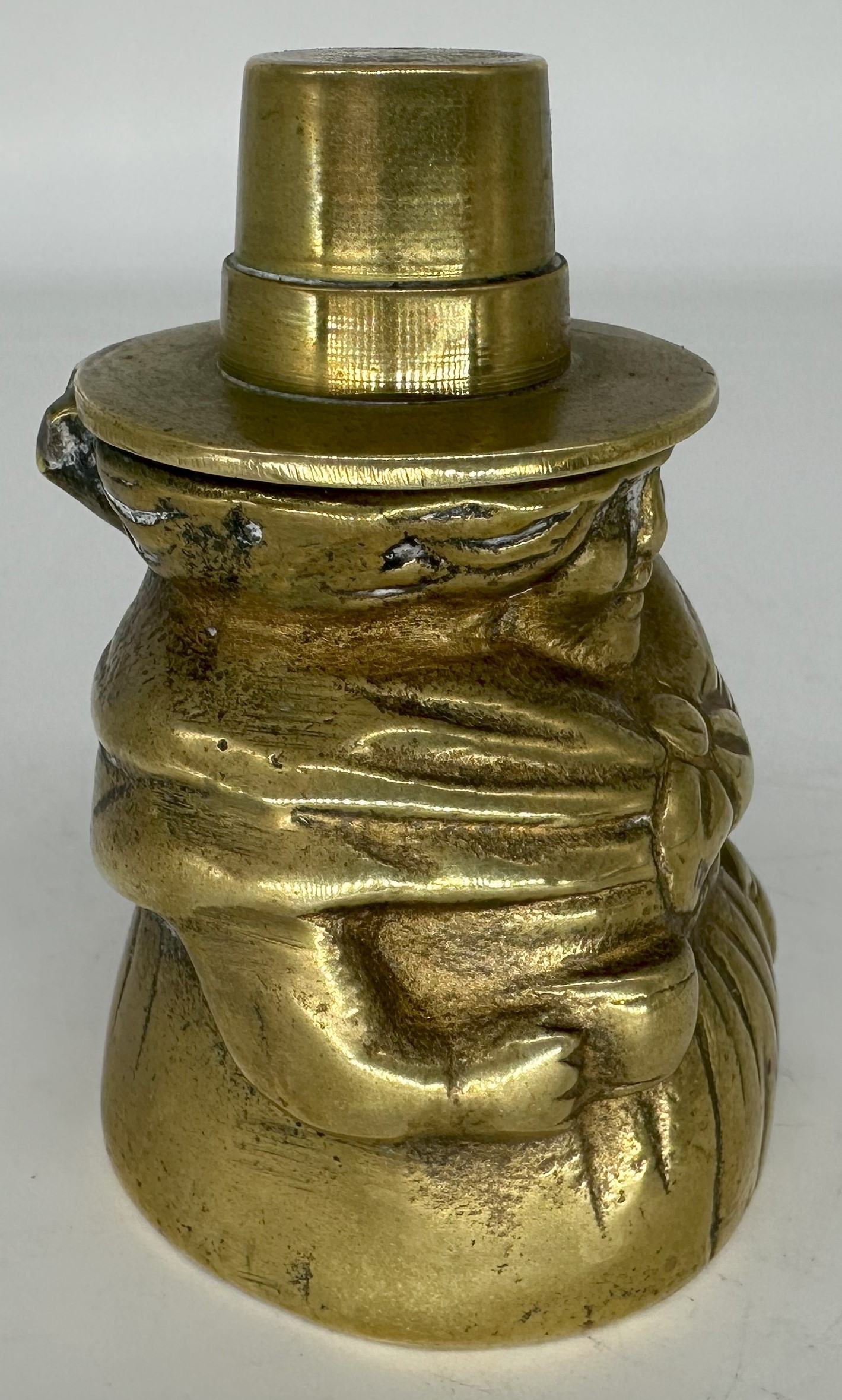 This figural brass inkwell is in the form of a woman wearing a traditional Welsh hat. The tall, stovepipe-style hat was an indispensable part of a woman’s national costume in Wales in the 19th century.